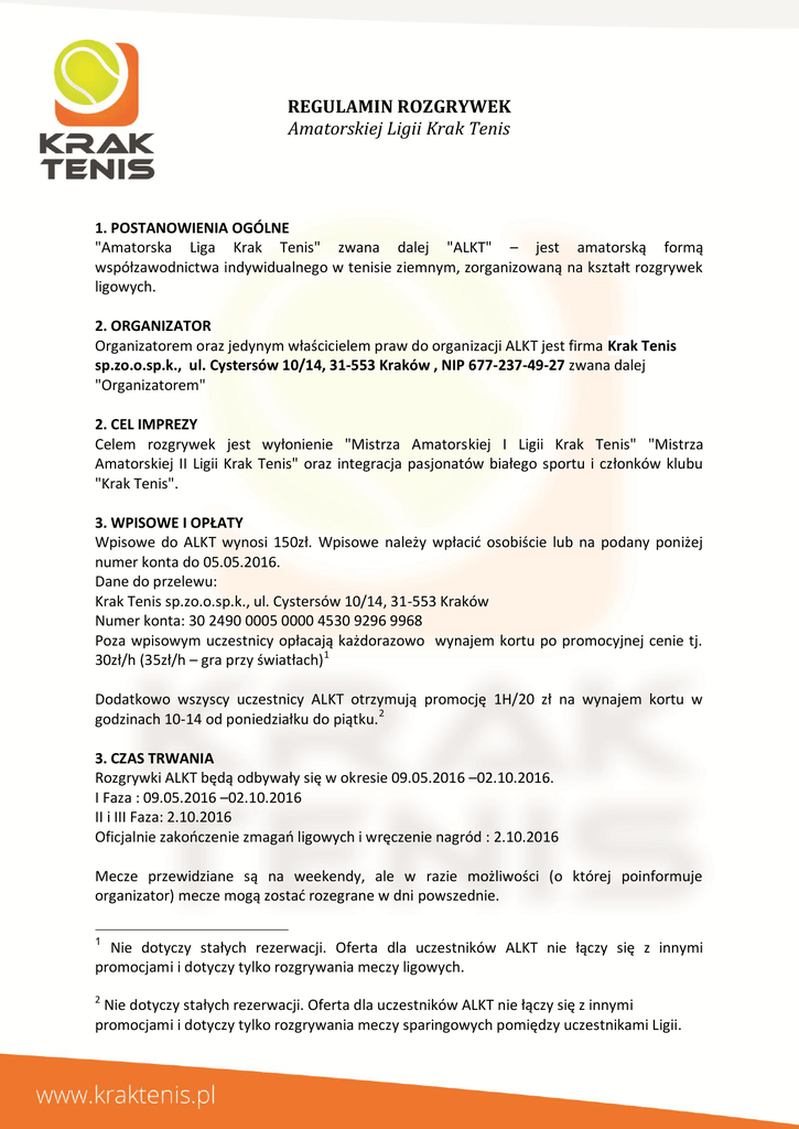 REGULAMIN ROZGRYWEK Amatorskiej Ligii Krak Tenis