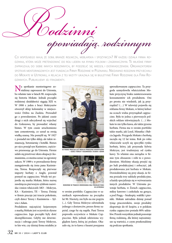 Rodzinni opowiadają rodzinnym CO WSPÓLNEGO MAJĄ ZE SOBĄ BRANŻE ROLNICZA , MEBLARSKA I SPOŻYWCZA ? W KAŻDEJ DZIAŁA FIRMA RO - DZINNA , KTÓRA MOŻE PRETENDOWAĆ DO ROLI LIDERA NA RYNKU POLSKIM I ZAGRANICZNYM . TE WŁAŚNIE FIRMY ZAPRASZAJĄ DO SIEBIE INNYCH RODZINNYCH , BY PODZIELIĆ SIĘ WIEDZĄ I DOŚWIADCZENIEM . O RGANIZATOREM SPOTKAŃ MENTORINGOWYCH JEST FUNDACJA FIRMY R ODZINNE W POZNANIU. N IEDAWNO RODZINNI PRZYJECHALI DO M OKATE W U STRONIU, A RELACJA Z TEJ WIZYTY UKAZAŁA SIĘ W BIULETYNIE FIRMY R ODZINNE DLA FIRM R O DZINNYCH . PUBLIKUJEMY JEJ FRAGMENTY. N a spotkanie mentoringowe zostaliśmy zaproszeni do Ustronia, bo właśnie tam w latach 90. rozpoczęła się historia Mokate. Jednak początki rodzinnej działalności sięgają XIX w. W 1900 r. jeden z braci Mokryszów otworzył sklep kolonialny w miejscowości Dobra na Zaolziu. Prowadził go z powodzeniem. Po jakimś czasie drugi z nich zdecydował się wyjechać do Goleszowa, by prowadzić własny biznes. W tym czasie uruchomiono tam cementownię, co uznał za swoją wielką szansę. Nie pomylił się. W 1927 r. posiadał nie tylko sklep, ale także restaurację, betoniarnię i hotelik. Biznes po ojcu przejął syn Kazimierz, częściowo przenosząc go do Ustronia. Firmie udało się przetrwać okres okupacji i komunizmu, co można uznać za ogromny sukces. W 1989 r. w prowadzenie �rmy zaangażowała się żona pana Kazimierza, Teresa. Rozpoczęły się pierwsze importy herbaty z Anglii, powstał pomysł na cappuccino. Wtedy też pojawiła się marka Mokate, która nazwę zawdzięcza pierwszym sylabom nazwiska i imion właścicieli: MO – Mokrysz, KA – Kazimierz, TE – Teresa. Dzisiaj w �rmie pracuje już trzecie pokolenie, czyli dzieci Teresy i Kazimierza – Sylwia i Adam. Produktem najczęściej kojarzonym z marką Mokate jest oczywiście słynne cappuccino. Jego początki były dość skomplikowane. Gdyby nie determinacja i odwaga pani Teresy Mokrysz, to kto wie, czy dzisiaj �rma miałaby je 32 NR 33 / 2014 • LADY’S CLUB W FIRMIE PRACUJE JUŻ TRZECIE POKOLENIE MOKRYSZÓW – DZIECI TERESY I KAZIMIERZA: SYLWIA I ADAM RODZINNI W TRAKCIE ZWIEDZANIA HALI PRODUKCYJNEJ W USTRONIU w swoim portfolio. Cappuccino w saszetkach wprowadzono na początku lat 90. Niestety, nie było na nie popytu (...). Gdy Teresa Mokrysz odwiedzała jednego z dostawców, prezes �rmy zapytał, czego by się napiła. Pani Teresa poprosiła oczywiście o Mokate Cappuccino. Była jednak zdziwiona wyglądem kawy, którą jej podano. Okazało się, że to kawa z fusami posypana sproszkowanym cappuccino. Ta przygoda uzmysłowiła właścicielom Mokate przyczynę braku zainteresowania konsumentów ich produktem. Oni po prostu nie wiedzieli, jak ją przyrządzić! (…) W telewizji pojawiła się reklama �rmy Mokate, w której kelner na oczach widza przyrządzał cappuccino. Była to jedna z pierwszych polskich reklam telewizyjnych. (…) Mokate to nie tylko kawa, ale także pyszna herbata. Firma ma w swoim portfolio takie marki, jak Loyd, Minutka i Babcia Jagoda. Przygoda Mokate z herbatą zaczęła się 12 lat temu. Rok po roku właściciele uczyli się specy�ki rynku herbaty, który, jak przyznała Sylwia Mokrysz, jest trudniejszy od rynku kawy. To właśnie ona zarządza w �rmie tym obszarem i robi to z powodzeniem. Mieliśmy okazję przejść się po hali produkcyjnej i zobaczyć, jak produkowana jest herbata w Mokate. Dowiedzieliśmy się przy okazji, że �rma posiada trzy zakłady produkcyjne, a każdy specjalizuje się w wytwarzaniu innych produktów. W Ustroniu powstaje herbata, w Żorach cappuccino, miksy kawowe i czekolada na gorąco, a pod Pragą – biszkopty, wafelki i pierniki. Mokate zatrudnia dzisiaj ponad tysiąc pracowników, swoje produkty eksportuje do 65 krajów, a w polskim rynku cappuccino posiada 80% udziałów. Przede wszystkim jednak pozostaje �rmą rodzinną, dla której najważniejsze są wartości, o czym przekonaliśmy się podczas spotkania. DOBRY ROK DLA EKSPORTU SZKLANKA KAWY MOKATE LATTE Na kilka tygodni przed końcem roku wiadomo już, że w grupie Mokate 2014 był kolejnym doskonałym rokiem dla eksportu. Jak stwierdził Adam Mokrysz z zarządu Mokate Sp. z o.o. w Żorach, przewagę na rynkach międzynarodowych �rma uzyskała dzięki wysokiej jakości produktów i innowacyjności. – Oferujemy wyroby na światowym poziomie, zarówno jeżeli chodzi o smak, jak i na przykład o wygląd opakowań. Skuteczny marketing, rozwinięta sieć sprzedaży i doświadczony personel pozwalają przekuć atuty produktów Mokate na ich wysoką sprzedaż i pozycję na rynkach zagranicznych – podkreślił dr Adam Mokrysz. – Co ważne, Mokate nie tylko wywozi swoje towary za granicę, ale również tworzy tam przedstawicielstwa, nawiązuje współpracę z miejscowymi �rmami, zatrudnia lokalny personel, czy nawet wchodzi na rynki poprzez przejęcia. Budujemy biznes w każdym kraju, w którym chcemy być obecni. W 2015 r. �rma duży nacisk położy na innowacje produktowe, takie jak kawiarniane Moje Inspiracje i herbaty Loyd w piramidkach. Swoje produkty Mokate eksportuje obecnie do ponad 65 krajów, a przychody z eksportu stanowią ponad 60%. HERBATY ARTYSTYCZNE Po sześciu latach nieobecności Magdalena Piekorz wróciła na duży ekran �lmem fabularnym „Zbliżenia”, nominowanym do nagrody Złotych Lwów. Wywiad z reżyserką opublikowaliśmy w Lady’s Club nr 31. Październikowa premiera „Zbliżeń” zgromadziła w warszawskiej Kinotece ponad tysiąc osób. Mokate i marka Loyd byli głównymi partnerami uroczystego pokazu. „Zbliżenia” to �lm o trudnej miłości, POCZĘSTUNEK MOKATE DLA UCZESTNIKÓW oparty o scenariusz napisany przez reżyserkę wspólnie z Wojciechem Kuczokiem. PREMIERY FILMOWEJ Bohaterkami są kobiety, które nie umieją żyć bez siebie. Role matki i córki grają Ewa Wiśniewska i Joanna Orleańska, główną rolę męską Łukasz Simlat. Akcja toczy się w Katow