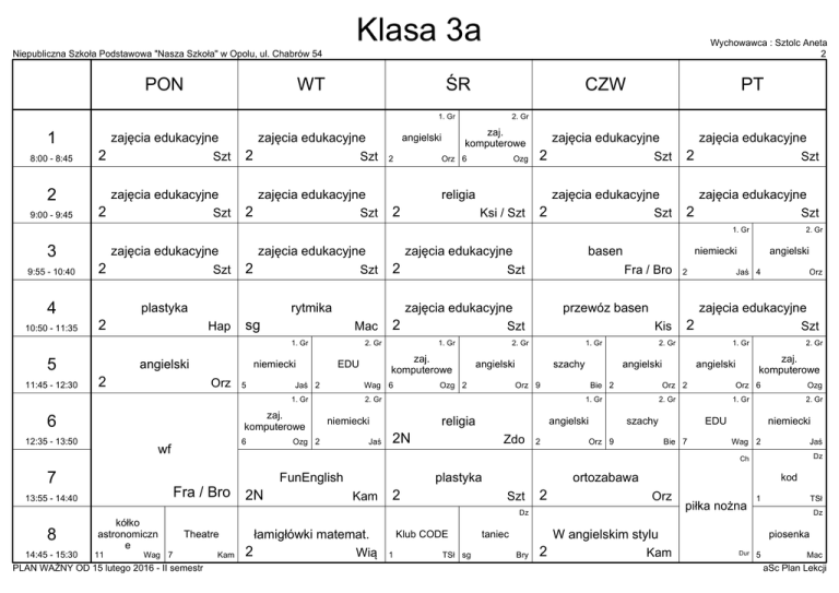 Klasa 3a Wychowawca : Sztolc Aneta 2 Niepubliczna Szkoła Podstawowa "Nasza Szkoła" w Opolu, ul. Chabrów 54 PON WT ŚR 1. Gr 1 8:00 - 8:45 2 9:00 - 9:45 zajęcia edukacyjne 2 Szt zajęcia edukacyjne 2 Szt zajęcia edukacyjne 2 Szt zajęcia edukacyjne 2 Szt 2 PT zajęcia edukacyjne 2 Szt zajęcia edukacyjne 2 Szt zajęcia edukacyjne 2 Szt zajęcia edukacyjne 2 Szt 2. Gr zaj. komputerowe angielski CZW Orz 6 Ozg religia 2 Ksi / Szt 1. Gr 3 zajęcia edukacyjne 2 Szt zajęcia edukacyjne 2 Szt basen 9:55 - 10:40 zajęcia edukacyjne 2 Szt 4 plastyka rytmika zajęcia edukacyjne 2 Szt przewóz basen 10:50 - 11:35 2 Hap sg Mac 1. Gr 5 11:45 - 12:30 angielski 2 niemiecki Orz 5 2. Gr Wag 6 1. Gr zaj. komputerowe 6 12:35 - 13:50 6 wf 7 zaj. komputerowe EDU Jaś 2 1. Gr Fra / Bro 2N szachy Ozg 2 Jaś religia angielski 2N Zdo 2 plastyka Kam Bie 2 2 8 14:45 - 15:30 11 Theatre Wag 7 PLAN WAŻNY OD 15 lutego 2016 - II semestr Kam łamigłówki matemat. 2 Wią Klub CODE 1 TSł sg 2. Gr zaj. komputerowe angielski Orz 6 2. Gr 2 taniec Bry Ozg 1. Gr szachy 2. Gr EDU Bie 7 niemiecki Wag 2 Jaś Ch Dz kod Orz Dz kółko astronomiczn e 1. Gr ortozabawa Szt Orz zajęcia edukacyjne 2 Szt Orz 2 Orz 9 angielski Jaś 4 2. Gr 1. Gr niemiecki 2 angielski Orz 9 2. Gr FunEnglish 13:55 - 14:40 Kis 1. Gr angielski Ozg 2 niemiecki Fra / Bro 2. Gr 2. Gr W angielskim stylu 2 Kam piłka nożna 1 TSł Dz piosenka Dur 5 Mac aSc Plan Lekcji