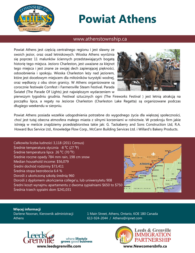 Powiat Athens www.athenstownship.ca Powiat Athens jest częścią centralnego regionu i jest sławny ze swoich jezior, oraz osad letniskowych. Wioska Athens wyróżnia się poprzez 11 malunków ściennych przedstawiających bogatą historię tego miejsca. Jezioro Charleston, jest uważane za klejnot tego miejsca i jest znane ze swojej dech zapierającej piękności, odosobnienia i spokoju. Wioska Charleston leży nad jeziorem, które jest docelowym miejscem dla miłośników turystyki wodnej, oraz wędkarzy z obu stron granicy. W Athens organizowane są corocznie festiwale Cornfest i Farmersville Steam Festival. Parada Świateł (The Parade Of Lights) jest największym wydarzeniem w pierwszym tygodniu grudnia. Festiwal sztucznych ogni (The Fireworks Festival ) jest letnią atrakcją na początku lipca, a regaty na Jeziorze Charleston (Charleston Lake Regatta) są organizowane podczas długiego weekendu w sierpniu. Powiat Athens posiada wszelkie udogodnienia potrzebne do wygodnego życia dla większej społeczności, choć jest tutaj obecna atmosfera małego miasta z silnymi korzeniami w rolnictwie. W przekroju firm jakie istnieją w meiście znajdziemy przedsiębiorstwa takie jak: G. Tackaberry and Sons Construction Ltd, R.A. Howard Bus Service Ltd., Knowledge Flow Corp., McCann Building Services Ltd. i Willard's Bakery Products. Całkowita liczba ludności 3,118 (2011 Census) Średnie temperatura stycznia -8 ⁰C (27 ⁰F) Średnie temperatura lipca 26 ⁰C (70 ⁰F) Średnie roczne opady 784 mm rain, 198 cm snow Median household income: $56,079 Średni dochód rodzinny $73,411 Średnia stopa bezrobocia 6.4 % Dorośli z ukończoną szkołą średnią 960 Dorośli z dyplomem ukończenia college’u, lub uniwersytetu 908 Średni koszt wynajmu apartamentu z dwoma sypialniami $650 to $750 Średnia trzech sypialni dom $241,031 Więcej informacji Darlene Noonan, Kierownik administracji Athens www.leedsgrenville.com 1 Main Street, Athens, Ontario, KOE 1B0 Canada 613-924-2044 / [email protected] www.NewcomersInfo.ca