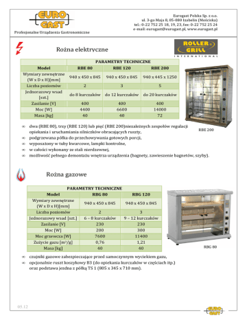 Eurogast Polska Sp. z o.o. ul. 3-go Maja 8, 05-080 Izabelin (Mościska) tel.: 0-22 752 25 18, 19, 23, fax: 0-22 752 25 24 e-mail: [email protected], www.eurogast.pl Profesjonalne Urządzenia Gastronomiczne Rożna elektryczne PARAMETRY TECHNICZNE Model Wymiary zewnętrzne (W x D x H)[mm] Liczba poziomów Jednorazowy wsad [szt.] Zasilanie [V] Moc [W] Masa [kg] • • • • • RBE 80 RBE 120 RBE 200 940 x 450 x 845 940 x 450 x 845 940 x 445 x 1250 2 3 5 do 8 kurczaków do 12 kurczaków do 20 kurczaków 400 4400 40 400 6600 40 400 14000 72 dwa (RBE 80), trzy (RBE 120) lub pięć (RBE 200)niezależnych zespołów regulacji RBE 200 opiekania i uruchamiania silniczków obracających ruszty, podgrzewana półka do przechowywania gotowych porcji, wyposażony w tuby kwarcowe, lampki kontrolne, w całości wykonany ze stali nierdzewnej, możliwość pełnego demontażu wnętrza urządzenia (bagnety, zawieszenie bagnetów, szyby). Rożna gazowe PARAMETRY TECHNICZNE Model RBG 80 RBG 120 Wymiary zewnętrzne 940 x 450 x 845 940 x 450 x 845 (W x D x H)[mm] Liczba poziomów 2 3 Jednorazowy wsad [szt.] 6 – 8 kurczaków 9 – 12 kurczaków Zasilanie [V] 230 230 Moc [W] 200 300 Moc grzewcza [W] 7600 11400 3 Zużycie gazu [m /g] 0,76 1,21 Masa [kg] 40 40 • • 05.12 czujniki gazowe zabezpieczające przed samoczynnym wyciekiem gazu, opcjonalnie ruszt koszykowy B3 (do opiekania kurczaków w częściach itp.) oraz podstawa jezdna z półką TS 1 (805 x 345 x 710 mm). RBG 80