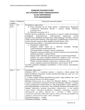 Konkursy w województwie podkarpackim w roku szkolnym 2015/2016 KONKURS POLONISTYCZNY DLA UCZNIÓW SZKÓŁ GIMNAZJALNYCH KLUCZ ODPOWIEDZI ETAP WOJEWÓDZKI Numer Punktacja Zasady przyznawania punktu zadania Zad. 1. 0-6 Przykładowe odpowiedzi: (0-6) a) Poeta odwołuje się do sztuki antyku i średniowiecza. Wspomina o malarstwie Hieronima Boscha i retoryce Marka Tulliusza Cycerona. (0-1) b) Zjawisko nowomowy (0-1) Podmiot liryczny podkreśla, że nowomowa to typowy model komunikacji propagandy komunistycznej. Jednoznacznie negatywnie ocenia prymitywność dialektyki/wnioskowania sankcjonującego zbrodnie. Zarzuca władzy powtarzanie banałów, brak logicznego i pogłębionego rozumowania. Zwraca również uwagę na błędy składniowe/stylistyczne. (0-2) Jeden punkt przyznajemy w przypadku pobieżnej odpowiedzi. c) Przykładowe odpowiedzi: Kategoria smaku wiąże się z odmową, niezgodą, odwagą, wypowiedzeniem posłuszeństwa złu. Jest bezpośrednio związana z duszą i sumieniem. Kategoria estetyczna piękna jest również kategorią etyczną/moralną, zapisaną chociażby w pojęciu dobra. Pojęcie smaku odwołuje się także do pojęcia rozumu/racjonalizmu. Estetyka ma często charakter praktyczny; upiększa życie, czyni go bardziej subtelnym/komfortowym/wytwornym/twórczym. Wybór wierności ideałom estetycznym, wierności sztuce, powoduje często wygnanie/ostracyzm/odrzucenie a nawet śmierć. (0-2) Za każdy argument znajdujący uzasadnienie w treści wiersza przyznajemy jeden punkt. Zad. 2. 0-2 Przykłady odpowiedzi: Definicja (SJP): „1. wyrażenie złożone z wyrazów o takim samym lub bardzo podobnym znaczeniu, zwykle oceniane jako błąd, np. cofać się w tył; pleonazm, tautologizm; 2. w logice: zdanie, którego prawdziwość wynika z jego struktury, np.: jutro będzie pogoda lub jutro nie będzie pogody”. Definicja (Polszczyzna na co dzień red. Mirosław Bańko): „To połącznie wyrazów znaczeniowo tożsamych lub taka konstrukcja zdaniowa, w której człony gramatycznie niepowiązane ze sobą bezpośrednio, często oddalone, powielają dokładnie tę samą treść. Oto przykłady błędnych konstrukcji tego rodzaju: bilateralne stosunki dwustronne; jednocześnie, w tym samym czasie; klimat i atmosfera (spotkania); nielegalny i niezgodny z prawem; ostentacyjnie, na pokaz; podwoić się i wzrosnąć o 100%; twórczy i kreatywny (człowiek); tylko same (zalety); wbrew pozorom, jak mogłoby się wydawać; wiele licznych (wad); z kolei, następnie. Wyjaśnienie pojęcia – 1 punkt Wskazanie przykładu – 1 punkt Strona 1 z 3 Konkursy w województwie podkarpackim w roku szkolnym 2015/2016 Zad. 3. 0-2 Zad. 4. 0-4 a) (0-2) b) (0-2) Zad. 5. 0-4 (0-1) (0-1) (0-1) (0-1) Zad. 6. Zad. 7. 0-1 0-2 Zad. 8. 0-2 Zad.9. 0-2 Przykładowe odpowiedzi: Pieśń dotyczy tajemnicy i siły pożądania erotycznego związku mężczyzny i kobiety. Dosłownie i analogicznie taką samą tajemnicą i siłą pożądania może charakteryzować się związek człowieka z Bogiem (przykład wielkich mistyków). Poemat biblijny charakteryzuje: miłość, tęsknota, wierność, namiętność, erotyczna fascynacja, pragnienie bycia razem do końca życia/po wieczność, dojrzewanie i spełnienie, ludzką zmysłowość, trwałość/nierozerwalność związku, godność kochanków. Na wzór potęgi, prawdziwości i nieprzemijalności tych uczuć, których przecież można doświadczyć w życiu, miałby się kształtować stosunek człowieka do Boga. Uwaga: Odpowiedzi mogą być bardzo subiektywne, punktujemy sformułowania logiczne i znajdujące uzasadnienie w treści biblijnego poematu. fałsz prawda prawda prawda prawda prawda Jeden błąd – 1 punkt Dwa błędy – 0 punktów Odpowiedzi mogą być bardzo subiektywne, jednak powinny znajdować uzasadnienie w treści lektury. Jeden punkt przyznajemy w przypadkach pobieżnej odpowiedzi bądź mniejszej liczby zdań. Proponowane odpowiedzi a) Uważna kontemplacja przyrody; piękno; dramatyczne i piękne konsekwencje życia…; człowiek wobec przyrody; b) Wyliczenie opóźnia pojawienie się refleksji; wzmacnia efekt bezinteresownego zachwytu pięknem przyrody; prezentuje kolejność poetyckiego spojrzenia, przypominającego uważne obserwacje badacza fauny i flory. c) Przyroda to doskonały mechanizm, żywy organizm, ekosystem. d) Uwaga: Sądy mogą być bardzo subiektywne; poprawne sformułowanie dwóch zdań złożonych powoduje przyznanie punktu. Odpowiedź a 1a 2b 3c 4d 5e 6f 7g 8h 9i 10j Bezbłędnie – 2 punkty Jeden błąd – 1punkt Proponowana odpowiedź Myśl grecka (tradycja „klasyczna”) uznawała, że piękno tożsame jest z prawdą, ponieważ to prawda tworzyła w pewien sposób piękno; natomiast dla romantyków piękno rodzi prawdę, jest jej stwórcą. Przedstawienie klasycznego sposobu ujęcia – 1 punkt Przedstawienie romantycznego sposobu ujęcia – 1 punkt Odpowiedzi: c – 1 punkt a – 1 punkt Strona 2 z 3 Konkursy w województwie podkarpackim w roku szkolnym 2015/2016 Zad. 10 0-25 Kryteria oceny i punktacja I Nadanie stosownego tytułu (0-1) II Realizacja tematu (0-13) a) Prezentacja refleksji wynikających z lektury tekstu Karola Wojtyły 0-3 b) Odwołanie się do kontekstu obrazów Adama Patrzyka 0-3 c) Odwołanie się do kontekstu filmu Kolory raju 0-3 d) Odwołanie się do refleksji Henryka Elzenberga 0-1 e) Formułowanie sądów, wniosków, przemyśleń 0-3 III Koncept na tekst eseistyczny (0-4) a) oryginalność formy 0-1 b) subiektywizm (pryzmat własnych uczuć, skojarzeń) 0-1 c) podjęcie próby sprowokowania czytelnika do wysiłku intelektualnego 0-1 d) sztuka zadawania pytań bądź solilokwium 0-1 Kompozycja (0-2) Trójdzielność lub inna przemyślana kompozycja z właściwym układem graficznym (akapity) 0-1 Spójność i logika tekstu 0-1 Język i styl (0-3) W pracy poprawnie stosowane jest słownictwo (pod względem znaczeniowym, frazeologicznym, fleksyjnym, słowotwórczym). Praca jest poprawna pod wzgl
