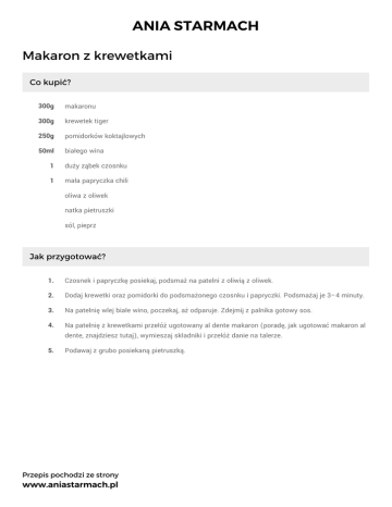 ANIA STARMACH Makaron z krewetkami Co kupić? 300g makaronu 300g krewetek tiger 250g pomidorków koktajlowych 50ml białego wina 1 duży ząbek czosnku 1 mała papryczka chili oliwa z oliwek natka pietruszki sól, pieprz Jak przygotować? 1. Czosnek i papryczkę posiekaj, podsmaż na patelni z oliwią z oliwek. 2. Dodaj krewetki oraz pomidorki do podsmażonego czosnku i papryczki. Podsmażaj je 3–4 minuty. 3. Na patelnię wlej białe wino, poczekaj, aż odparuje. Zdejmij z palnika gotowy sos. 4. Na patelnię z krewetkami przełóż ugotowany al dente makaron (poradę, jak ugotować makaron al dente, znajdziesz tutaj), wymieszaj składniki i przełóż danie na talerze. 5. Podawaj z grubo posiekaną pietruszką. Przepis pochodzi ze strony www.aniastarmach.pl