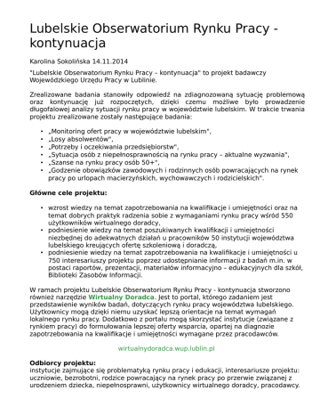 Lubelskie Obserwatorium Rynku Pracy kontynuacja Karolina Sokolińska 14.11.2014 "Lubelskie Obserwatorium Rynku Pracy – kontynuacja" to projekt badawczy Wojewódzkiego Urzędu Pracy w Lublinie. Zrealizowane badania stanowiły odpowiedź na zdiagnozowaną sytuację problemową oraz kontynuację już rozpoczętych, dzięki czemu możliwe było prowadzenie długofalowej analizy sytuacji rynku pracy w województwie lubelskim. W trakcie trwania projektu zrealizowane zostały następujące badania: • • • • • • „Monitoring ofert pracy w województwie lubelskim", „Losy absolwentów", „Potrzeby i oczekiwania przedsiębiorstw", „Sytuacja osób z niepełnosprawnością na rynku pracy – aktualne wyzwania", „Szanse na rynku pracy osób 50+", „Godzenie obowiązków zawodowych i rodzinnych osób powracających na rynek pracy po urlopach macierzyńskich, wychowawczych i rodzicielskich". Główne cele projektu: • wzrost wiedzy na temat zapotrzebowania na kwalifikacje i umiejętności oraz na temat dobrych praktyk radzenia sobie z wymaganiami rynku pracy wśród 550 użytkowników wirtualnego doradcy, • podniesienie wiedzy na temat poszukiwanych kwalifikacji i umiejętności niezbędnej do adekwatnych działań u pracowników 50 instytucji województwa lubelskiego kreujących ofertę szkoleniową i doradczą, • podniesienie wiedzy na temat zapotrzebowania na kwalifikacje i umiejętności u 750 interesariuszy projektu poprzez udostępnianie informacji z badań m.in. w postaci raportów, prezentacji, materiałów informacyjno – edukacyjnych dla szkół, Biblioteki Zasobów Informacji. W ramach projektu Lubelskie Obserwatorium Rynku Pracy - kontynuacja stworzono również narzędzie Wirtualny Doradca. Jest to portal, którego zadaniem jest przedstawienie wyników badań, dotyczących rynku pracy województwa lubelskiego. Użytkownicy mogą dzięki niemu uzyskać lepszą orientacje na temat wymagań lokalnego rynku pracy. Dodatkowo z portalu mogą skorzystać instytucje (związane z rynkiem pracy) do formułowania lepszej oferty wsparcia, opartej na diagnozie zapotrzebowania na kwalifikacje i umiejętności wymagane przez pracodawców. wirtualnydoradca.wup.lublin.pl Odbiorcy projektu: instytucje zajmujące się problematyką rynku pracy i edukacji, interesariusze projektu: uczniowie, bezrobotni, rodzice powracający na rynek pracy po przerwie związanej z urodzeniem dziecka, niepełnosprawni, użytkownicy wirtualnego doradcy, pracodawcy. Okres realizacji projektu: wrzesień 2013 r. – lipiec 2015 r. Źródło finansowania projektu: Projekt systemowy „Lubelskie Obserwatorium Rynku Pracy - kontynuacja" realizowany był w ramach Priorytetu VI. Rynek pracy otwarty dla wszystkich, Działania 6.1 Poprawa dostępu do zatrudnienia oraz wspieranie aktywności zawodowej w regionie, Poddziałania 6.1.2 Wsparcie powiatowych i wojewódzkich urzędów pracy w realizacji zadań na rzecz aktywizacji zawodowej osób bezrobotnych w regionie. Projekt w mediach: Program "Puls rynku pracy" (5 odcinków)