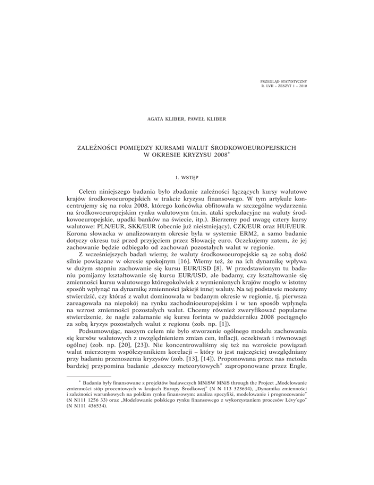 PRZEGLĄD STATYSTYCZNY R. LVII – ZESZYT 1 – 2010 AGATA KLIBER, PAWEŁ KLIBER ZALEŻNOŚCI POMIĘDZY KURSAMI WALUT ŚRODKOWOEUROPEJSKICH W OKRESIE KRYZYSU 2008* 1. WSTĘP Celem niniejszego badania było zbadanie zależności łączących kursy walutowe krajów środkowoeuropejskich w trakcie kryzysu finansowego. W tym artykule koncentrujemy się na roku 2008, którego końcówka obfitowała w szczególne wydarzenia na środkowoeuropejskim rynku walutowym (m.in. ataki spekulacyjne na waluty środkowoeuropejskie, upadki banków na świecie, itp.). Bierzemy pod uwagę cztery kursy walutowe: PLN/EUR, SKK/EUR (obecnie już nieistniejący), CZK/EUR oraz HUF/EUR. Korona słowacka w analizowanym okresie była w systemie ERM2, a samo badanie dotyczy okresu tuż przed przyjęciem przez Słowację euro. Oczekujemy zatem, że jej zachowanie będzie odbiegało od zachowań pozostałych walut w regionie. Z wcześniejszych badań wiemy, że waluty środkowoeuropejskie są ze sobą dość silnie powiązane w okresie spokojnym [16]. Wiemy też, że na ich dynamikę wpływa w dużym stopniu zachowanie się kursu EUR/USD [8]. W przedstawionym tu badaniu pomijamy kształtowanie się kursu EUR/USD, ale badamy, czy kształtowanie się zmienności kursu walutowego któregokolwiek z wymienionych krajów mogło w istotny sposób wpłynąć na dynamikę zmienności jakiejś innej waluty. Na tej podstawie możemy stwierdzić, czy któraś z walut dominowała w badanym okresie w regionie, tj. pierwsza zareagowała na niepokój na rynku zachodnioeuropejskim i w ten sposób wpłynęła na wzrost zmienności pozostałych walut. Chcemy również zweryfikować popularne stwierdzenie, że nagłe załamanie się kursu forinta w październiku 2008 pociągnęło za sobą kryzys pozostałych walut z regionu (zob. np. [1]). Podsumowując, naszym celem nie było stworzenie ogólnego modelu zachowania się kursów walutowych z uwzględnieniem zmian cen, inflacji, oczekiwań i równowagi ogólnej (zob. np. [20], [23]). Nie koncentrowaliśmy się też na wzroście powiązań walut mierzonym współczynnikiem korelacji – który to jest najczęściej uwzględniany przy badaniu przenoszenia kryzysów (zob. [13], [14]). Proponowana przez nas metoda bardziej przypomina badanie „deszczy meteorytowych” zaproponowane przez Engle, * Badania były finansowane z projektów badawczych MNiSW MNiS through the Project „Modelowanie zmienności stóp procentowych w krajach Europy Środkowej” (N N 113 323634), „Dynamika zmienności i zależności warunkowych na polskim rynku finansowym: analiza specyfiki, modelowanie i prognozowanie” (N N111 1256 33) oraz „Modelowanie polskiego rynku finansowego z wykorzystaniem procesów Lévy’ego” (N N111 436534). 4 Agata Kliber, Paweł Kliber Ito i Lina w 1990 r. [11], tj. sprawdzenie, jak zmienność na jednym rynku reaguje na skoki zmienności na rynku sąsiednim. Jeśli reakcja taka jest istotna, to przyjmujemy, że nastąpiło przeniesienie impulsu z jednego rynku na drugi, które można nazwać zarażaniem. 2. DANE Badanie dotyczy kształtowania się zmienności środkowoeuropejskich kursów walutowych. Wykorzystaliśmy dwa zbiory danych: dane pięciominutowe, dotyczące okresu 18.08.2008 – 14.11.2008 (źródło: stooq.pl) oraz dane dzienne, obejmujące okres od 10.08.2007 do 14.11.2008 (źródło: oanda.com). Pierwszy zbiór danych wykorzystany został do estymacji skoków w kursach walutowych, podczas gdy drugi – do oszacowania modeli GARCH (w związku z tym, że do oszacowania modelu GARCH potrzebna jest próba o odpowiedniej długości, szereg danych dziennych musiał obejmować odpowiednio dłuższy okres). W przypadku gdy notowania dla kursów walutowych nie pokrywały się, usuwaliśmy dane nadmiarowe. Nastąpiła w ten sposób utrata pewnej informacji, ale jak pokazano w [9], jest to metoda, która daje dobre wyniki, jeśli chodzi o zachowanie właściwości procesu (przynajmniej w przypadku danych dziennych). W wyniku estymacji skoków otrzymaliśmy zbiór dni, w których skoki wystąpiły. Skoki te wprowadzone zostały następnie do równania w modelu GARCH jako zmienna binarna, gdzie 1 oznaczało dzień, w którym skok wystąpił, a 0 – dzień bez skoku. 3. METODA BADAWCZA 3.1. ESTYMACJA SKOKÓW Przyjmujemy, że logarytmy kursów walut można opisać następującym modelem dyfuzji ze skokami: dy t = at dt + vt dW t + J t dq t (1) gdzie W jest standardowym procesem Wienera, q to process Poissona, a Jt to niezależne zmienne losowe o jednakowym rozkładzie, reprezentujące wielkości skoków. Jeżeli dryf a i dyfuzja s są deterministyczne (tj. mogą się zmieniać, ale nie są procesami stochastycznymi), to y jest procesem Lévy’ego o skończonej aktywności1. Model (1) opisuje sytuację, w której ceny walut kształtują dwa zjawiska. Pierwszym z nich jest „normalny stan rynku”, w którym ceny zmieniają się nieznacznie (w sposób ciągły), trzymając się trendu długookresowego (at) i odchylając się od niego jedynie z powodu „szumu informacyjnego” (st). Temu stanowi rynku odpowiada pierwsza, dyfuzyjna część równania (1). Drugim zjawiskiem jest sporadyczne pojawianie się nieprzewidywalnych wcześniej informacji, które generują „skoki” cen – czyli gwałtowne i nieciągłe zmiany. 1 Patrz np. [7]. Zależności pomiędzy kursami walut środkowoeuropejskich... 5 To zjawisko w równaniu (1) opisane jest procesem Poissona. W przedstawionych dalej testach detekcji skoków a i s mogą być procesami stochastycznymi. Testy te można stosować także w sytuacji, gdy występuje tzw. efekt dźwigni, czyli korelacja między W i s, co odpowiada obserwowanemu na rynkach faktowi, że okresy wyższej zmienności cen wiążą się na ogół ze spadkami cen. Efekt ten opisany został po raz pierwszy w roku 1976 przez Blacka. W celu wykrycia skoków skorzystamy z grupy testów opartych na statystyce swap variance (wprowadzonej w [15]). Statystyka ta mierzy wi
