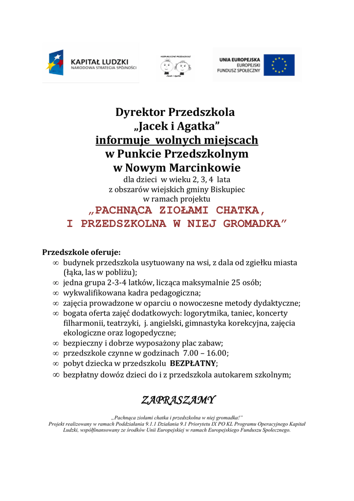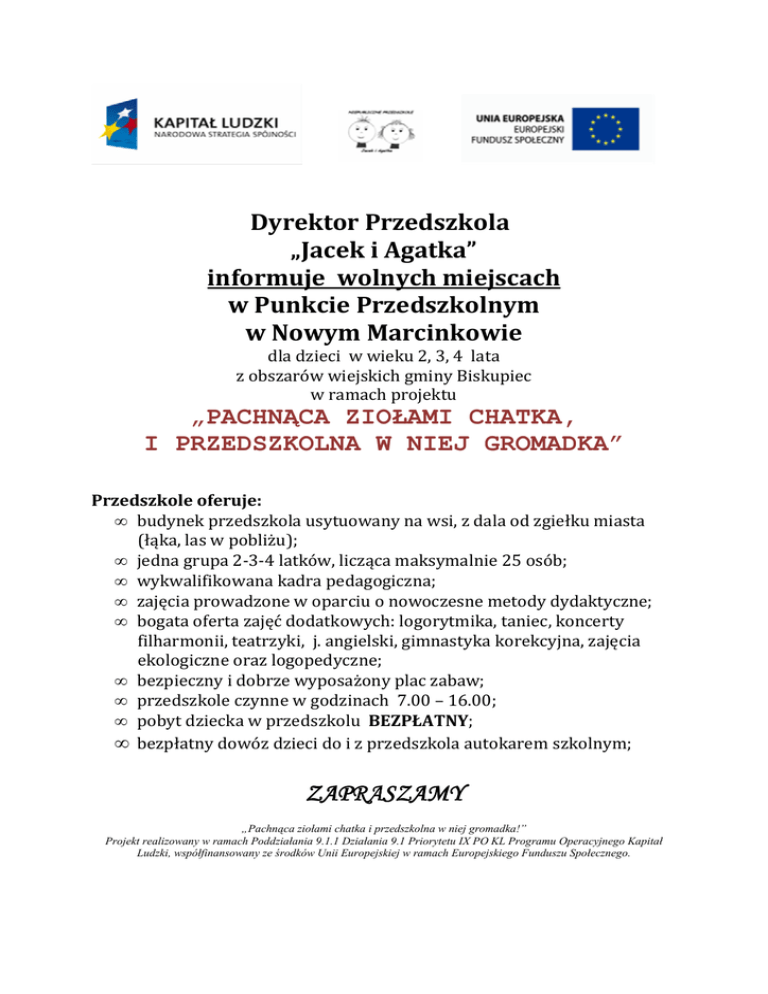 Dyrektor Przedszkola „Jacek i Agatka” informuje wolnych miejscach w Punkcie Przedszkolnym w Nowym Marcinkowie dla dzieci w wieku 2, 3, 4 lata z obszarów wiejskich gminy Biskupiec w ramach projektu „PACHNĄCA ZIOŁAMI CHATKA, I PRZEDSZKOLNA W NIEJ GROMADKA” Przedszkole oferuje: • budynek przedszkola usytuowany na wsi, z dala od zgiełku miasta (łąka, las w pobliżu); • jedna grupa 2-3-4 latków, licząca maksymalnie 25 osób; • wykwalifikowana kadra pedagogiczna; • zajęcia prowadzone w oparciu o nowoczesne metody dydaktyczne; • bogata oferta zajęć dodatkowych: logorytmika, taniec, koncerty filharmonii, teatrzyki, j. angielski, gimnastyka korekcyjna, zajęcia ekologiczne oraz logopedyczne; • bezpieczny i dobrze wyposażony plac zabaw; • przedszkole czynne w godzinach 7.00 – 16.00; • pobyt dziecka w przedszkolu BEZPŁATNY; • bezpłatny dowóz dzieci do i z przedszkola autokarem szkolnym; ZAPRASZAMY „Pachnąca ziołami chatka i przedszkolna w niej gromadka!” Projekt realizowany w ramach Poddziałania 9.1.1 Działania 9.1 Priorytetu IX PO KL Programu Operacyjnego Kapitał Ludzki, współfinansowany ze środków Unii Europejskiej w ramach Europejskiego Funduszu Społecznego.