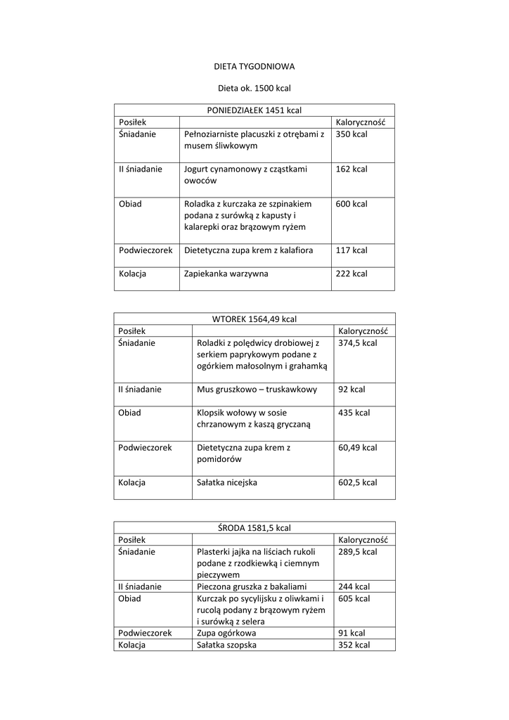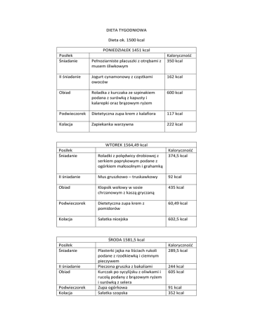 DIETA TYGODNIOWA Dieta ok. 1500 kcal PONIEDZIAŁEK 1451 kcal Posiłek Śniadanie Pełnoziarniste placuszki z otrębami z musem śliwkowym Kaloryczność 350 kcal II śniadanie Jogurt cynamonowy z cząstkami owoców 162 kcal Obiad Roladka z kurczaka ze szpinakiem podana z surówką z kapusty i kalarepki oraz brązowym ryżem 600 kcal Podwieczorek Dietetyczna zupa krem z kalafiora 117 kcal Kolacja Zapiekanka warzywna 222 kcal WTOREK 1564,49 kcal Posiłek Śniadanie Roladki z polędwicy drobiowej z serkiem paprykowym podane z ogórkiem małosolnym i grahamką Kaloryczność 374,5 kcal II śniadanie Mus gruszkowo – truskawkowy 92 kcal Obiad Klopsik wołowy w sosie chrzanowym z kaszą gryczaną 435 kcal Podwieczorek Dietetyczna zupa krem z pomidorów 60,49 kcal Kolacja Sałatka nicejska 602,5 kcal ŚRODA 1581,5 kcal Posiłek Śniadanie II śniadanie Obiad Podwieczorek Kolacja Plasterki jajka na liściach rukoli podane z rzodkiewką i ciemnym pieczywem Pieczona gruszka z bakaliami Kurczak po sycylijsku z oliwkami i rucolą podany z brązowym ryżem i surówką z selera Zupa ogórkowa Sałatka szopska Kaloryczność 289,5 kcal 244 kcal 605 kcal 91 kcal 352 kcal CZWARTEK 1443,75 kcal Posiłek Śniadanie II śniadanie Obiad Podwieczorek Kolacja Różyczki z pieczonego schabu z sałatką z mieszanych kiełków oraz cząstkami ogórka Koktajl pomarańczowy Pieczona pierś z indyka w pergaminie z sosem kurkowym i rozmarynem podana brązowym ryżem i surówką z czerwonej kapusty Placek z otrębami i świeżym owocem Pita z sałatką warzywną i dressingiem koktajlowym Kaloryczność 373,5 184 kcal 337,5 kcal 171,75 kcal 377 kcal PIĄTEK 1522,47 kcal Posiłek Śniadanie II śniadanie Obiad Podwieczorek Kolacja Roladki z żółtego sera nadziewane kiełkami i suszonymi pomidorami podane z cząstkami pomidora i pieczywem chrupkim pełnoziarnistym Serek migdałowy z waflem ryżowym Kotlety warzywne na sosie paprykowym podane z brązowym, dzikim ryżem Parzycha Sałatka ze świeżych warzy z czosnkowymi grzankami i dressingiem miodowo musztardowym Kaloryczność 403 kcal 236,47 585 kcal 90 kcal 208 kcal SOBOTA 1670 kcal Posiłek Śniadanie II śniadanie Obiad Podwieczorek Kolacja Pełnoziarnisty naleśnik z twarożkiem i owocami Miseczka świeżych owoców Gołąbki w kapuście z sosem pomidorowo – bazylikowym podane z sałatką z kapusty pekińskiej Kanapeczki z szynką i kolorowymi warzywami Pieczeń warzywna z kwaśną śmietaną Kaloryczność 398 kcal 111 716 kcal 212,75 233 kcal NIEDZIELA 1435,22 kcal Posiłek Śniadanie II śniadanie Obiad Podwieczorek Kolacja Różyczki z wędliny drobiowej z cząstkami kolorowej papryki i pieczywem chrupkim Jogurt naturalny z kawałkami owoców i zarodkami pszennymi Pełnoziarniste spaghetti z sosem pomidorowym ze świeżą bazylią Sałatka owocowa z suszoną żurawiną i płatkami migdałowymi Krem z białych warzyw z oliwą truflową i pełnoziarnistymi truflami Kaloryczność 452 kcal 176,22 356 kcal 114 kcal 337 kcal
