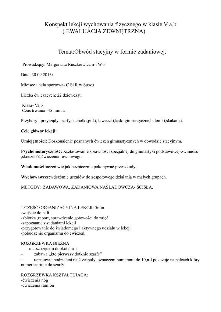 Konspekt lekcji wychowania fizycznego w klasie V a,b ( EWALUACJA ZEWNĘTRZNA). Temat:Obwód stacyjny w formie zadaniowej. Prowadzący: Małgorzata Ruszkiewicz n-l W-F Data: 30.09.2013r Miejsce : hala sportowa- C Si R w Suszu Liczba ćwiczących: 22 dziewcząt. Klasa- Va,b Czas trwania -45 minut. Przybory i przyrządy:szarfy,pachołki,piłki, ławeczki,laski gimnastyczne,baloniki,skakanki. Cele główne lekcji: Umiejętności: Doskonalenie poznanych ćwiczeń gimnastycznych w obwodzie stacyjnym. Psychomotoryczność: Kształtowanie sprawności specjalnej do gimnastyki podstawowej-zwinność ,skoczność,ćwiczenia równowagi. Wiadomości:uczeń wie jak bezpiecznie pokonywać przeszkody. Wychowawcze:wdrażanie uczniów do zespołowego działania w małych grupach. METODY: ZABAWOWA, ZADANIOWA,NAŚLADOWCZA- ŚCISŁA. 1.CZĘŚĆ ORGANIZACYJNA LEKCJI: 5min -wejście do hali -zbiórka ,raport, sprawdzenie gotowości do zajęć -zapoznanie z zadaniami lekcji -przygotowanie do świadomego i aktywnego udziału w lekcji -pobudzenie organizmu do ćwiczeń.. ROZGRZEWKA BIEŻNA -marsz rzędem dookoła sali – zabawa ,,kto pierwszy dotknie szarfę” – uczniowie podzieleni na 2 zespoły ,oznaczeni numerami do 10,n-l pokazuje na palcach który numer startuje do szarfy. ROZGRZEWKA KSZTAŁTUJĄCA: -ćwiczenia nóg -ćwiczenia ramion -ćwiczenia szyi i głowy -ćwiczenia mm grzbietu -ćwiczenia mm brzucha -ćwiczenia skocznościowe 2.CZĘŚĆ GŁÓWNA: 35min -Organizacja obwodu ćwiczebnego, -podział uczniów na pary, które to przygotowują sprzęt do poszczególnych stanowisk. 1. rzuty piłki w parach do kosza poprzez odbijanie jej o podłogę ,tak aby odbijając się wpadła do kosza. 2. Odbicia piłki siatkowej w parach,ćwiczenia odbywają się w biegu i wyskoku do ćwiczącego prawą dłonią 3. Slalom piłki laską gimnastyczną wokół pachołków, ćwiczenia wykonuje się w biegu,przy przewróceniu pachołka należy powtórzyć ćwiczenie. 4. Wrzucanie piłki do pachołka trzymanego przez partnera,należy wykonać 10 celnych rzutów po czy następuje zmiana ćwiczących. 5. Przechodzenie po listwie ławeczki gimnastycznej na jej drugi koniec( zamiana miejscami) ,wyminąć się po drodze tak aby nie zrzucić partnera. 6. Podania piłki ręcznej w parach ,ćwiczenie odbywa się w biegu,do połowy drogi w stosunku ćwiczącego wykonując podanie następnie bieg tyłem na swoje miejsce. 7. W podporze tyłem do siebie,-za pomocą nóg umieścić piłkę w,, bramce ''( między nogami partnera),ćwiczący nie powinni dotykać kolanami i brzuchem do podłoża. 8. Odbicia balonów różnymi częściami ciała,głową, czołem ,plecami,łokciem ,kolanami ,oraz podbijanie balona w górę tak aby nie opad , zabieranie równocześnie balonika partnerowi. 9. Przeciąganie partnera za linę trzymając laskę gimnastyczną. 10. Podbijanie piłki siatkowej w parach. 11. Wrzucanie piłki koszykowej do kosza za pomocą lasek gimnastycznych. Zmiana zespołów następuje co 2minuty. 3.CZĘŚĆ KOŃCOWA LEKCJI:5min -uspokojenie organizmu -ćwiczenia korektywne:w marszu wspięcie na palcach z ramionami w górę -wdech,na całych stopach,ramiona w dół -wydech. -rytmiczny marsz dookoła sali. -zbiórka w dwuszeregu.. -zakończenie lekcji:ocena wykonania zadań ,podsumowanie pracy uczniów na lekcji, wyróznienie najbardziej aktywnych uczniów na lekcji. Pożegnanie. Opracowała : mgr Małgorzata Ruszkiewicz