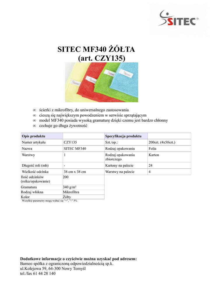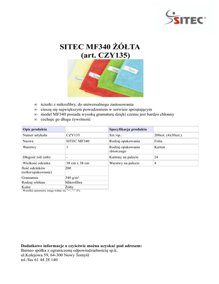 SITEC MF340 ŻÓŁTA (art. CZY135) • • • • ścierki z mikrofibry, do uniwersalnego zastosowania cieszą się największym powodzeniem w serwisie sprzątającym model MF340 posiada wysoką gramaturę dzięki czemu jest bardzo chłonny cechuje go długa żywotność Opis produktu Specyfikacja produktu Numer artykułu CZY135 Szt./op.: 200szt. (4x50szt.) Nazwa SITEC MF340 Rodzaj opakowania Folia Warstwy 1 Rodzaj opakowania zbiorczego Karton Długość roli (mb) - Kartony na palecie 24 Wielkość odcinka Ilość odcinków (rolka/opakowanie) 38 cm x 38 cm 200 Warstwy na palecie 4 Gramatura Rodzaj włókna Kolor 340 g/m² Mikrofibra Żółty Wszelkie parametry mogą wahać się "+", "-" 5% Dodatkowe informacje o czyściwie można uzyskać pod adresem: Barneo spółka z ograniczoną odpowiedzialnością sp.k. ul.Kolejowa 59, 64-300 Nowy Tomyśl tel./fax 61 44 28 140