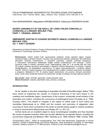 FOLIA POMERANAE UNIVERSITATIS TECHNOLOGIAE STETINENSIS Folia Pomer. Univ. Technol. Stetin., Agric., Aliment., Pisc., Zootech. 2014, 309 (29), 5–14 Piotr BARANOWSKI, Magdalena WRÓBLEWSKA, Katarzyna PĘZIŃSKA-KIJAK1 SHAPE VARIABILITY IN THE SKULL OF LONG-TAILED CHINCHILLA (CHINCHILLA LANIGER, MOLINA 1782) PART 1. CRANIAL ANGLES ZMIENNOŚĆ KSZTAŁTU CZASZKI SZYNSZYLI MAŁEJ (CHINCHILLA LANIGER, MOLINA 1782) CZ. 1. KĄTY CZASZKI Department of Animal Anatomy, Faculty of Biotechnology and Animal Husbandry, West Pomeranian University of Technology, Szczecin, Poland Streszczenie. Celem badań było oszacowanie wielkości zmian wartości kątów czaszki szynszyli małej w okresie wzrostu i rozwoju oraz porównanie wartości ustalonych dla osobników dorosłych zwierząt hodowlanych z wynikami pomiarów czaszek zwierząt bytujących w warunkach naturalnych. Badaniami objęto czaszki hodowlanych 319 samców i samic szynszyli małej w sześciu okresach życia, obejmujących wiek od 1 do ponad 800 dni oraz 32 czaszki zwierząt dorosłych pochodzące z Muzeum Historii Naturalnej w Londynie. Czaszki sfotografowano, na fotografiach wyznaczono 12 kątów wyprowadzonych z punktów stałych czaszki. Różnice między grupami oraz współzależności między cechami szacowano modułami z programu Statistica 9 v.Pl. W wyniku badań stwierdzono, że pomimo różnych warunków życia, okres około stuletniej hodowli nie wykreował nowego morfotypu dla tego gatunku gryzoni. Key words: angle, chichilla, geometry, measurements, skull. Słowa kluczowe: czaszka, geometria, kąty, pomiary, szynszyle. INTRODUCTION So far, studies on the skull morphology in long-tailed chinchilla (Chinchilla laniger, Molina 1782) have aimed at explaining the causes of unnatural thickening of the bone tissue in the maxillary and mandibular region, hypertrophy of the incisors, unnaturally broad surface of the premolars and molars, including the occurrence of pathological forms (Crossley et al. 1998; Crossley 2001). This results in changes in the values of metric traits of such crania and mandibles (Baranowski et al. 2008) and the location and symmetry of epigenetic traits occurring on them when compared to the skulls of animals being caught in natural conditions or living in animal farms (Baranowski and Wojtas 2011 a, 2011 b). Animal skulls are an excellent object to study morphological variability and they illustrate the course of species evolution which can be also affected by non-genetic factors, including the environment (Ingervall and Bitsanis 1987; Kiliaridis et al. 1985; Kilidaris 1989; Varrela 1992; Corresponding author – Adres do korespondencji: Prof. PhD Piotr Baranowski, Department of Animal Anatomy, Faculty of Biotechnology and Animal Husbandry, West Pomeranian University of Technology, Szczecin, Doktora Judyma 14, 71-466 Szczecin, Poland, e-mail: [email protected] 6 P. Baranowski et al. Zuccarelli 2004). The main tool in such studies are metric and non-metric traits being already mentioned above. However, a measurement technique consisting in the examination of geometric correlations between metric traits of the skull, particular parts of which undergo rebuilding together with successive development stages, has not been applied so far with respect to rodents. Postnatal growth and development of particular skull parts have been described in different animal species (Sperber 2001; Baranowski and Furkioti 2007) and humans (Sierpińska et al. 2008). In the puppies of dolichocephalic breeds, such as German Shepherd, the neurocranium has a shape being similar to a circle, while the zygomatic breadth at birth is larger than the total skull length; these proportions change with age (Onar and Güneş 2003). Changes in the shape of long-tailed chinchilla skull, being distinguished from the skulls of other Rodentia species by its characteristic conformation, have not bee yet described. The skull of these animals is characterised by two very large orbits under which the insertions of masticatory muscles are situated, different structure of the mandibular bones, different position of the lacrimal bones, and different articulation of parietal, temporal and occipital bone (Lavocat 1974). The skull is an environmentally flexible structure, while the food being taken is an important element affecting the biomechanics of the cranium-mandible complex and contributes to its development, growth and general morphology. Living conditions in captivity and in the wild are the factors determining construction of the skeleton. Answering the question whether origin may be a source of variability for certain traits of long-tailed chinchilla skulls has become an key objective of this study. To achieve this objective, it was decided to estimate the magnitude of changes in the values of angles being determined by craniometric points occurring with time and to determine correlations between these angles and the selected metric traits of long-tailed chinchilla skulls in chosen periods of growth and development and to compare these values with the results being determined on the skulls of animals living under natural conditions. MATERIAL AND METHODS The study was conducted on 319 skulls of male and female long-tailed chinchillas, in six periods of life, covering the age from 1 day to more than 800 days (1–18 days, n = 29; 30–58 days, n = 9; 258–360 days, n = 126; 366–399 days, n = 65; 400–507 days, n = 52; more than 800 days, n = 38). The skulls originated from carcasses being skinned on a chinchilla farm in Poland (53º40’N; 15º08’E) and from 32 wild animals, the skeletons of which are housed at the Natural History Museum in London. Based on the analysis of cranial suture obliteration and comparison with the skulls of farm chinchillas of known age from Poland, the museum long-tailed chinchilla skulls were found to came from mature animals (subadult). The age of farm animals at slaughter was determined based on their record cards. Skull