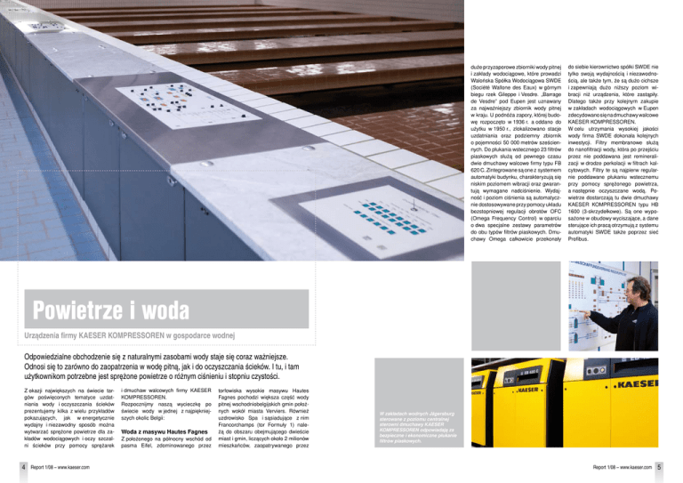 duże przyzaporowe zbiorniki wody pitnej i zakłady wodociągowe, które prowadzi Walońska Spółka Wodociągowa SWDE (Société Wallone des Eaux) w górnym biegu rzek Gileppe i Vesdre. „Barrage de Vesdre” pod Eupen jest uznawany za najważniejszy zbiornik wody pitnej w kraju. U podnóża zapory, której budowę rozpoczęto w 1936 r. a oddano do użytku w 1950 r., zlokalizowano stacje uzdatniania oraz podziemny zbiornik o pojemności 50 000 metrów sześciennych. Do płukania wstecznego 23 filtrów piaskowych służą od pewnego czasu dwie dmuchawy walcowe firmy typu FB 620 C. Zintegrowane są one z systemem automatyki budynku, charakteryzują się niskim poziomem wibracji oraz gwarantują wymagane nadciśnienie. Wydajność i poziom ciśnienia są automatycznie dostosowywane przy pomocy układu bezstopniowej regulacji obrotów OFC (Omega Frequency Control) w oparciu o dwa specjalne zestawy parametrów do obu typów filtrów piaskowych. Dmuchawy Omega całkowicie przekonały do siebie kierownictwo spółki SWDE nie tylko swoją wydajnością i niezawodnością, ale także tym, że są dużo cichsze i zapewniają dużo niższy poziom wibracji niż urządzenia, które zastąpiły. Dlatego także przy kolejnym zakupie w zakładach wodociągowych w Eupen zdecydowano się na dmuchawy walcowe KAESER KOMPRESSOREN. W celu utrzymania wysokiej jakości wody firma SWDE dokonała kolejnych inwestycji. Filtry membranowe służą do nanofiltracji wody, która po przejściu przez nie poddawana jest remineralizacji w drodze perkolacji w filtrach kalcytowych. Filtry te są najpierw regularnie poddawane płukaniu wstecznemu przy pomocy sprężonego powietrza, a następnie oczyszczane wodą. Powietrze dostarczają tu dwie dmuchawy KAESER KOMPRESSOREN typu HB 1600 (3-skrzydełkowe). Są one wyposażone w obudowy wyciszające, a dane sterujące ich pracą otrzymują z systemu automatyki SWDE także poprzez sieć Profibus. Powietrze i woda Urządzenia firmy KAESER KOMPRESSOREN w gospodarce wodnej Odpowiedzialne obchodzenie się z naturalnymi zasobami wody staje się coraz ważniejsze. Odnosi się to zarówno do zaopatrzenia w wodę pitną, jak i do oczyszczania ścieków. I tu, i tam użytkownikom potrzebne jest sprężone powietrze o różnym ciśnieniu i stopniu czystości. Z okazji największych na świecie targów poświęconych tematyce uzdatniania wody i oczyszczania ścieków prezentujemy kilka z wielu przykładów pokazujących, jak w energetycznie wydajny i niezawodny sposób można wytwarzać sprężone powietrze dla zakładów wodociągowych i oczy szczalni ścieków przy pomocy sprężarek 4 Report 1/08 – www.kaeser.com i dmuchaw walcowych firmy KAESER KOMPRESSOREN. Rozpocznijmy naszą wycieczkę po świecie wody w jednej z najpiękniejszych okolic Belgii: Woda z masywu Hautes Fagnes Z położonego na północny wschód od pasma Eifel, zdominowanego przez torfowiska wysokie masywu Hautes Fagnes pochodzi większa część wody pitnej wschodniobelgijskich gmin położnych wokół miasta Verviers. Również uzdrowisko Spa i sąsiadujące z nim Francorchamps (tor Formuły 1) należą do obszaru obejmującego dwieście miast i gmin, liczących około 2 milionów mieszkańców, zaopatrywanego przez W zakładach wodnych Jägersburg sterowane z poziomu centralnej sterowni dmuchawy KAESER KOMPRESSOREN odpowiadają za bezpieczne i ekonomiczne płukanie filtrów piaskowych. Report 1/08 – www.kaeser.com 5 W heskich zakładach Jägersburg panuje czystośc i … … nowoczesne założenia techniczne zapewniające uzyskanie doskonałej wody pitnej Zakłady wodociągowe Stembert (miasto Verviers) W celu usunięcia maksymalnej ilości niepożądanych cząstek (wapnia) z dopływającej wody, przepuszcza się ją przez zbiorniki flotacyjne. Tam wtryskiwana jest woda nasycona mikropęcherzykami powietrza. Pęcherzyki, przyklejając się do cząstek wapnia, wynoszą je na powierzchnię. Stąd, wraz z górną warstwą wody, są zbierane z powierzchni, a później w zbiorniku filtracyjnym usuwa się je przy pomocy filtra i poddaje recyklingowi, stosując przy produkcji cementu. W celu wyeliminowania jakiegokolwiek niebezpieczeństwa zanieczyszczenia wody przez olej sprężarkowy, w obu sprężarkach śrubowych KAESER KOMPRESSOREN ze zintegrowanym osuszaczem chłodniczym typu ASD 47T, używanych do wtryskiwania powietrza do chłodzenia i smarowania wirników, stosuje się olej dopuszczony do kontaktu z żywnością. System uzdatniania powietrza uzupełniają umieszczone za osuszaczami chłodniczymi filtry 6 Report 1/08 – www.kaeser.com olejowe do sprężonego powietrza typu FC 48 i FE 48. Wszystkie dane na temat pracy systemu przekazywane przez Profibus do systemu automatyki można monitorować zdalnie w sieci przy pomocy dowolnego komputera osobistego. Zakłady wodociągowe Chôdes (miasto Malmedy) Tutaj także zainstalowana jest dmuchawa kompaktowa (DB 235 C/30 kW). Niedawno inżynierowie z SWDE uruchomili również i dla tego obiektu dwie sprężarki śrubowe KAESER KOMPRESSOREN (typ SX), żeby przy pomocy wyżej opisanej metody flotacyjnej umożliwić usuwanie z wody niepożądanych cząstek. Oczywiście także i do tych sprężarek stosuje się olej chłodząco/smarujący posiadający dopuszczenie do kontaktu z żywnością. Woda z regionu Ried dla Frankfurtu i okolic Otwarte w 1968 r. Zakłady Wodociągowe Jägersburg, należące do Zaopa- trzeniowej Spółki Wodnej Riedgruppe Ost (Wasserbeschaffungsverband Riedgruppe Ost), dostarczają wodę pitną do spółki dystrybucyjnej Hessenwasser, w celu proporcjonalnego zaopatrzenia aglomeracji Ren-Men w okresach podstawowego zapotrzebowania. Oprócz tego od 1995 r. do ich zadań należy zaopatrzenie w wodę pitną miasta Bensheim oraz częściowe zaopatrzenie miasta Zwingenberg. Woda gruntowa z 19 studni głębinowych jest uzdatniana przy pomocy instalacji o zdolności przetwórczej 2500 m3/h i gromadzona w dwóch zbiornikach tymczasowych o pojemności 2500 m3