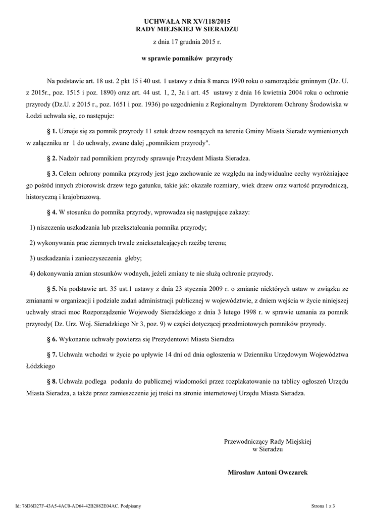 UCHWAŁA NR XV/118/2015 RADY MIEJSKIEJ W SIERADZU z dnia 17 grudnia 2015 r. w sprawie pomników przyrody Na podstawie art. 18 ust. 2 pkt 15 i 40 ust. 1 ustawy z dnia 8 marca 1990 roku o samorządzie gminnym (Dz. U. z 2015r., poz. 1515 i poz. 1890) oraz art. 44 ust. 1, 2, 3a i art. 45 ustawy z dnia 16 kwietnia 2004 roku o ochronie przyrody (Dz.U. z 2015 r., poz. 1651 i poz. 1936) po uzgodnieniu z Regionalnym Dyrektorem Ochrony Środowiska w Łodzi uchwala się, co następuje: § 1. Uznaje się za pomnik przyrody 11 sztuk drzew rosnących na terenie Gminy Miasta Sieradz wymienionych w załączniku nr 1 do uchwały, zwane dalej „pomnikiem przyrody". § 2. Nadzór nad pomnikiem przyrody sprawuje Prezydent Miasta Sieradza. § 3. Celem ochrony pomnika przyrody jest jego zachowanie ze względu na indywidualne cechy wyróżniające go pośród innych zbiorowisk drzew tego gatunku, takie jak: okazałe rozmiary, wiek drzew oraz wartość przyrodniczą, historyczną i krajobrazową. § 4. W stosunku do pomnika przyrody, wprowadza się następujące zakazy: 1) niszczenia uszkadzania lub przekształcania pomnika przyrody; 2) wykonywania prac ziemnych trwale zniekształcających rzeźbę terenu; 3) uszkadzania i zanieczyszczenia gleby; 4) dokonywania zmian stosunków wodnych, jeżeli zmiany te nie służą ochronie przyrody. § 5. Na podstawie art. 35 ust.1 ustawy z dnia 23 stycznia 2009 r. o zmianie niektórych ustaw w związku ze zmianami w organizacji i podziale zadań administracji publicznej w województwie, z dniem wejścia w życie niniejszej uchwały straci moc Rozporządzenie Wojewody Sieradzkiego z dnia 3 lutego 1998 r. w sprawie uznania za pomnik przyrody( Dz. Urz. Woj. Sieradzkiego Nr 3, poz. 9) w części dotyczącej przedmiotowych pomników przyrody. § 6. Wykonanie uchwały powierza się Prezydentowi Miasta Sieradza § 7. Uchwała wchodzi w życie po upływie 14 dni od dnia ogłoszenia w Dzienniku Urzędowym Województwa Łódzkiego § 8. Uchwała podlega podaniu do publicznej wiadomości przez rozplakatowanie na tablicy ogłoszeń Urzędu Miasta Sieradza, a także przez zamieszczenie jej treści na stronie internetowej Urzędu Miasta Sieradza. Przewodniczący Rady Miejskiej w Sieradzu Mirosław Antoni Owczarek Id: 76D6D27F-43A5-4AC0-AD64-42B2882E04AC. Podpisany Strona 1 z 3 Załącznik do uchwały Nr XV/118/2015 Rady Miejskiej w Sieradzu z dnia 17 grudnia 2015 r. Wykaz drzew pomników przyrody POŁOŻENIE L.P. 1 2 3 4 5 6 Sieradz ul. Ogrodowa WGS λ :180 44’ 9,0’’ φ: 510 35’ 35,9” PL-1992 x: 414123,44 y:481706,28 Sieradz ul. Witosa 22 WGS λ :180 44’ 45,9’’ φ: 510 34’ 57,4” PL-1992 x: 412931,66 y:482423,45 Sieradz ul. Kolegiacka 11 WGS λ :180 44’ 20,3 φ: 510 35’ 35,0” PL-1992 x: 414096,32 y:481924,56 Sieradz ul. J. Piłsudzkiego 2 WGS λ :180 44’ 6,4’’ φ: 510 35’ 35,1” PL-1992 x: 414098,08 y:481656,83 Sieradz ul. Ogrodowa WGS λ :180 44’ 9,1’’ φ: 510 35’ 36,0” PL-1992 x: 414125,86 y:481707,41 Sieradz Męka Księża ul. Kościelna WGS λ :180 44’ 45,9’’ φ: 510 34’ 57,4” PL-1992 NR DZIAŁKI OBWÓD PNIA (cm) NA WYS. 1.3 m WYSOKOŚ Ć DRZEWA (m) MAKSYMALNA ROZPIĘTOŚĆ KORONY (m) 193/3 Dąb szypułkowy odm. stożkowa (Quercus robur 'Fastigiata') 345 15 7,0 Prezydent Miasta Sieradza 234/2 Dąb szypułkowy (Quercus robur ) 515 20 25 Prezydent Miasta Sieradza 395 23 18 115 GATUNEK Lipa drobnolistna (Tilia mordata) Sprawujący nadzór Prezydent Miasta Sieradza 189 Glediczja trójcierniowa, iglicznia trójcierniowa (Gleditsia triacanthos L.) 282 6 4 Prezydent Miasta Sieradza 193/3 Sosna czarna (Pinus nigra Arn.) 260 10 12 Prezydent Miasta Sieradza 45 Dąb szypułkowy (Quercus robur ) 10 Prezydent Miasta Sieradza Id: 76D6D27F-43A5-4AC0-AD64-42B2882E04AC. Podpisany 601 26 Strona 2 z 3 7 8 9 10 11 x: 412931,66 y:482423,45 Sieradz ul. Widawska 22a WGS λ :180 44’ 45,9’’ φ: 510 34’ 57,4” PL-1992 x: 412931,66 y:482423,45 Sieradz ul. Widawska 22a WGS λ :180 47’ 24,0’’ φ: 510 35’ 54,1” PL-1992 x: 414673,33 y:485459,19 Sieradz Park Staromiejski WGS λ :180 44’ 15,4’’ φ: 510 36’ 1,2” PL-1992 x: 414905,06 y:481833,04 Sieradz Park Staromiejski WGS λ :180 44’ 19,6’’ φ: 510 35’ 8” PL-1992 x: 414768,53 y:481912,95 Sieradz Park Staromiejski WGS λ :180 44’ 15,5 φ: 510 36’ 1,8” PL-1992 x: 414924,37 y:481834,90 112/6 112/6 245/10 245/10 Dąb szypułkowy (Quercus robur) 378 Kasztanowiec zwyczajny (Aesculus hippocastanum L.) 392 Klon zwyczajny, (Acer platanoides L.) 26 22 Prezydent Miasta Sieradza 23 27 Prezydent Miasta Sieradza 296 26 13 Klon zwyczajny, (Acer platanoides L.) 282 26 14 Platan klonolistny (Platanus × hispanica) 297 245/10 Id: 76D6D27F-43A5-4AC0-AD64-42B2882E04AC. Podpisany Prezydent Miasta Sieradza Prezydent Miasta Sieradza 24 26 Prezydent Miasta Sieradza Strona 3 z 3