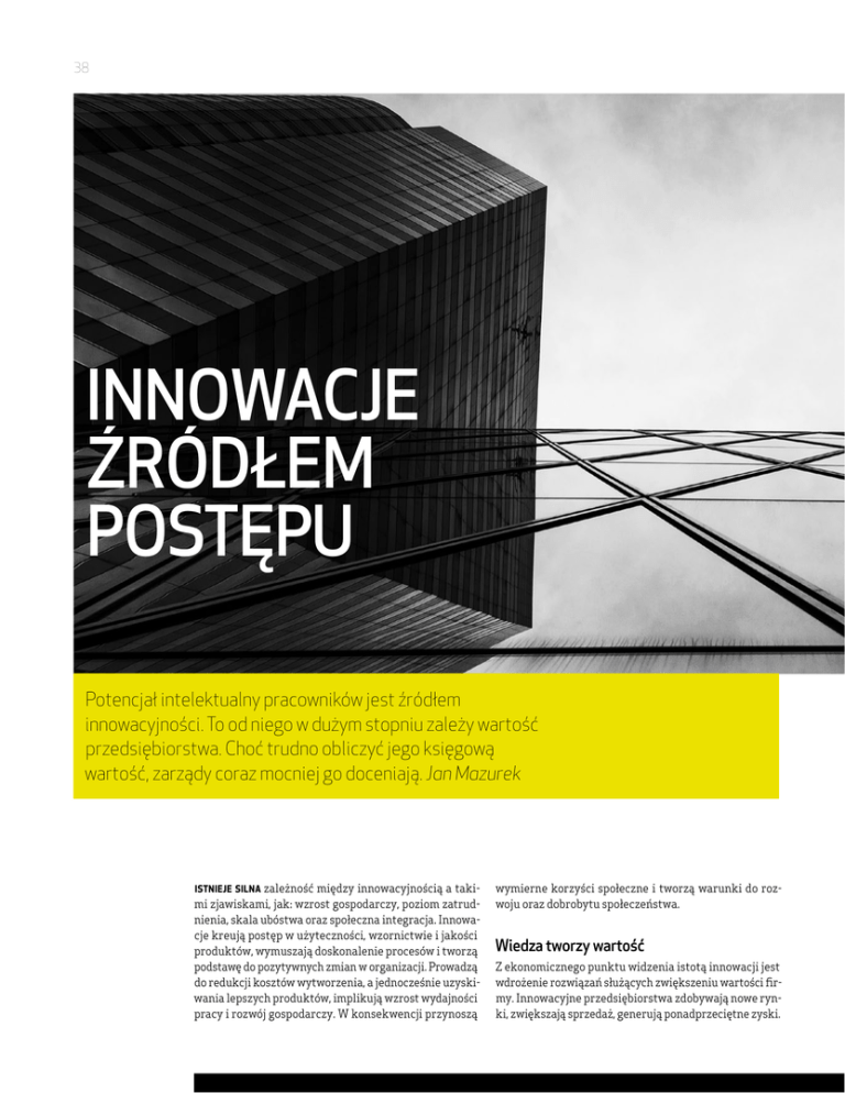 38 Innowacje źródłem postępu Potencjał intelektualny pracowników jest źródłem innowacyjności. To od niego w dużym stopniu zależy wartość przedsiębiorstwa. Choć trudno obliczyć jego księgową wartość, zarządy coraz mocniej go doceniają. Jan Mazurek Istnieje silna zależność między innowacyjnością a takimi zjawiskami, jak: wzrost gospodarczy, poziom zatrudnienia, skala ubóstwa oraz społeczna integracja. Innowacje kreują postęp w użyteczności, wzornictwie i jakości produktów, wymuszają doskonalenie procesów i tworzą podstawę do pozytywnych zmian w organizacji. Prowadzą do redukcji kosztów wytworzenia, a jednocześnie uzyskiwania lepszych produktów, implikują wzrost wydajności pracy i rozwój gospodarczy. W konsekwencji przynoszą wymierne korzyści społeczne i tworzą warunki do rozwoju oraz dobrobytu społeczeństwa. Wiedza tworzy wartość Z ekonomicznego punktu widzenia istotą innowacji jest wdrożenie rozwiązań służących zwiększeniu wartości firmy. Innowacyjne przedsiębiorstwa zdobywają nowe rynki, zwiększają sprzedaż, generują ponadprzeciętne zyski. zdjęcie: The Image Bank / getty images Najskuteczniejsi prezesi Innowacyjność pozwala im kreować zmiany w zakresie techniki i organizacji. Tak funkcjonujący system określa się mianem gospodarki opartej na wiedzy. Świadome tego korporacje dokształcają swoich pracowników, prowadzą prace badawczo-rozwojowe, inwestują w nowoczesne technologie. Zysk wypracowany przez jedno innowacyjne rozwiązanie mogą przeznaczyć na kolejne przełomowe rozwiązania, które wygenerują następne profity. W efekcie rosną środki na dalsze nowatorskie rozwiązania. Ten proces nie ma końca, a innowacyjne firmy uzyskują coraz większy potencjał wzrostowy. W ten sposób rosła potęga gigantycznych dziś koncernów – Microsoftu, Google, Apple, Sony, Amazona czy Facebooka. Twarde dowody opłacalności innowacji Redakcja amerykańskiej edycji magazynu Forbes prowadzi coroczny ranking, w którym wybiera 100 najbardziej innowacyjnych firm na świecie. W 2013 roku w rankingu 39 po raz czwarty zwyciężyła firma Salesforce.com z USA, producent oprogramowania, który oferuje m.in. rozwiązania CRM i cloud computing. W listopadzie 2014 roku kapitalizacja spółki wynosiła około 38 miliardów dolarów. Drugie miejsce zajął Alexion Pharmaceuticals, działający w sektorze biotechnologii, którego kapitalizacja wynosi około 39 miliardów dolarów. Głównym kryterium rankingu była premia innowacyjna (Innovation Premium), odzwierciedlająca sentyment inwestorów do innowacyjnych spółek. Inwestorzy oczekują od zarządów wprowadzania nowych produktów i wchodzenia na nowe rynki, bo taka strategia generuje większe strumienie przychodów dla firm. Autorzy rankingu oszacowali premię innowacyjną dla Alexion Pharmaceuticals na 71%, a dla Salesforce.com na 76%. Laureaci osiągnęli również ponadprzeciętne wyniki finansowe. Sprzedaż Salesforce.com w 2013 roku wzrosła o 36% rok do roku, a Alexion Pharmaceuticals o 47%. Kurs giełdowy akcji Salesforce.com w ostatnich pięciu 40 latach wzrósł o 280%. Inwestycja w Alexion Pharmaceuticals okazała się jeszcze korzystniejsza – cena akcji w tym samym czasie wzrosła o 730% (zob. ramkę TOP 10 najbardziej innowacyjnych firm na świecie w 2013 roku). USA kontra Stary Kontynent O potędze innowacyjności amerykańskiej gospodarki świadczy fakt, że 40% spośród setki najbardziej innowacyjnych firm pochodzi ze Stanów Zjednoczonych. Przyczyna takich osiągnięć wydaje się oczywista: na prace badawczo-rozwojowe przeznaczono tam w 2013 roku 465 miliardów dolarów – niewiele mniej niż wartość całego polskiego PKB. Wagę innowacyjności doceniła też Rada Europy, która w 2000 roku przyjęła dokument określany mianem Strategii Lizbońskiej, gdzie przewidziano osiągnięcie w 2010 roku średniego poziomu nakładów na B+R na poziomie 3% PKB Unii Europejskiej. Ambitny plan nie został zrealizowany – pojawiło się wiele przeszkód: kryzys finansowy, problemy państw PIGS, brak jedności i chęci do zmian. Obecnie realizowana jest strategia Europa 2020, w której również określono docelowy pułap wydatków na prace B+R – ma wynieść 3%. Oznacza to opóźnienie realizacji ambitnych planów zjednoczonej Europy o całą dekadę. Świat nie śpi Relacja nakładów na prace badawczo-rozwojowe wobec PKB w Izraelu wynosi 4,2%, w Korei Południowej – 3,6%, a w USA – 2,8%. Średnia dla całego świata to 1,8% (zob. ramkę Sumaryczny Indeks Innowacyjności). Czy zbiurokratyzowana, skostniała, umierająca Europa jest w stanie konsekwentnie podążać tym śladem, aby stawać się innowacyjnym kontynentem? To nie jest już pewne. W 2012 roku średni poziom wydatków na B+R w Unii Europejskiej wyniósł 2,06% (dane Eurostatu). To oznacza, że do osiągnięcia celu określonego w strategii Europa 2020 daleka droga. Produkty, procesy oraz metody organizacyjne i marketingowe nie muszą być nowością dla rynku, ale powinny być nowością przynajmniej dla samego przedsiębiorstwa. Są jednak kraje europejskie, które ponadprzeciętnie inwestują w badania rozwojowe. Prym w tym zakresie wiodą Finlandia i Szwecja, gdzie w 2012 roku na prace badawczo-rozwojowe wydano odpowiednio 3,55% oraz 3,41% PKB. Do czołówki należą też Niemcy i kraje Beneluksu. Nie można jednak nie zauważyć, że w tych państwach PKB per capita i stopa życiowa należą do najwyższych na naszym kontynencie. Miejsce Polski W Polsce prace B+R pochłaniają zaledwie 0,9% PKB, co stawia nas na czwartym miejscu od końca wśród 28 państw UE. Innowacyjność naszej gospodarki jest nisko oceniana także w światowych rankingach. Przyczyn jest wiele. Można je znaleźć w sferze zarządzania gospodarką kraju, samorządach, a także w samych przedsiębiorstwach, które lekceważą zagrożenie rosnącą konkurencją. Zbyt często nie ma też należytej współpracy prze