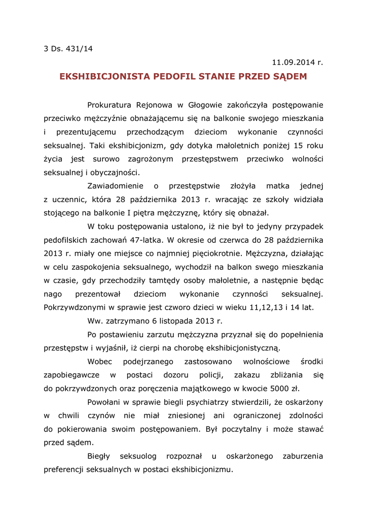 3 Ds. 431/14 11.09.2014 r. EKSHIBICJONISTA PEDOFIL STANIE PRZED SĄDEM Prokuratura Rejonowa w Głogowie zakończyła postępowanie przeciwko mężczyźnie obnażającemu się na balkonie swojego mieszkania i prezentującemu przechodzącym dzieciom wykonanie czynności seksualnej. Taki ekshibicjonizm, gdy dotyka małoletnich poniżej 15 roku życia jest surowo zagrożonym przestępstwem przeciwko wolności seksualnej i obyczajności. Zawiadomienie o przestępstwie złożyła matka jednej z uczennic, która 28 października 2013 r. wracając ze szkoły widziała stojącego na balkonie I piętra mężczyznę, który się obnażał. W toku postępowania ustalono, iż nie był to jedyny przypadek pedofilskich zachowań 47-latka. W okresie od czerwca do 28 października 2013 r. miały one miejsce co najmniej pięciokrotnie. Mężczyzna, działając w celu zaspokojenia seksualnego, wychodził na balkon swego mieszkania w czasie, gdy przechodziły tamtędy osoby małoletnie, a następnie będąc nago prezentował dzieciom wykonanie czynności seksualnej. Pokrzywdzonymi w sprawie jest czworo dzieci w wieku 11,12,13 i 14 lat. Ww. zatrzymano 6 listopada 2013 r. Po postawieniu zarzutu mężczyzna przyznał się do popełnienia przestępstw i wyjaśnił, iż cierpi na chorobę ekshibicjonistyczną. Wobec zapobiegawcze w podejrzanego postaci zastosowano dozoru wolnościowe policji, zakazu środki zbliżania się do pokrzywdzonych oraz poręczenia majątkowego w kwocie 5000 zł. Powołani w sprawie biegli psychiatrzy stwierdzili, że oskarżony w chwili czynów nie miał zniesionej ani ograniczonej zdolności do pokierowania swoim postępowaniem. Był poczytalny i może stawać przed sądem. Biegły seksuolog rozpoznał u oskarżonego preferencji seksualnych w postaci ekshibicjonizmu. zaburzenia 2 Oskarżony nie był dotąd karany. Za przestępstwo prezentowania małoletnim wykonania czynności seksualnych grozi mu kara od 2 do 12 lat pozbawienia wolności. Sprawę rozpozna Sąd Rejonowy w Głogowie. Informacja prawna: Skazując sprawcę za przestępstwo skierowane przeciwko wolności seksualnej, popełnione w związku z zaburzeniami preferencji seksualnych sąd może: zawieszając wykonanie oddziaływaniom kary - zobowiązać terapeutycznym lub go też do do poddania się uczestnictwa w oddziaływaniach korekcyjno-edukacyjnych, nie zawieszając wykonania kary - orzec umieszczenie sprawcy, po odbyciu kary, w zakładzie zamkniętym albo skierować go na leczenie ambulatoryjne w celu przeprowadzenia terapii farmakologicznej, lub psychoterapii, zmierzających do zapobieżenia ponownemu popełnieniu takiego przestępstwa (…).