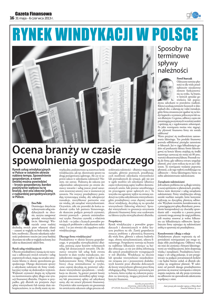 16 31 maja - 6 czerwca 2013 r. RYNEK WINDYKACJI W POLSCE Sposoby na terminowe spływy należności Ocena branży w czasie spowolnienia gospodarczego Rynek usług windykacyjnych w Polsce w ostatnim okresie nabiera tempa. Spowolnienie gospodarcze, a nawet śmielej można powiedzieć – kryzys gospodarczy, bardzo pozytywnie wpływa na tę branżę. Jest ona obecnie jedną z najbardziej perspektywicznych w Polsce. Ewa Polit Dominujące dotychczas wykonywanie usług windykacyjnych na zlecenie, zaczyna zastępować sprzedaż wierzytelności (m.in. faktoring). Wierzyciele coraz rzadziej dochodzą swoich praw własnymi siłami – czasami ze względu na brak wiedzy, środków, możliwości. Zlecenie odzyskania należności podmiotom trzecim jest coraz bardziej doceniane nie tylko ze względu na koszty, lecz także na skuteczność takich firm. Rynek usług windykacyjnych Obecnie przedsiębiorcy starają się nie naruszać z odbiorcami swoich towarów i usług poprawnych relacji, mając na uwadze utrzymanie klienta w okresie spowolnienia gospodarczego. Dlatego skierowanie sprawy o odzyskanie należności do firmy windykacyjnej wydaje się doskonałym wyjściem. Większość czynności skupia się wyłącznie na monitorowaniu spłaty długu oraz sytuacji finansowej dłużnika. Dopiero w przypadku, gdy dłużnik nie przejawia chęci spłaty wierzytelności lub istnieje duże niebezpieczeństwo, że za chwilę stanie się nie- wypłacalny, podejmowane są stanowcze kroki windykacyjne, jak np. skierowanie sprawy na drogę postępowania sądowego. Ale czy to zapewni sukces w odzyskaniu należności? Niestety, nie zawsze. Podstawą do sukcesu jest odpowiednie zabezpieczenie po stronie dostawcy towarów i usług jeszcze przed zawarciem stosownej umowy oraz w momencie jej zawarcia. Nie wszyscy przedsiębiorcy posiadają wystarczającą wiedzę, aby zabezpieczyć transakcje, zweryfikować partnerów oraz nie wiedzą, jak zarządzać wierzytelnościami. Oczywiście, nikt nie przewidzi do końca zachowań rynku lub partnera biznesowego, ale skuteczne podjęcie pewnych czynności, również prawnych – pomoże zminimalizować ryzyko. Powyższe czynniki, a właściwie ich brak – to jedne z licznych powodów powstających problemów z odzyskaniem należności. I to jest również siła napędowa rynku windykacyjnego. Dlaczego firma windykacyjna? Przedsiębiorcy w okresie kryzysu gospodarczego, w przypadku niewypłacalności dłużnika, ponoszą ciężar kosztów wykonanych usług lub dostarczonych towarów. Dla dostawcy towarów lub usług brak zwrotu kosztów to duże ryzyko transakcyjne, niejednokrotnie mogące mieć wpływ na dalsze funkcjonowanie firmy. Dlatego przedsiębiorcy chcąc minimalizować to ryzyko, coraz częściej decydują się powierzyć odzyskanie wierzytelności specjalistom – windykacja na zlecenie. Są gotowi ponieść koszty poprzez uiszczenie niewielkiej opłaty wstępnej lub procentowej opłaty od odzyskanej sumy, aby nie utracić płynności finansowej. Oczywiście takie rozwiązanie nie gwarantuje im uwieńczenia sukcesem całego procesu od- zyskiwania należności – dłużnicy mają szereg narzędzi, głównie prawnych, przedłużających możliwość odzyskania wierzytelności lub prowadzonych do sytuacji, gdy nie jest w ogóle możliwe ich odzyskanie (dłużnicy często wykorzystują zapisy wadliwe skonstruowanych umów, luki prawne umożliwiające im przeciąganie spraw sądowych etc.). To wszystko ma ogromny wpływ na zmianę tendencji na rynku odzyskiwania wierzytelności, gdzie przedsiębiorcy coraz chętniej zamiast zlecać windykację, decydują się na sprzedaż wierzytelności (faktoring właściwy). Sprzedaż wierzytelności to gwarancja utrzymania płynności finansowej firmy oraz scedowanie na faktora ryzyka niewypłacalności dłużnika. Perspektywy Rynek windykacyjny z powodów gospodarczych i ekonomicznych w dobie kryzysu przybiera na sile. Zastój gospodarczy oznacza problemy z płynnością finansową dla wielu firm, głównie z sektora budowlanego, obrotu nieruchomościami, sektora finansowego. Perspektywy rozwoju tej branży na najbliższe kilkanaście miesięcy są bardzo obiecujące, co nie jest dobrą informacją dla samych przedsiębiorców występujących w roli dłużnika. Windykacja na zlecenie lub sprzedaż wierzytelności niejednokrotnie związana jest z ponoszeniem dodatkowych kosztów przez dłużnika doliczanych do kwoty wierzytelności głównej przez firmę obsługującą dług. Niemniej z pewnością jest to branża, która wydaje się ciekawym pomysłem na inwestycję, mogącą przynosić duże korzyści finansowe. Autorka jest prawnikiem, ekonomistą, właścicielką kancelarii EP LEGAL Kancelaria Prawno-Ekonomiczna Ewa Polit Paweł Starczak Odroczone terminy płatności to dla wielu przedsiębiorców nieodzowny element funkcjonowania na rynku. Są branże, w których sprzedaż gotówkowa lub poprzedzona zaliczkami to prawdziwa rzadkość. Klienci oczekują terminów liczonych w dziesiątkach dni, a zdarzają się i takie transakcje, gdzie firma zmuszona jest zgadzać się na kredyt kupiecki o wymiarze półrocznym lub nawet dłuższym. Co gorsza, odbiorcy często nie przestrzegają poczynionych wcześniej ustaleń i spóźniają się z regulowaniem zobowiązań. Po jakie rozwiązania można wiec sięgnąć, aby płynność finansowa firmy nie została zakłócona? Warto przyjrzeć się możliwościom zastosowania faktoringu. Ten produkt finansowy pozwala odblokować pieniądze zamrożone w fakturach. Już w ciągu kilkudziesięciu godzin od przekazania faktury firmie faktoringowej na koncie klienta znajdują się środki stanowiące zazwyczaj nie mniej niż 80 proc. wartości sfinansowanej faktury. Pozostałe trafią do firmy, gdy odbiorca towaru ureguluje płatność, przy czym rozlicza się on już z faktorem. To rozwiązanie wydatnie poprawia płynność, a do tego wpływa mobilizująco na odbiorców – firma faktoringowa bierze na s