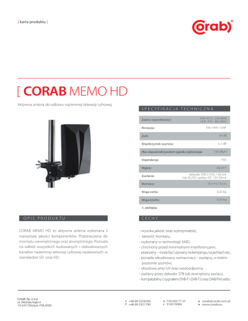 [ karta produktu ] [ CORAB MEMO HD Aktywna antena do odbioru naziemnej telewizji cyfrowej. SPECYFIKACJA TECHNICZNA VHF: 87,5 - 230 MHz UHF: 470 - 862 MHz Zakres częstotliwości: FM / VHF / UHF Recepcja: 30 dB Zysk: ≤ 2 dB Współczynnik szumów: Max. dopuszczalny poziom sygnału wyjściowego: 100 dBμV 75Ω Impendancja: złącze F Wyjście: Zasilanie: dekoder STB 5 V DC / 40 mA lub AC/DC zasilacz DC 12V 50mA Wymiary: 20 x 9 x 13 cm Waga netto: 0,32 kg Waga brutto: 0,39 kg Y_ANT0004 OPIS PRODUKTU CORAB MEMO HD to aktywna antena wykonana z najwyższej jakości komponentów. Przeznaczona do montażu wewnętrznego oraz zewnętrznego. Pozwala na odbiór wszystkich kodowanych i niekodowanych kanałów naziemnej telewizji cyfrowej nadawanych w standardzie SD oraz HD. Corab Sp. z o.o. ul. Michała Kajki 4 10-547 Olsztyn, POLAND CECHY - wysoka jakość oraz wytrzymałość, - łatwość montażu, - wykonany w technologii SMD, - chroniony przed minimalnymi interferencjami, - przenośny – może być używany na kempingu, na jachtach etc., - posiada wbudowany wzmacniacz - wydajny, o niskim poziomie szumów, - obudowa anty-UV oraz wodoodporna, - zasilany przez dekoder STB lub zewnętrzny zasilacz, - kompatybilny z sygnałem DVB-T i DVB-T2 oraz DAB/FM radio. t +48 89 5236592 f +48 89 5351790 n 739 020 77 57 r 510519084 e [email protected] u www.corab.eu