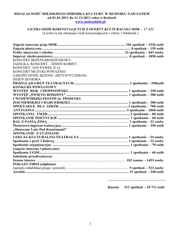 DZIAŁALNOŚĆ MIEJSKIEGO OŚRODKA KULTURY W RUDNIKU NAD SANEM od 01.01.2011 do 11.12.2011 roku w liczbach www.mokrudnik.pl LICZBA OSÓB KORZYSTAJĄCYCH Z OFERTY KULTURALNEJ MOK - 17 323 (Liczba ta nie obejmuje osób korzystających z oferty 3 bibliotek.) Zajęcia taneczne grup MOK ....................................................................... 101 spotkań – 2326 osób Zajęcia plastyczne .............................................................................................. 8 spotkań – 159 osób Próby muzyczne i szkolne........................................................................... 32 spotkania – 643 osoby Imprezy okolicznościowe:................................................................................ 8 spotkań – 1850 osób KONCERT BOŻONARODZENIOWY, JASEŁKA, KONCERT – DZIEŃ KOBIET , KONCERT- JAN PAWEŁ II x2 KONCERT MUZYKI POWAŻNEJ ZAKOŃCZENIE SEZONU ARTYSTYCZNEGO, DZIEŃ SENIORA PRZEGLĄD GRUP TEATRALNYCH .......................................................... 1 spotkanie – 250osób KONKURS POWIATOWY WYSTĘP ROK CHOPINOWSKI ............................................................... 1 spotkanie – 250 osób WYSTĘP „ŚWIĘTO RODZINY” ................................................................. 1 spotkanie – 300 osób I WOJEWÓDZKI FESTIWAL PIOSENKI ŻOŁNIERSKIEJ I HARCERSKIEJ ............................................................. 1 spotkanie – 200 osób SPEKTAKLE DLA SZKÓŁ ........................................................................ 3 spotkania - 700 osób ANTYGONA ................................................................................................ 4 spotkania – 1060 osób SPOTKANIA TMZR....................................................................................... 2 spotkania – 80 osób SPOTKANIE POETYCKIE ............................................................................ 1 spotkanie – 60 osób BAL Z PANIĄ ZIMĄ ...................................................................................... 1 spotkanie - 33 osoby Plenerowa impreza wakacyjna....................................................................... 1 spotkanie – 250 osób „Słoneczne Lato Pod Kasztanami” SPOTKANIE Z UCZNIAMI LEKCJA KULTURALNO-TEATRALNA ................................................... 1 spotkanie – 54 osoby Spotkanie z prof. Cholewą.............................................................................. 1 spotkanie – 32 osoby Spotkanie organizacyjne .................................................................................. 1 spotkanie – 70 osób (zajęcia taneczne i plastyczne) Spotkanie UGiM ............................................................................................... 1 spotkanie – 60 osób Szkolenie przedwyborcze Seanse kinowe ............................................................................................... 102 seanse – 1453 osoby POKAZY FIRM (odpłatne) (sprzętu rehabilitacyjnego, pościeli) ................................................................... 9 spotkań – 533 osoby Aerobic ............................................................................................................. 31 spotkań – 348 osób ………………………………………… Razem: 1 311 spotkań – 10 711 osób Działalność Centrum Wikliniarstwa 2011 w liczbach www.mokrudnik.pl Liczba sprzedanych biletów .................................................................................................. 2854 szt. Liczba osób zwiedzających nieodpłatnie .................................................................................... 1548 (m.in. nauczyciele i uczniowie szkół Gminy Rudnik nad Sanem, mieszkańcy Gminy ) Zwiedzający Centrum Wikliniarstwa w Rudniku nad Sanem korzystali również z pozostałych ofert Centrum: Pokaz wyplatania ..................................................................................................................... 38 osób Prezentacja multimedialna (odpłatna).................................................................................... 27 osób Prezentacja multimedialna (nieodpłatna) ............................................................................. 467 osób Warsztaty wikliniarskie......................................................................................................... 53 osoby Warsztaty wikliniarskie studentów I roku ............................................................................. 20 osób Instytutu Architektury Wnętrz Państwowej Wyższej Szkoły Wschodnioeuropejskiej w Przemyślu Wernisaże ............................................................................................................ 8 wystaw – 415 osób Spotkania z autorami wystaw w galerii Centrum Wikliniarstwa zorganizowane dla: ................................. 4 spotkania – 125 osób uczniów Publicznego Gimnazjum w Rudniku nad Sanem uczniów PSP nr 1 w Rudniku nad Sanem uczniów Publicznego Gimnazjum w Ulanowie dzieci z Przedszkola Miejskiego w Rudniku nad Sanem Spotkania Zarządu i Zespołu redakcyjnego TMZR: Spotkanie członków TMZR ............................................................................. 1 spotkanie – 40 osób Szkolenie dotyczące pozyskiwania ..................................................................... 1 spotkanie – 8 osób Środków z Europejskiego Funduszu Społecznego 2001 – 2013 Szkolenie Lokalnej Grupy Działania ............................................................... 1 spotkanie – 12 osób Stowarzyszenie „Partnerstwo dla Ziemi Niżańskiej” dotyczące naboru wniosków do „Małych Projektów” Spotkanie przedstawicieli placówek ................................................................. 2 spotkania – 27 osób oświatowo – wychowawczych przed imprezą „Wiklina 2011 Rudnik nad Sanem” Spotkanie przedwyborcze (wynajem sali).............................