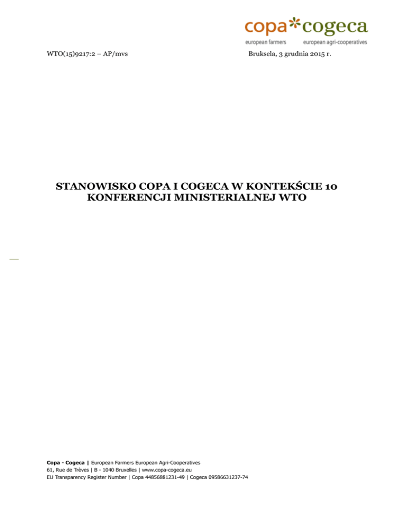 WTO(15)9217:2 – AP/mvs Bruksela, 3 grudnia 2015 r. STANOWISKO COPA I COGECA W KONTEKŚCIE 10 KONFERENCJI MINISTERIALNEJ WTO Copa - Cogeca | European Farmers European Agri-Cooperatives 61, Rue de Trèves | B - 1040 Bruxelles | www.copa-cogeca.eu EU Transparency Register Number | Copa 44856881231-49 | Cogeca 09586631237-74 STANOWISKO COPA I COGECA W KONTEKŚCIE 10 KONFERENCJI MINISTERIALNEJ WTO W 2001 r. członkowie WTO przyjęli d auhańską agend ę rozwoju, która była wielokrotnie zmieniana pod względem jej poziomu ambicji, aż w końcu w 2008 r. powrócono do klasycznych negocjacji nad rozd ziałami: d ostęp d o rynku, konkurencja eksportowa i ustanowienie zasad d la wsparcia krajowego. W 2013 r. d ziewiąta konferencja ministerialna WTO przyjęła porozumienie o ułatwieniach w hand lu, któremu towarzyszyła wola polityczna, by zamknąć rund ę d auhańską w oparciu o program prac. Nawet jeśli WTO w d alszym ciągu jest jed ynym systemem, który pozwala na prowad zenie globalnych negocjacji na temat wszystkich zakłóceń konkurencji na rynku światowym, zabrakło niestety woli politycznej. OCZEKIWANIA CO DO WNIOSKÓW Z DZIESIĄTEJ KONFERENCJI MINISTERIALNEJ WTO Ze względ u na smutny spad ek zainteresowania negocjacjami hand lowymi na szczeblu WTO, unijni rolnicy przypominają, że WTO nie może ograniczyć się d o pełnienia rolni organu nadzorującego polityki publiczne i rozstrzygającego spory. Dlatego też Copa i Cogeca pragną, aby d ziesiąta konferencja ministerialna d oprowad ziła d o podjęcia decyzji politycznych obowiązujących wszystkich członków WTO. Zniesienie wsparcia dla eksportu We wnioskach dziewiątej konferencji ministerialnej WTO przewidziano zwiększenie przejrzystości wszystkich środ ków związanych z filarem wsparcia d la eksportu. Wyd aje się, że jeszcze nie wszyscy członkowie WTO w takim samym stopniu wprowadzili to rozwiązanie. Negocjacje nad filarem konkurencji eksportowej oparte o wersję poprawioną (Genewa 2008 r.) zostały opracowane w sytuacji, gdy równowaga w rozdziale obejmującym rolnictwo była większa. Co więcej, Unia Europejska zaproponowała prawne od rzucenie stosowania d opłat wywozowych, jeśli wszyscy członkowie WTO również się na to zdecydują. Copa i Cogeca zachęcają więc wszystkich negocjatorów o stworzenie nowej równowagi w filarze obejmującym konkurencję eksportową poprzez zakazanie m. in. eksportu przez przedsiębiorstwa państwowe lub monopole, gdyż korzystają one de facto z bezpośredniego wsparcia dla eksportu. Kanad a i Australia również poczyniły postępy w tym zakresie. Dobrze by było, gd yby więcej partnerów przyjęło tę dynamikę. Poprawa kontroli środków antydumpingowych Sektor rolny w Unii Europejskiej stawia czoła intensyfikacji środków antydumpingowych. Środki antyd umpingowe negatywnie wpływają na rozwój hand lu i większość argumentów przemawiających za ich stosowaniem od nosi się d o wsparcia w ramach wspólnej polityki rolnej, która jest jednak zarejestrowana w WTO i nie stanowi przedmiotu żadnej krytyki. Konferencja ministerialna WTO powinna nie tylko zwiększyć przejrzystość środ ków antyd umpingowych, lecz również opracować wytyczne pozwalające na ograniczenie nad użyć. Wprowad zenie środ ków antyd umpingowych powinno być zakazane przed rzeczywistym stwierd zeniem wystąpienia przepływów hand lowych. Nie d opuściłoby to przed e wszystkim d o wyliczania zakresu zakłóceń konkurencji w oparciu o fikcyjne ceny. Tak to wygląd a na przykład w przypad ku środ ków antyd umpingowych nałożonych przez brazylijskie władze na mleko w proszku pochodzące z UE. WTO powinna stać się instancją narzucającą granice i badającą poszczególne przypadki, przed ich wejściem w życie, aby pozwolić członkom na ograniczenie środków krajowych, które mogą okazać się zaporą dla małych i średnich przedsiębiorstw. NAJWAŻNIEJSZE TEMATY DO KONFERENCJI WTO W NAIROBI OMÓWIENIA NA DZIESIĄTEJ W ramach d ziesiątej konferencji ministerialnej WTO powinna również pojawić się refleksja na temat wznowienia wielostronnych negocjacji handlowych. W związku z intensyfikacją negocjacji dwustronnych i regionalnych tylko jeden temat pozostaje w zawieszeniu - określenie kierunku rozwoju wsparcia wewnętrznego. Copa i Cogeca przypominają, że unijni rolnicy zgod zili się na przejście na wsparcie niepowiązane z prod ukcją. Równocześnie jed nak wielu członków WTO opracowało nowe formy wsparcia rolnictwa, które prowad zą d o zachwiania konkurencji. Jest to jed en z najważniejszych tematów, który powinien zostać poruszony w Nairobi. Kwestia wewnętrznego wsparcia obejmuje również kryteria uznania statusu kraju rozwijającego się. Copa i Cogeca zgad zają się, że należy wprowad zić jasne rozróżnienie w kategorii krajów rozwijających się. Wielu członków WTO stało się światowymi liderami produkcji rolnej, jednakże równocześnie chcą oni nad al korzystać z od stępstw w zakresie wsparcia d la hand lu prod uktami rolnymi przyznanych krajom rozwijającym się . Kraje należące do G20 nie powinny już cieszyć się tego typu wyjątkami. Unijni rolnicy i ich spółd zielnie pragną uznania wartości d od anej swoich prod uktów i jej skuteczniejszej ochrony na rynku światowym. Wymaga to również lepszej ochrony prawnej oznaczeń geograficznych. Copa i Cogeca pragną, by kwestia ta znalazła się w programie prac na okres po Nairobi. WKŁAD EUROPEJSKIEGO ROLNICTWA W OSIĄGNIĘ CIE CELÓW DAUHAŃSKIEJ AGENDY ROZWOJU Na zakończenie, należy przypomnieć, że od początku negocjacji unijne rolnictwo już w znacznym stopniu przyczyniło się d o osiągnięcia celów d auhańskiej agend y rozwoju. Jed ną z pierwszych inicjatyw było wprowad zenie kontyngentu taryfowego o zerowej stawce celnej (wszystko oprócz broni) d la krajów najmniej rozwiniętych. Na d zień d zisiejszy Unia Europejska importuje więcej produktów ro