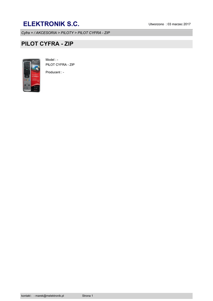 ELEKTRONIK S.C. Utworzono : 03 marzec 2017 Cyfra + / AKCESORIA > PILOTY > PILOT CYFRA - ZIP PILOT CYFRA - ZIP Model : PILOT CYFRA - ZIP Producent : - kontakt : - [email protected] Strona 1 ELEKTRONIK S.C. Utworzono : 03 marzec 2017 Cyfra + / AKCESORIA > PILOTY > PILOT CYFRA - ZIP PILOT CYFRA - ZIP kontakt : - [email protected] Strona 2 ELEKTRONIK S.C. Utworzono : 03 marzec 2017 Cyfra + / AKCESORIA > PILOTY > PILOT CYFRA - ZIP PILOT CYFRA - ZIP Wykaz marek telewizorów: ADMIRAL, AIWA, AKAI, AMSTRAD, ANITECH, AXXION, BANG & OLUFSEN, BEKO, BELSTAR, BESTAR, BIAZET, BLAUPUNKT, BLUE SKY, BLUE STAR, BOSCH, BRAND, BRAUN, BRIONVEGA, CASIO, CLATRONIC, CREATIVE, CURTIS, DAEWOO, DENON, ELEKTA, ELEKTRONICA, ELEMIS, ELTA, FERGUSON, FINLUX, FISHER, FUJITSU, FUNAI, GOLDSTAR, GOODMANS, GRANADA, GRUNDIG, HANSEATIC, HCM, HITACHI, HYUNDAI-LUXTRONIC, JVC, LEXUS, LG, LOEWE, MEDION, METZ, MIVAR, MORAVA, NAD, NEC, NECKERMANN, NEPTUN, NOKIA, NORDMENDE, OMEGA, ONWA, ORAVA, ORION, OTAKE, OTF, OTTO VERSAN, OVP, PALLADIUM, PANASONIC, PHILCO, PHILIPS, PHILIPS(F), PHOENIX, PIONEER, POLKOLOR, PRO VISION, QUELLE, ROYAL, ROYAL HCM, ROYAL LUX, SABA, SALORA, SAMSUNG, SANYO, SCHAUB LORENTZ, SCHNEIDER, SCOTT, SEG, SELECO, SHARP, SIEMENS, SIESTA, SKYTRONIC, SONY, SUPRA , SYRIUSZ, TCL, TEC, TECHNICS, TELEFUNKEN, TELESTAR, TENSAI, TESLA, TEVION, THOMSON, THORN, TOSHIBA, TRILUX, TRISTAR, ULTRAVOX, UNIMOR, UNIVERSU, VECTRA, VESTEL, VIDEOTON, WATSON, WESTA, YAMAHA. Cena : 0,00 zł Brutto ( 0,00 zł Netto) Dostępność: Produkt dostępny w naszym sklepie od 08 wrzesień 2010 kontakt : - [email protected] Strona 3