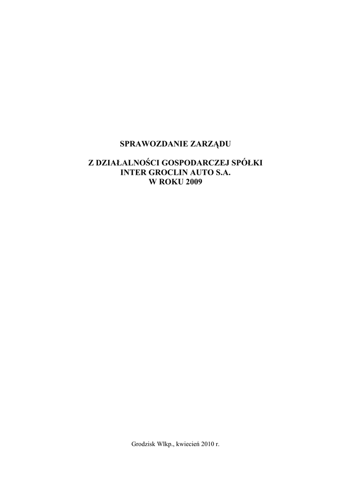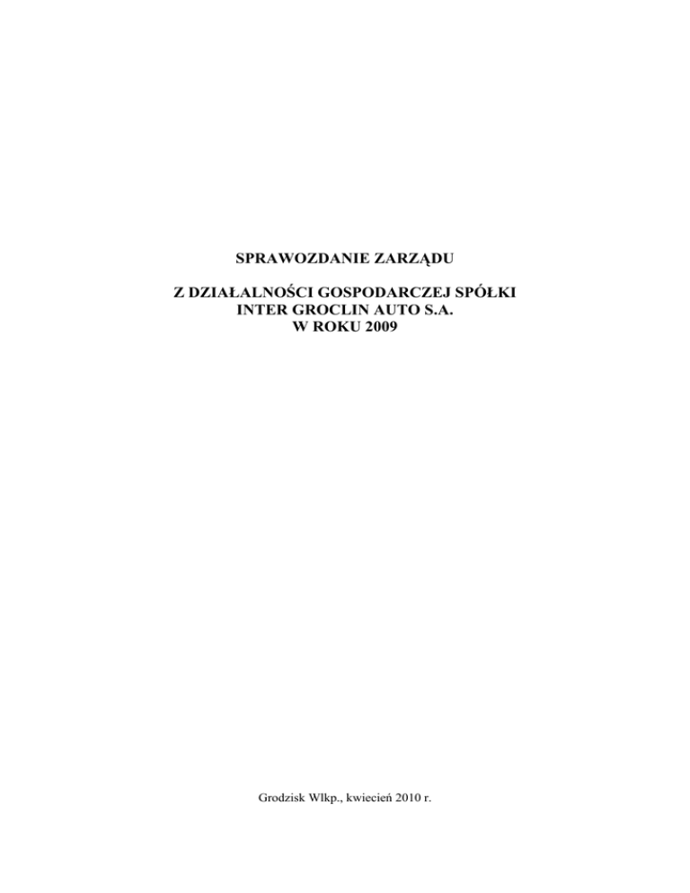 SPRAWOZDANIE ZARZĄDU Z DZIAŁALNOŚCI GOSPODARCZEJ SPÓŁKI INTER GROCLIN AUTO S.A. W ROKU 2009 Grodzisk Wlkp., kwiecień 2010 r. Inter Groclin Auto S.A. Sprawozdanie Zarządu SPIS TREŚCI str. nr 1. Podstawowe informacje o Inter Groclin Auto S.A. 4 1.1 Siedziba Inter Groclin Auto S.A. 4 1.2 Numer Statystyczny REGON 4 1.3 Numer Identyfikacji Podatkowej NIP 4 1.4 Forma prawna Inter Groclin Auto S.A. 4 1.5 Przepisy prawne, na podstawie których działa Inter Groclin Auto S.A. 4 1.6 Przedmiot działalności Inter Groclin Auto S.A. 4 1.7 Historia Inter Groclin Auto S.A. 5 2. Powiązania kapitałowe i organizacyjne Inter Groclin Auto S.A. 7 3. Działalność gospodarcza Inter Groclin Auto S.A. 8 3.1 Profil działalności Spółki 8 3.2 Podstawowe produkty i usługi Inter Groclin Auto S.A. 11 3.3 Wartość i struktura geograficzna przychodów ze sprzedaży 11 3.4 Główni odbiorcy i dostawcy Inter Groclin Auto S.A. 12 4. Inter Groclin Auto S.A. w liczbach. 15 4.1 Wyniki finansowe Spółki 15 4.2 Aktywa trwałe i obrotowe przedsiębiorstwa 20 4.3 Kapitały obce 23 5. Kapitał własny Inter Groclin Auto S.A. 24 5.1 Rodzaje i wielkości kapitałów 24 5.2 Umowy zawarte w ciągu ostatniego roku obrotowego, w wyniku których mogą w przyszłości nastąpić zmiany z proporcjach posiadanych akcji przez dotychczasowych akcjonariuszy. 25 6. Nakłady inwestycyjne przedsiębiorstwa 25 7. Nagrody i wyróżnienia za 2009 rok dla Inter Groclin Auto S.A. i jej Prezesa. 27 8. Umowy znaczące dla działalności spółki zawarte w 2009 r. 27 8.1 Umowy ubezpieczenia 27 8.2 Umowy o badanie sprawozdania finansowego 27 8.3. 28 Pozostałe umowy 9. Umowy kredytowe, poręczenia i gwarancje, których stroną jest Inter Groclin Auto S.A. 29 9.1 Umowy kredytowe, których stroną jest Inter Groclin Auto S.A. jako kredytobiorca 29 9.2 Poręczenia udzielone przez Inter Groclin Auto S.A. i gwarancje bankowe udzielone na zlecenie Spółki oraz pozostałe gwarancje. 30 9.3 Umowy pożyczki, których stroną jest Inter Groclin Auto S.A. jako pożyczkodawca 30 10. Transakcje nietypowe i nierutynowe, których charakter i warunki nie wynikają z bieżącej działalności operacyjnej z podmiotami powiązanymi, jeżeli jednorazowa lub łączna wartość kilku transakcji zawartych przez podmiot powiązany w okresie 12 miesięcy stanowi wyrażoną w złotych równowartość kwoty 500.000 EUR. 31 11. Oceny i prognozy Inter Groclin Auto S.A. dotyczące prowadzonej działalności 31 11.1 Zarządzanie zasobami finansowymi 31 11.2 Zewnętrzne i wewnętrzne czynniki istotne dla rozwoju przedsiębiorstwa oraz perspektywy rozwoju działalności gospodarczej. 34 11.3 Zmiany w podstawowych zasadach zarządzania Inter Groclin Auto S.A. i grupą kapitałową Inter Groclin Auto. 36 2 Inter Groclin Auto S.A. Sprawozdanie Zarządu 12.Oświadczenie o stosowaniu zasad ładu korporacyjnego przez Inter Groclin Auto S.A. w 2009r. 37 12.1. Stosowany w spółce system kontroli wewnętrznej i zarządzania ryzykiem w odniesieniu do procesu sporządzania sprawozdań finansowych. 38 12.2. Akcjonariusze posiadający co najmniej 5% ogólnej liczby głosów na Walnym Zgromadzeniu Akcjonariuszy Inter Groclin Auto S.A. wg stanu na dzień 27.04.2010 r. 39 12.3. Posiadacze wszelkich papierów wartościowych, które dają specjalne uprawnienia kontrolne oraz ograniczenia dotyczące wykonywania prawa głosu oraz przenoszenia prawa własności papierów wartościowych emitenta. 39 12.4. Organy zarządzające Spółką Inter Groclin Auto S.A. 39 12.5 . Zasady zmiany statutu spółki Inter Groclin Auto S.A. 46 13. Kapitał ludzki 46 14. Inter Groclin Auto S.A. na Giełdzie Papierów Wartościowych w Warszawie. 48 15. Wskazanie postępowań toczących się przed sądem, organem właściwym dla postępowania arbitrażowego lub organem administracji publicznej, które stanowią 10 % kapitałów własnych emitenta. 48 16. Sprawozdanie finansowe spółki 49 3 Inter Groclin Auto S.A. Sprawozdanie Zarządu 1. Podstawowe informacje o Inter Groclin Auto S.A. 1.1 Siedziba Inter Groclin Auto S.A. ul. Jeziorna 3, Karpicko 64-200 Wolsztyn telefon: +48 (68) 384 27 09, +48 (68) 384 36 92 fax: +48 (68) 384 27 09, +48 (68) 384 36 92 Zarząd: ul. Słowiańska 4 62-065 Grodzisk Wlkp. telefon: +48 (61) 44 36 111, +48 (61) 44 36 112 fax: +48 (61) 444 57 57 1.2 Numer Statystyczny REGON 970679408 1.3 Numer Identyfikacji Podatkowej NIP 923-002-60-02 1.4 Forma prawna Inter Groclin Auto S.A. Spółka Akcyjna – powstała 3 listopada 1997 r. w drodze przekształcenia spółki z ograniczoną odpowiedzialnością w spółkę akcyjną. Firma Inter Groclin Auto S.A. została wpisana do Krajowego Rejestru Sądowego dnia 29.10.2002 r. pod numerem 0000136069 prowadzonego przez Sąd Rejonowy w Poznaniu - Nowe Miasto i Wilda w Poznaniu, VIII Wydział Gospodarczy Krajowego Rejestru Sądowego. 1.5 Przepisy prawne, na podstawie których działa Inter Groclin Auto S.A. Kodeks spółek handlowych i Statut Spółki. 1.6 Przedmiot działalności Inter Groclin Auto S.A. Inter Groclin Auto S.A. jest jednym z największych w Europie producentów wyposażenia i akcesoriów samochodowych, wyspecjalizowanym w najbardziej zaawansowanej technologicznie obróbce skóry naturalnej. Firma należy do czołowych w Polsce producentów wyposażenia i akcesoriów samochodowych, w tym głównie poszyć foteli samochodowych, foteli samochodowych wykonanych ze skór naturalnych i fotelików dziecięcych do samochodów. Od listopada 1998 roku Spółka prowadzi również działalność hotelarską wraz z pełnym pakietem usług sportowo-rehabilitacyjnych. Od lipca 2008 r. Inter Groclin Auto jest właścicielem 4 Inter Groclin Auto S.A. Sprawozdanie Zarządu Przychodni Lekarskiej Groclin oraz obiektów sportowo rekreacyjnych należących wcześniej do Groclin Dyskobolia SSA. Działalność gospodarcza Spółki realizowana jest w następujących jednostkach organizacyjnych przedsiębiorstwa: ¾ Zakład Produkcyjny Nr 1 w Karpicku, ul.