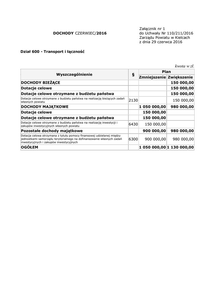 Załącznik nr 1 do Uchwały Nr 110/211/2016 Zarządu Powiatu w Kielcach z dnia 29 czerwca 2016 DOCHODY CZERWIEC/2016 Dział 600 - Transport i łączność kwota w zł. Wyszczególnienie § DOCHODY BIEŻĄCE Plan Zmniejszenie Zwiększenie 150 000,00 Dotacje celowe Dotacje celowe otrzymane z budżetu państwa Dotacje celowe otrzymane z budżetu państwa na realizację bieżących zadań własnych powiatu 150 000,00 150 000,00 2130 DOCHODY MAJĄTKOWE Dotacje celowe 1 050 000,00 150 000,00 Dotacje celowe otrzymane z budżetu państwa Dotacje celowe otrzymane z budżetu państwa na realizację inwestycji i zakupów inwestycyjnych własnych powiatu OGÓŁEM 980 000,00 150 000,00 6430 Pozostałe dochody majątkowe Dotacja celowa otrzymana z tytułu pomocy finansowej udzielanej między jednostkami samorządu terytorialnego na dofinansowanie własnych zadań inwestycyjnych i zakupów inwestycyjnych 150 000,00 6300 150 000,00 900 000,00 980 000,00 900 000,00 980 000,00 1 050 000,00 1 130 000,00 Załącznik nr 1 do Uchwały Nr 110/211/2016 Zarządu Powiatu w Kielcach z dnia 29 czerwca 2016 DOCHODY CZERWIEC/2016 Dział 600 - Transport i łączność Rozdział 60014 - Drogi publiczne powiatowe kwota w zł. Wyszczególnienie § Plan Zmniejszenie Zwiększenie DOCHODY BIEŻĄCE 150 000,00 Dotacje celowe Dotacje celowe otrzymane z budżetu państwa 150 000,00 150 000,00 Dotacje celowe otrzymane z budżetu państwa na realizację bieżących zadań własnych powiatu 2130 DOCHODY MAJĄTKOWE Dotacje celowe 1 050 000,00 150 000,00 Dotacje celowe otrzymane z budżetu państwa Dotacje celowe otrzymane z budżetu państwa na realizację inwestycji i zakupów inwestycyjnych własnych powiatu OGÓŁEM 980 000,00 150 000,00 6430 Pozostałe dochody majątkowe Dotacja celowa otrzymana z tytułu pomocy finansowej udzielanej między jednostkami samorządu terytorialnego na dofinansowanie własnych zadań inwestycyjnych i zakupów inwestycyjnych 150 000,00 6300 150 000,00 900 000,00 980 000,00 900 000,00 980 000,00 1 050 000,00 1 130 000,00 Załącznik nr 1 do Uchwały Nr 110/211/2016 Zarządu Powiatu w Kielcach z dnia 29 czerwca 2016 DOCHODY CZERWIEC/2016 Dział 710 - Działalność usługowa kwota w zł. Wyszczególnienie § DOCHODY BIEŻĄCE Plan Zmniejszenie Zwiększenie 10 000,00 Dotacje celowe 10 000,00 Dotacje celowe otrzymane z budżetu państwa 10 000,00 Dotacje celowe otrzymane z budżetu państwa na zadania bieżące z zakresu administracji rządowej oraz inne zadania zlecone ustawami realizowane przez powiat OGÓŁEM 2110 10 000,00 10 000,00 Załącznik nr 1 do Uchwały Nr 110/211/2016 Zarządu Powiatu w Kielcach z dnia 29 czerwca 2016 DOCHODY CZERWIEC/2016 Dział 710 - Działalność usługowa Rozdział 71015 - Nadzór budowlany kwota w zł. Wyszczególnienie § Plan Zmniejszenie Zwiększenie DOCHODY BIEŻĄCE 10 000,00 Dotacje celowe Dotacje celowe otrzymane z budżetu państwa 10 000,00 10 000,00 Dotacje celowe otrzymane z budżetu państwa na zadania bieżące z zakresu administracji rządowej oraz inne zadania zlecone ustawami realizowane przez powiat OGÓŁEM 2110 10 000,00 10 000,00 Załącznik nr 1 do Uchwały Nr 110/211/2016 Zarządu Powiatu w Kielcach z dnia 29 czerwca 2016 DOCHODY CZERWIEC/2016 Dział 755 - Wymiar sprawiedliwości kwota w zł. Wyszczególnienie § DOCHODY BIEŻĄCE Plan Zmniejszenie Zwiększenie 41 200,00 Dotacje celowe 41 200,00 Dotacje celowe otrzymane z budżetu państwa 41 200,00 Dotacje celowe otrzymane z budżetu państwa na zadania bieżące z zakresu administracji rządowej oraz inne zadania zlecone ustawami realizowane przez powiat OGÓŁEM 2110 41 200,00 41 200,00 Załącznik nr 1 do Uchwały Nr 110/211/2016 Zarządu Powiatu w Kielcach z dnia 29 czerwca 2016 DOCHODY CZERWIEC/2016 Dział 755 - Wymiar sprawiedliwości Rozdział 75515 - Nieodpłatna pomoc prawna kwota w zł. Wyszczególnienie § Plan Zmniejszenie Zwiększenie DOCHODY BIEŻĄCE 41 200,00 Dotacje celowe Dotacje celowe otrzymane z budżetu państwa 41 200,00 41 200,00 Dotacje celowe otrzymane z budżetu państwa na zadania bieżące z zakresu administracji rządowej oraz inne zadania zlecone ustawami realizowane przez powiat OGÓŁEM 2110 41 200,00 41 200,00 Załącznik nr 1 do Uchwały Nr 110/211/2016 Zarządu Powiatu w Kielcach z dnia 29 czerwca 2016 DOCHODY CZERWIEC/2016 Dział 801 - Oświata i wychowanie kwota w zł. Wyszczególnienie § DOCHODY BIEŻĄCE Plan Zmniejszenie Zwiększenie 4 980,00 Dotacje celowe 4 980,00 Dotacje celowe otrzymane z budżetu państwa 4 980,00 Dotacje celowe otrzymane z budżetu państwa na zadania bieżące z zakresu administracji rządowej oraz inne zadania zlecone ustawami realizowane przez powiat OGÓŁEM 2110 4 980,00 4 980,00 Załącznik nr 1 do Uchwały Nr 110/211/2016 Zarządu Powiatu w Kielcach z dnia 29 czerwca 2016 DOCHODY CZERWIEC/2016 Dział 801 - Oświata i wychowanie Rozdział 80102 - Szkoły podstawowe specjalne kwota w zł. Wyszczególnienie § Plan Zmniejszenie Zwiększenie DOCHODY BIEŻĄCE 1 130,00 Dotacje celowe Dotacje celowe otrzymane z budżetu państwa 1 130,00 1 130,00 Dotacje celowe otrzymane z budżetu państwa na zadania bieżące z zakresu administracji rządowej oraz inne zadania zlecone ustawami realizowane przez powiat OGÓŁEM 2110 1 130,00 1 130,00 Załącznik nr 1 do Uchwały Nr 110/211/2016 Zarządu Powiatu w Kielcach z dnia 29 czerwca 2016 DOCHODY CZERWIEC/2016 Dział 801 - Oświata i wychowanie Rozdział 80111 - Gimnazja specjalne kwota w zł. Wyszczególnienie § Plan Zmniejszenie Zwiększenie DOCHODY BIEŻĄCE 3 850,00 Dotacje celowe Dotacje celowe otrzymane z budżetu państwa 3 850,00 3 850,00 Dotacje celowe otrzymane z budżetu państwa na zadania bieżące z zakresu administracji rządowej oraz inne zadania zlecone ustawami realizowane przez powiat OGÓŁEM 2110 3 850,00 3 850,00