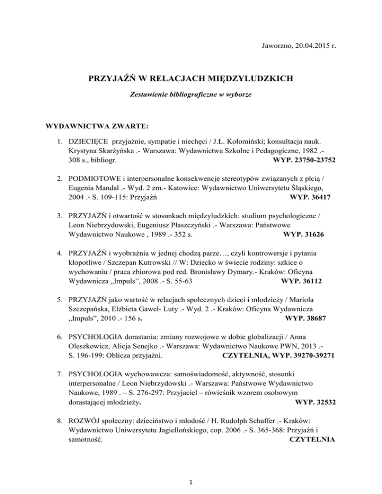 Jaworzno, 20.04.2015 r. PRZYJAŹŃ W RELACJACH MIĘDZYLUDZKICH Zestawienie bibliograficzne w wyborze WYDAWNICTWA ZWARTE: 1. DZIECIĘCE przyjaźnie, sympatie i niechęci / J.Ł. Kołomiński; konsultacja nauk. Krystyna Skarżyńska .- Warszawa: Wydawnictwa Szkolne i Pedagogiczne, 1982 .308 s., bibliogr. WYP. 23750-23752 2. PODMIOTOWE i interpersonalne konsekwencje stereotypów związanych z płcią / Eugenia Mandal .- Wyd. 2 zm.- Katowice: Wydawnictwo Uniwersytetu Śląskiego, 2004 .- S. 109-115: Przyjaźń WYP. 36417 3. PRZYJAŹŃ i otwartość w stosunkach międzyludzkich: studium psychologiczne / Leon Niebrzydowski, Eugeniusz Płaszczyński .- Warszawa: Państwowe Wydawnictwo Naukowe , 1989 .- 352 s. WYP. 31626 4. PRZYJAŹŃ i wyobraźnia w jednej chodzą parze…, czyli kontrowersje i pytania kłopotliwe / Szczepan Kutrowski // W: Dziecko w świecie rodziny: szkice o wychowaniu / praca zbiorowa pod red. Bronisławy Dymary.- Kraków: Oficyna Wydawnicza „Impuls”, 2008 .- S. 55-63 WYP. 36112 5. PRZYJAŹŃ jako wartość w relacjach społecznych dzieci i młodzieży / Mariola Szczepańska, Elżbieta Gaweł- Luty .- Wyd. 2 .- Kraków: Oficyna Wydawnicza „Impuls”, 2010 .- 156 s. WYP. 38687 6. PSYCHOLOGIA dorastania: zmiany rozwojowe w dobie globalizacji / Anna Oleszkowicz, Alicja Senejko .- Warszawa: Wydawnictwo Naukowe PWN, 2013 .S. 196-199: Oblicza przyjaźni. CZYTELNIA, WYP. 39270-39271 7. PSYCHOLOGIA wychowawcza: samoświadomość, aktywność, stosunki interpersonalne / Leon Niebrzydowski .- Warszawa: Państwowe Wydawnictwo Naukowe, 1989 . – S. 276-297: Przyjaciel – rówieśnik wzorem osobowym dorastającej młodzieży. WYP. 32532 8. ROZWÓJ społeczny: dzieciństwo i młodość / H. Rudolph Schaffer .- Kraków: Wydawnictwo Uniwersytetu Jagiellońskiego, cop. 2006 .- S. 365-368: Przyjaźń i samotność. CZYTELNIA 1 9. W TROSCE o wartości: funkcje przyjaźni oraz obraz przyjaciela wśród późnych adolescentów w perspektywie uniwersaliów aksjologicznych / Edyta Charzyńska, Joanna Góźdź // W: Dzieci i młodzież w niegościnnym świecie: zagrożenia rozwojowe i społeczne / pod red. nauk. Ewy Wysockiej .- Warszawa: Wydawnictwo Akademickie „Żak”, cop. 2012 .- S. 275-301 CZYTELNIA, WYP. 39317 10. ZNAJOMOŚĆ , koleżeństwo, przyjaźń: dynamizm ewoluowania więzi emocjonalnej / red. nauk. Alicja Żywczok .- Warszawa: Wydawnictwo Akademickie „Żak”, 2014.312 s. WYP. 39660 WYDAWNICTWA CIĄGŁE: 11. BYŁEM nieszczęśliwy bez ciebie: scenariusz zajęć dla klas IV-V szkoły podstawowej / Bożena Wierczińska // Biblioteka w Szkole .- 2006, nr 4, s.9 12. CHCĘ być przyjacielem / Barbara Goryl // Wychowawca .- 1998, nr 4, s. 22-23 13. CO to jest przyjaźń? / Jan Czechowski // Wychowanie w Przedszkolu .- 2009, nr 6, s.37-39 14. FENOMEN przyjaźni w życiu kobiety i w życiu mężczyzny / Magdalena Siuta // Kultura i Edukacja .- 2004, nr 1, s. 56-69, bibliogr. 15. JAK ważny jest przyjaciel?: scenariusz zajęć z elementami biblioterapii dla uczniów przedszkola i szkoły podstawowej / Edyta Lachowska // Poradnik Bibliotekarza .2011, nr 7-8, s. 51-52 16. JAK zostać przyjacielem i znaleźć przyjaciela / Maria Stabrawa // Wychowawca .1998, nr 4, s. 24 17. JEŚLI chcesz być przyjacielem, bądź wart przyjaźni: scenariusz zajęć świetlicowych / Małgorzata Namsołek // Świetlica w Szkole.-2009,nr 4, s. 27 18. KOLEŻEŃSTWO i przyjaźń w grupie wychowawczej / Janina Jeziorska // Problemy Opiekuńczo-Wychowawcze .- 1985, nr 2, s. (43)-(47) wkładka metodyczna: Przysposobienie do życia w rodzinie 19. MŁODZIEŻ o koleżeństwie i przyjaźni / oprac. J. Chełmiński i D. Szymańska // Problemy Opiekuńczo-Wychowawcze .- 1985, nr 2, s. (51)-(62) wkładka metodyczna: Przysposobienie do życia w rodzinie 20. O KONFLIKCIE w przyjaźni (konspekt zajęć wychowawczych dla gimnazjum) / Wojciech Trzaskowski // Drama .- 2004, z. 47, s.16-18 21. POCHWAŁA przyjaźni / Józef Augustyn // Wychowawca .- 2005, nr 6, s. 16-17 22. PROBLEMY przyjaźni wśród młodzieży o zaburzonym zachowaniu / Leon Niebrzydowski // Problemy Opiekuńczo-Wychowawcze.- 1993, nr 3, s. (34)-(37) wkładka metodyczna 23. PRZEPIS na przyjaźń – scenariusz zajęć dla klasy III / Katarzyna Pytlewska // Życie Szkoły .- 2013, nr 7, s. 20-21 2 24. PRZYJACIEL - rówieśnik, wzorem osobowym dorastającej młodzieży / Leon Niebrzydowski // Problemy Opiekuńczo-Wychowawcze .- 1989, nr 6,s.(162)-(171) wkładka metodyczna: Przysposobienie do życia w rodzinie 25. PRZYJACIELE – jedna dusza w dwóch ciałach. Dzień Przyjaciela: scenariusz zajęć świetlicowych dla dzieci z klas 2-3 / Agata Tęcza-Tuszakowska // Świetlica w Szkole .- 2012, nr 1, s. 11 26. PRZYJAŹŃ – niezbędna, popularność – pożądana / Joanna Kułakowska // Psychologia w Szkole .- 2014, nr 4, s. 35-42 27. PRZYJAŹŃ a wychowanie / Jan Czechowski // Wychowawca .- 2006, nr 10, s. 12-13, bibliogr. 28. PRZYJAŹŃ i konflikty / Małgorzata Cywińska // Życie Szkoły .- 2005, nr 1, s. 4-9 29. PRZYJAŹŃ w percepcji wychowanków domu dziecka / Piotr Napierski // Wychowanie na co Dzień .- 1997, nr 10/11, s. 24-26 30. PRZYJAŹŃ w szkole – przejawy „kapitału społecznego” w wieku szkolnym / Łukasz Dąbrowski .// Dyrektor Szkoły .- 2008, nr 2, s. 36-39 31. PRZYJAŹŃ w wychowaniu // Wychowawca .- 2011, nr 1 (cały numer) 32. RELACJE z przyjaciółmi a jakość życia gimnazjalistów / Agnieszka MałkowskaSzkutnik // Remedium .- 2012, nr 5, s. 6-7 33. ŚWIETLICOWE zabawy interakcyjne wspomagające zdobywanie przyjaciół / Monika Kulka // Świetlica w Szkole .- 2014, nr 2, s. 3-4 34. W KAŻDYM jest coś dobrego. Dzień Przyjaciela: scenariusz imprezy świetlicowej / Agnieszka Mateja // Świetlica w Szkole .- 2011, nr 2, s. 20 35. WZMACNIANIE pozytywne jako metoda wychowania w przyjaźni. Z badań nad literaturą dla dzieci / Jan Czechowski // Wychowanie na co Dzień .- 2009, nr 1-2, s. VII-XI (wkładka metodyczna) 36. ZNACZENI