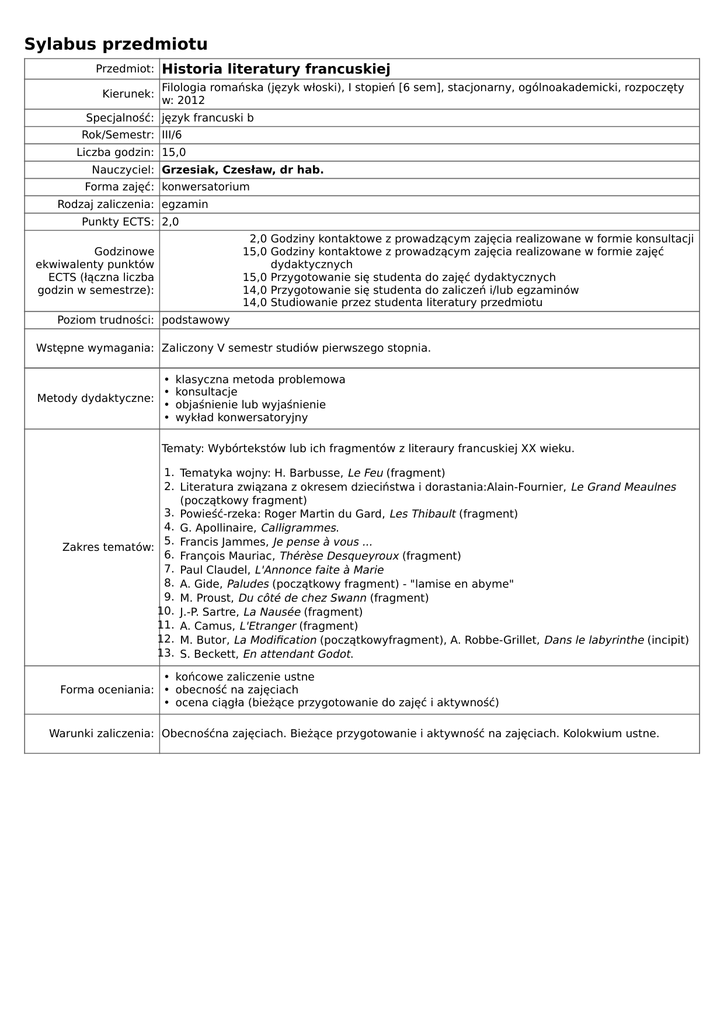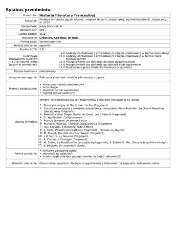 Sylabus przedmiotu Przedmiot: Historia literatury francuskiej Filologia romańska (język włoski), I stopień [6 sem], stacjonarny, ogólnoakademicki, rozpoczęty Kierunek: w: 2012 Specjalność: język francuski b Rok/Semestr: III/6 Liczba godzin: 15,0 Nauczyciel: Grzesiak, Czesław, dr hab. Forma zajęć: konwersatorium Rodzaj zaliczenia: egzamin Punkty ECTS: 2,0 2,0 Godziny kontaktowe z prowadzącym zajęcia realizowane w formie konsultacji 15,0 Godziny kontaktowe z prowadzącym zajęcia realizowane w formie zajęć dydaktycznych 15,0 Przygotowanie się studenta do zajęć dydaktycznych 14,0 Przygotowanie się studenta do zaliczeń i/lub egzaminów 14,0 Studiowanie przez studenta literatury przedmiotu Godzinowe ekwiwalenty punktów ECTS (łączna liczba godzin w semestrze): Poziom trudności: podstawowy Wstępne wymagania: Zaliczony V semestr studiów pierwszego stopnia. • • Metody dydaktyczne: • • klasyczna metoda problemowa konsultacje objaśnienie lub wyjaśnienie wykład konwersatoryjny Tematy: Wybórtekstów lub ich fragmentów z literaury francuskiej XX wieku. 1. Tematyka wojny: H. Barbusse, Le Feu (fragment) 2. Literatura związana z okresem dzieciństwa i dorastania:Alain-Fournier, Le Grand Meaulnes (początkowy fragment) 3. Powieść-rzeka: Roger Martin du Gard, Les Thibault (fragment) 4. G. Apollinaire, Calligrammes. 5. Francis Jammes, Je pense à vous ... Zakres tematów: 6. François Mauriac, Thérèse Desqueyroux (fragment) 7. Paul Claudel, L'Annonce faite à Marie 8. A. Gide, Paludes (początkowy fragment) - "lamise en abyme" 9. M. Proust, Du côté de chez Swann (fragment) 10. J.-P. Sartre, La Nausée (fragment) 11. A. Camus, L'Etranger (fragment) 12. M. Butor, La Modification (początkowyfragment), A. Robbe-Grillet, Dans le labyrinthe (incipit) 13. S. Beckett, En attendant Godot. • końcowe zaliczenie ustne Forma oceniania: • obecność na zajęciach • ocena ciągła (bieżące przygotowanie do zajęć i aktywność) Warunki zaliczenia: Obecnośćna zajęciach. Bieżące przygotowanie i aktywność na zajęciach. Kolokwium ustne. Modułowe efekty kształcenia realizowane w ramach przedmiotu: 01 Ma podstawową wiedzę o prądach, kierunkach rozwoju i gatunkach literackich oraz ich głównych przedstawicielach i najważniejszych dziełach literackich 02 Zna podstawowe pojęcia literaturoznawcze 03 Ma uporządkowaną wiedzę z zakresu literatury francuskiej 04 Zna i rozumie podstawowe metody analizy i interpretacji różnych tekstów literackich 05 Potrafi rozpoznać, scharakteryzować i zanalizować różne teksty literackie pod względem rodzajowym i gatunkowym 06 Właściwie rozumie, analizuje i interpretuje omawiane zagadnienia literackie 07 Potrafi porównać problematykę dzieł różnych autorów oraz sformułować odpowiednie wnioski 08 Potrafi porozumieć się przy pomocy różnych kanałów i technik komunikacyjnych w języku polskim i francuskim, operując podstawowymi pojęciami z zakresu literaturoznawstwa 09 Posiada umiejętność spójnej wypowiedzi ustnej i pisemnej, o różnej długości, w zakresie prezentowanej tematyki literackiej 10 Posiada świadomość poziomu swojej wiedzy w zakresie historii literatury francuskiej i jest przygotowany do samodzielnego jej pogłębiania i aktualizowania 11 Potrafi ukierunkować i rozwijać swoje zainteresowania literackie 12 Docenia oraz pielęgnuje tradycję i dziedzictwo literackie krajów francuskiego obszaru językowego 13 Posiada aktywną postawę badacza i czytelnika literatury francuskojęzycznej. Wykazuje potrzebę uczestniczenia w życiu kulturalnym i literackim; bierze udział w spotkaniach literackich. 1. A. Lagarde, L. Michard, XXe siècle,Paris, Bordas, 1965. 2. P.Brunel et al., Histoire de la littérature française: XIXe et XXe siècle , Paris, Bordas,1986. 3. J: Bersani, M. Autrand, J. Lecarme, B. Vercier; La littérature en France de 1945 à 1968; Paris, Bordas, 1980, 1982. 4. K. Dybeł, B. Marczuk, J. Prokop, Historialiteratury francuskiej, Warszaw, Wydawnictwo Literatura: NaukowePWN, 2005. 5. J. Falicki, "Literatura francuska XX wieku", [w:] Dzieje literatur europejskich, t. 1, pod red. Władysława Floryana, Warszawa, PWN, 1977, ss. 771-842. 6. B. Vercier, J. Lecarme, La littérature en France depuis 1968, Paris, Bordas, 1982. 7. R. Eluerd, Anthologie de la littérature française, Paris, Larousse, 1985. Konsultacje: piątek, godz.: 10-12, pokój 413 (Nowa Humanistyka) Dodatkowe informacje: E-mail (w Instytucie Filologii Romańskiej): [email protected] E-mail (domowy): [email protected]