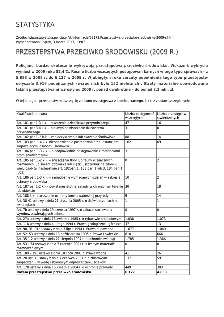 STATYSTYKA Źródło: http://statystyka.policja.pl/st/informacje/53172,Przestepstwa-przeciwko-srodowisku-2009-r.html Wygenerowano: Piątek, 3 marca 2017, 13:07 PRZESTĘPSTWA PRZECIWKO ŚRODOWISKU (2009 R.) Policjanci bardzo skutecznie wykrywają przestępstwa przeciwko środowisku. Wskaźnik wykrycia wyniósł w 2009 roku 82,4 %. Rośnie liczba wszczętych postępowań karnych w tego typu sprawach – z 5.883 w 2008 r. do 6.127 w 2009 r. W ubiegłym roku zarzuty popełnienia tego typu przestępstw usłyszało 3.916 podejrzanych (wśród nich było 152 nieletnich). Straty materialne spowodowane takimi przestępstwami wzrosły od 2008 r. ponad dwukrotnie – do ponad 3,2 mln. zł. W tej kategorii przestępstw mieszczą się zarówno przestępstwa z kodeksu karnego, jak też z ustaw szczególnych: Kwalifikacja prawna Art. 181 par 1-3 k.k. – niszczenie dziedzictwa przyrodniczego Art. 181 par 3-4 k.k. – nieumyślne niszczenie dziedzictwa przyrodniczego Art. 182 par 1–2 k.k. – zanieczyszczenie lub skażenie środowiska Art. 183 par. 1-4 k.k. nieodpowiednie postępowanie z substancjami zagrażającymi osobom i środowisku Art. 184 par. 1-3 k.k. – nieodpowiednie postępowanie z materiałami promieniotwórczymi Art. 185 par. 1-2 k.k. – zniszczenia flory lub fauny w znacznych rozmiarach lub śmierć człowieka lub ciężki uszczerbek na zdrowiu wielu osób (w następstwie art. 182par. 1, 183 par. 1 lub 3, 184 par. 1 lub2) Art. 186 par. 1-3 k.k. – zaniedbanie wymaganych działań w zakresie ochrony środowiska Art. 187 par 1-2 k.k.- powstanie istotnej szkody w chronionym terenie lub obiekcie Art. 188 k.k.- naruszenie ochrony konserwatorskiej przyrody Art. 38-41 ustawy z dnia 21 stycznia 2005 r. o doświadczeniach na zwierzętach Art. 7b ustawy z dnia 19 czerwca 1997 r. o zakazie stosowania wyrobów zawierających azbest Art. 27a ustawy z dnia 18 kwietnia 1985 r. o rybactwie śródlądowym Art. 118 ustawy z dnia 4 lutego 1994 r. Prawo geologiczne i górnicze Art. 90, 91, 91a ustawy z dnia 7 lipca 1994 r. Prawo budowlane Art. 52- 53 ustawy z dnia 13 października 1995 r. Prawo Łowieckie Art. 35 1-2 ustawy z dnia 21 sierpnia 1997 r. o ochronie zwierząt Art. 53 – 54 ustawy z dnia 7 czerwca 2001 r. o leśnym materiale rozmnożeniowym Art. 189 – 191 ustawy z dnia 18 lipca 2001 r. Prawo wodne Art. 28 ust. 4 ustawy z dnia 7 czerwca 2001 r. o zbiorowym zaopatrzeniu w wodę i zbiorowym odprowadzaniu ścieków Art. 128 ustawy z dnia 16 kwietnia 2004 r. o ochronie przyrody Razem przestępstwa przeciwko środowisku Liczba postępowań wszczętych 47 3 Liczba przestępstw stwierdzonych 16 0 88 162 14 69 3 1 0 2 10 2 30 18 9 1 14 1 0 0 1.038 37 1.677 610 1.785 0 1.073 13 1.080 666 1.386 0 41 137 26 59 449 6.127 393 4.833 Ocena: 3/5 (2) Tweetnij przestępstwa przeciwko środowisku
