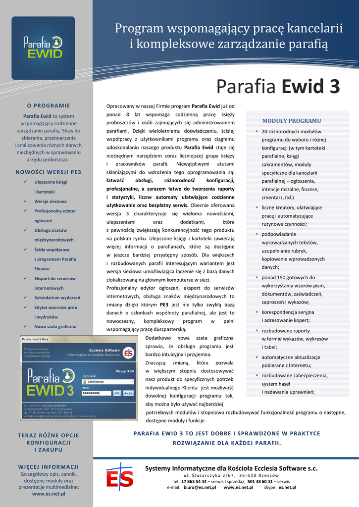 potrzebnych modułów Program wspomagający pracę kancelarii programu o następne, dostępne moduły i funkcje. i kompleksowe zarządzanie parafią i stopniowo rozbudowywad funkcjonalnośd Parafia Ewid 3 O PR OGR AM IE Opracowany w naszej Firmie program Parafia Ewid już od Parafia Ewid to system wspomagający codzienne zarządzanie parafią. Służy do zbierania, przetwarzania i analizowania różnych danych, niezbędnych w sprawowaniu urzędu proboszcza.. ponad 8 lat wspomaga codzienną pracę księży proboszczów i osób zajmujących się administrowaniem MODUŁY PROGRAMU parafiami. Dzięki wieloletniemu doświadczeniu, ścisłej 20 różnorodnych modułów N OWOŚCI WER SJI PE3 skłaniającymi do wdrożenia tego oprogramowania są: łatwośd obsługi, różnorodnośd konfiguracji, specyficzne dla kancelarii parafialnej – ogłoszenia, profesjonalne, a zarazem łatwe do tworzenia raporty i statystyki, liczne automaty ułatwiające codzienne użytkowanie oraz bezpłatny serwis. Obecnie oferowana wersja 3 charakteryzuje się wieloma nowościami, intencje mszalne, finanse, cmentarz, itd.) Ulepszone księgi i kartoteki Wersja sieciowa Profesjonalny edytor ogłoszeo Obsługa znaków międzynarodowych Ścisła współpraca z programem Parafia Finanse współpracy z użytkownikami programu oraz ciągłemu udoskonalaniu naszego produktu Parafia Ewid staje się niezbędnym narzędziem coraz liczniejszej grupy księży i pracowników parafii. Niewątpliwymi atutami ulepszeniami oraz dodatkami, które z pewnością zwiększają konkurencyjnośd tego produktu na polskim rynku. Ulepszone księgi i kartoteki zawierają więcej informacji o parafianach, które są dostępne w jeszcze bardziej przystępny sposób. Dla większych i rozbudowanych parafii interesującym wariantem jest internetowych wersja sieciowa umożliwiająca łączenie się z bazą danych zlokalizowaną na głównym komputerze w sieci. Profesjonalny edytor ogłoszeo, eksport do serwisów Kalendarium wydarzeo internetowych, obsługa znaków międzynarodowych to Edytor wzorców pism zmiany dzięki którym PE3 jest nie tylko zwykłą bazą danych o członkach wspólnoty parafialnej, ale jest to Eksport do serwisów i wydruków Nowa szata graficzna nowoczesny, kompleksowy program w pełni wspomagający pracę duszpasterską. Dodatkowo nowa szata graficzna sprawia, że obsługa programu jest bardzo intuicyjna i przyjemna. Znaczącą zmianą, która pozwala w większym stopniu dostosowywad nasz produkt do specyficznych potrzeb indywidualnego Klienta jest możliwośd dowolnej konfiguracji programu tak, programu do wyboru i różnej konfiguracji (w tym kartoteki parafialne, księgi sakramentów, moduły liczne kreatory, ułatwiające pracę i automatyzujące rutynowe czynności; podpowiadanie wprowadzanych tekstów, uzupełnianie rubryk, kopiowanie wprowadzonych danych; ponad 150 gotowych do wykorzystania wzorów pism, dokumentów, zaświadczeo, zaproszeo i wykazów; korespondencja seryjna i adresowanie kopert; rozbudowane raporty w formie wykazów, wykresów i tabel; automatyczne aktualizacje pobierane z Internetu; rozbudowane zabezpieczenia, system haseł i nadawania uprawnieo; aby można było używad najbardziej potrzebnych modułów i stopniowo rozbudowywad funkcjonalnośd programu o następne, dostępne moduły i funkcje. TER AZ R ÓŻN E OPCJE KON FIGUR ACJI I ZAKUPU WIĘCEJ IN FOR M ACJI Szczegółowy opis, cennik, dostępne moduły oraz prezentacje multimedialne: www.es.net.pl PARAFI A EWID 3 TO JEST DOBRE I SPRAWDZONE W PRAKTYCE ROZWIĄZANI E DLA KAŻDEJ PARAF II. Systemy Informatyczne dla Kościoła Ecclesia Software s.c. ul. Śl usarcz yka 2/67 , 35 -5 10 Rz esz ów tel.: 17 863 54 44 – serwis I sprzedaż, 501 48 60 41 – serwis e-mail: [email protected] www.es.net.pl skype: es.net.pl