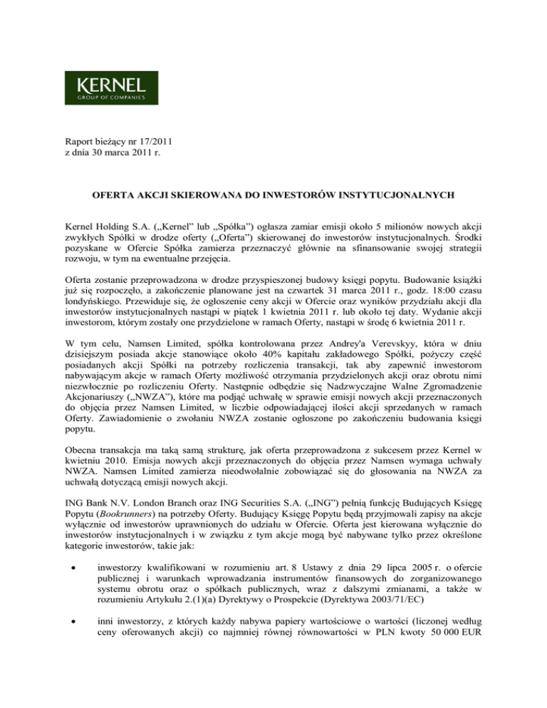 Raport bieżący nr 17/2011 z dnia 30 marca 2011 r. OFERTA AKCJI SKIEROWANA DO INWESTORÓW INSTYTUCJONALNYCH Kernel Holding S.A. („Kernel” lub „Spółka”) ogłasza zamiar emisji około 5 milionów nowych akcji zwykłych Spółki w drodze oferty („Oferta”) skierowanej do inwestorów instytucjonalnych. Środki pozyskane w Ofercie Spółka zamierza przeznaczyć głównie na sfinansowanie swojej strategii rozwoju, w tym na ewentualne przejęcia. Oferta zostanie przeprowadzona w drodze przyspieszonej budowy księgi popytu. Budowanie książki już się rozpoczęło, a zakończenie planowane jest na czwartek 31 marca 2011 r., godz. 18:00 czasu londyńskiego. Przewiduje się, że ogłoszenie ceny akcji w Ofercie oraz wyników przydziału akcji dla inwestorów instytucjonalnych nastąpi w piątek 1 kwietnia 2011 r. lub około tej daty. Wydanie akcji inwestorom, którym zostały one przydzielone w ramach Oferty, nastąpi w środę 6 kwietnia 2011 r. W tym celu, Namsen Limited, spółka kontrolowana przez Andrey'a Verevskyy, która w dniu dzisiejszym posiada akcje stanowiące około 40% kapitału zakładowego Spółki, pożyczy część posiadanych akcji Spółki na potrzeby rozliczenia transakcji, tak aby zapewnić inwestorom nabywającym akcje w ramach Oferty możliwość otrzymania przydzielonych akcji oraz obrotu nimi niezwłocznie po rozliczeniu Oferty. Następnie odbędzie się Nadzwyczajne Walne Zgromadzenie Akcjonariuszy („NWZA”), które ma podjąć uchwałę w sprawie emisji nowych akcji przeznaczonych do objęcia przez Namsen Limited, w liczbie odpowiadającej ilości akcji sprzedanych w ramach Oferty. Zawiadomienie o zwołaniu NWZA zostanie ogłoszone po zakończeniu budowania księgi popytu. Obecna transakcja ma taką samą strukturę, jak oferta przeprowadzona z sukcesem przez Kernel w kwietniu 2010. Emisja nowych akcji przeznaczonych do objęcia przez Namsen wymaga uchwały NWZA. Namsen Limited zamierza nieodwołalnie zobowiązać się do głosowania na NWZA za uchwałą dotyczącą emisji nowych akcji. ING Bank N.V. London Branch oraz ING Securities S.A. („ING”) pełnią funkcję Budujących Księgę Popytu (Bookrunners) na potrzeby Oferty. Budujący Księgę Popytu będą przyjmowali zapisy na akcje wyłącznie od inwestorów uprawnionych do udziału w Ofercie. Oferta jest kierowana wyłącznie do inwestorów instytucjonalnych i w związku z tym akcje mogą być nabywane tylko przez określone kategorie inwestorów, takie jak: inwestorzy kwalifikowani w rozumieniu art. 8 Ustawy z dnia 29 lipca 2005 r. o ofercie publicznej i warunkach wprowadzania instrumentów finansowych do zorganizowanego systemu obrotu oraz o spółkach publicznych, wraz z dalszymi zmianami, a także w rozumieniu Artykułu 2.(1)(a) Dyrektywy o Prospekcie (Dyrektywa 2003/71/EC) inni inwestorzy, z których każdy nabywa papiery wartościowe o wartości (liczonej według ceny oferowanych akcji) co najmniej równej równowartości w PLN kwoty 50 000 EUR (ustalonej przy zastosowaniu średniego kursu ogłoszonego przez Narodowy Bank Polski na dzień ustalenia ceny akcji). Namsen Limited podlega umownemu ograniczeniu zbywania akcji (lock-up) ustanowionemu w związku z transakcją przeprowadzoną w lipcu 2010. W celu umożliwienia przeprowadzania obecnej transakcji poprzez pożyczkę akcji udzieloną przez Namsen Limited, ING zgodziło się na czasowe zwolnienie z umownego ograniczenia zbywania akcji. Po przeprowadzeniu obecnej transakcji ograniczenie to pozostanie w mocy do grudnia 2011 r., na pierwotnie ustalonych warunkach. Spółka również podlegać będzie 6-miesięcznemu umownemu ograniczeniu zbywania akcji. Podstawa prawna: Artykuł 56 ust.1 Ustawy z dnia 29 lipca 2005 r. o ofercie publicznej i warunkach wprowadzania instrumentów finansowych do zorganizowanego systemu obrotu oraz o spółkach publicznych, z dalszymi zmianami. Podpisy osób uprawnionych do reprezentowania Spółki: Patrick Conrad Anastasia Usacheva Niniejsza informacja (oraz jej treść) nie stanowi ani nie jest częścią żadnej oferty lub zaproszenia do składania zapisów, gwarantowania ani innego nabywania, jak również nie stanowi zachęty do składania ofert kupna lub zapisu na papiery wartościowe w żadnym państwie, w którym takie działanie byłoby niezgodne z prawem. Niniejsza informacja nie jest skierowana, ani przeznaczona do redystrybucji ani używania przez żadną z osób lub podmiotów znajdujących się w jakimkolwiek państwie, w którym taka redystrybucja, dostępność lub wykorzystanie niniejszej informacji byłoby sprzeczne z prawem lub innymi regulacjami lub, które wymagałaby rejestracji lub uzyskania zezwolenia. W szczególności niniejsza informacja nie jest przeznaczona do bezpośredniej ani pośredniej publikacji w Stanach Zjednoczonych Ameryki, Australii, Kanadzie i Japonii. W Polce oferta papierów wartościowych opisanych w niniejszej informacji jest kierowana wyłącznie do inwestorów kwalifikowanych w rozumieniu art. 8 Ustawy z dnia 29 lipca 2005 r. o ofercie publicznej i warunkach wprowadzania instrumentów finansowych do zorganizowanego systemu obrotu oraz o spółkach publicznych, wraz z dalszymi zmianami, a także w rozumieniu Artykułu 2 (1) (a) Dyrektywy o Prospekcie (Dyrektywa 2003/71/EC), oraz do innych inwestorów, z których każdy nabywa papiery wartościowe o wartości (liczonej według ceny oferowanych akcji) co najmniej równej równowartości w PLN kwoty 50 000 EUR (ustalonej przy zastosowaniu średniego kursu ogłoszonego przez Narodowy Bank Polski na dzień ustalenia ceny akcji). Papiery wartościowe wskazane w niniejszej informacji nie zostały i nie zostaną zarejestrowane na podstawie amerykańskiej ustawy o papierach wartościowych z roku 1993 (Securities Act of 1933), z późniejszymi zmianami i nie mogą być oferowane ani sprzedawane w Stanach Zjednoczonych lub podmiotom amerykańskim, chyba że zostaną zarejestrowane na podstawie ustawy o papierach wartościowy