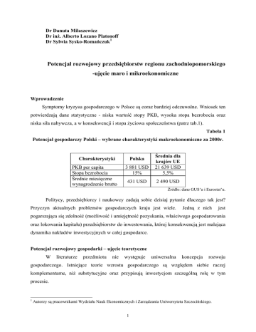 Dr Danuta Miłaszewicz Dr inż. Alberto Lozano Platonoff Dr Sylwia Sysko-Romańczuk 1 Potencjał rozwojowy przedsiębiorstw regionu zachodniopomorskiego -ujęcie maro i mikroekonomiczne Wprowadzenie Symptomy kryzysu gospodarczego w Polsce są coraz bardziej odczuwalne. Wniosek ten potwierdzają dane statystyczne - niska wartość stopy PKB, wysoka stopa bezrobocia oraz niska siła nabywcza, a w konsekwencji i stopa życiowa społeczeństwa (patrz tab.1). Tabela 1 Potencjał gospodarczy Polski – wybrane charakterystyki makroekonomiczne za 2000r. 3 881 USD 15% Średnia dla krajów UE 21 639 USD 5,5% 431 USD 2 490 USD Charakterystyki PKB per capita Stopa bezrobocia Średnie miesięczne wynagrodzenie brutto Polska Źródło: dane GUS’u i Eurostat’u. Politycy, przedsiębiorcy i naukowcy zadają sobie dzisiaj pytanie dlaczego tak jest? Przyczyn aktualnych problemów gospodarczych kraju jest wiele. Jedną z nich jest pogarszająca się zdolność (możliwość i umiejętność pozyskania, właściwego gospodarowania oraz lokowania kapitału) przedsiębiorstw do inwestowania, której konsekwencją jest malejąca dynamika nakładów inwestycyjnych w całej gospodarce. Potencjał rozwojowy gospodarki – ujęcie teoretyczne W literaturze przedmiotu nie występuje uniwersalna koncepcja rozwoju gospodarczego. Istniejące teorie wzrostu gospodarczego są względem siebie raczej komplementarne, niż substytucyjne oraz przypisują inwestycjom szczególną rolę w tym procesie. 1 Autorzy są pracownikami Wydziału Nauk Ekonomicznych i Zarządzania Uniwersytetu Szczecińskiego. 1 Już pierwsze keynesistowskie 2 modele wzrostu gospodarczego przypisywały decydującą rolę akumulacji kapitału w stymulowaniu potencjału gospodarczego, podkreślając, iż inwestycje odgrywają podwójną rolę w gospodarce. Z jednej strony tworzą dochód, z drugiej – zwiększają możliwości produkcyjne danej gospodarki poprzez rozszerzenie jej zasobów kapitałowych. Podejmowano także próby określenia takich warunków, w których podażowe i popytowe efekty realizowanych inwestycji mogą się równoważyć przy pełnym wykorzystaniu istniejących w gospodarce możliwości produkcyjnych. Z koleiteorie endogenicznego wzrostu gospodarczego 3 , rozwijane obecnie przez wielu ekonomistów, wskazują na jego nowe źródła i opisują teoretycznie sytuacje, w których gospodarki są w stanie, trwale i bez ograniczeń, zwiększać poziom produktu krajowego per capita. Modele te zakładają możliwość występowania stałego wzrostu gospodarczego bez założenia o egzogeniczności postępu technicznego. W ramach tych modeli postęp techniczny kształtowany jest w sposób endogeniczny w wyniku prywatnych decyzji o inwestowaniu. Dotyczą one dwojakiego rodzaju inwestycji: materialnych i niematerialnych. Zmiany zasobu kapitału obejmują w tych modelach zarówno kapitał fizyczny, jak i kapitał ludzki. Inwestycje w kapitał ludzki stanowią część inwestycji niematerialnych Natomiast inwestycje materialne klasycznie obejmują powiększenie majątku produkcyjnego. Najnowsze teorie wzrostu gospodarczego próbują łączyć podejście neoklasyczne z modelami wzrostu endogenicznego rozszerzając pojęcie kapitału i akcentując kluczowe znaczenie inwestycji w procesie wzrostu gospodarczego. Twierdzi się bowiem, że wzrost gospodarczy zależy od oczekiwań podmiotów co do tempa rozwoju gospodarki, a te z kolei są kształtowane przez aktualnie realizowaną politykę makroekonomiczną danego kraju (np. wysokość stóp procentowych, stóp podatkowych, wartość krajowej waluty, itp.). Należy jednak podkreślić, że instrumenty polityki makroekonomicznej stymulują wzrost gospodarczy, ale źródła wartości dodanej tkwią w przedsiębiorstwach. Zatem jednocześnie musi następować poprawa sprawności indywidualnej podmiotów gospodarczych oraz efektywność instytucji otoczenia biznesowego (np. finansowych, poręczeń kredytowych, administracji, itp.). Są to uwarunkowania wzrostu oczekiwań inwestorów zyskownego zwrotu z poniesionych nakładów w danym miejscu i czasie. 2 Opisy tych modeli znajdują się w: R. F. Harrod, Toward a Dynamic Economic, Macmillan, London 1942, E. D. Domar, Szkice z teorii wzrostu gospodarczego, PWN, Warszawa 1962 oraz N. Kaldor, Eseje z teorii stabilizacji i wzrostu gospodarczego, PWN, Warszawa 1971. 2 Analiza potencjału rozwojowego gospodarki – ujęcie makroekonomiczne i regionalne W okres transformacji gospodarki Polska wkroczyła z ujemną dynamiką nakładów inwestycyjnych, starym, nieodnawianym od szeregu lat kapitałem oraz niekorzystną strukturą rzeczową nakładów inwestycyjnych. Szybki rozwój gospodarki wynikający, między innymi, z przedsiębiorczych inicjatyw społeczeństwa wyrażających się w powstawaniu wielu nowych, przeważnie mikro firm, był możliwy przede wszystkim w początkowym okresie transformacji. Obecnie jednak szereg zmian strukturalnych, których wymaga nasza gospodarka, nie może się odbyć bez wzrostu nakładów inwestycyjnych alokowanych w dziedzinach działalności o dużej wartości dodanej. Zgodnie z danymi zamieszczonymi w tabeli 2, szybki wzrost inwestycji brutto w latach 1994–1997 pokrywał się z wysokim tempem wzrostu PKB. Duże tempo wzrostu inwestycji wynikało z optymistycznych oczekiwań krajowych inwestorów w rozwijającym się sektorze przedsiębiorstw prywatnych, prywatyzowanych i komercjalizowanych. Miało ono również swoje źródło w rosnącym tempie napływu bezpośrednich inwestycji zagranicznych w następstwie regulowanego zadłużenia wobec krajów zachodnich oraz wzrostu stabilności gospodarczej i politycznej naszego kraju, a w konsekwencji spadku ryzyka inwestycyjnego. Tabela 2 Dynamika PKB oraz inwestycji w latach 1990 – 2001 (ceny stałe) Wyszcze- 1990 1991 1992 1993 1994 1995 gólnienie Dynamika 91,0 93,0 102,6 103,8 105,2 107,0 PKB Dynamika inwestycji 89,9 95,9 100,4 102,3 108,2 117,1 * dane dla niepełnej zbior
