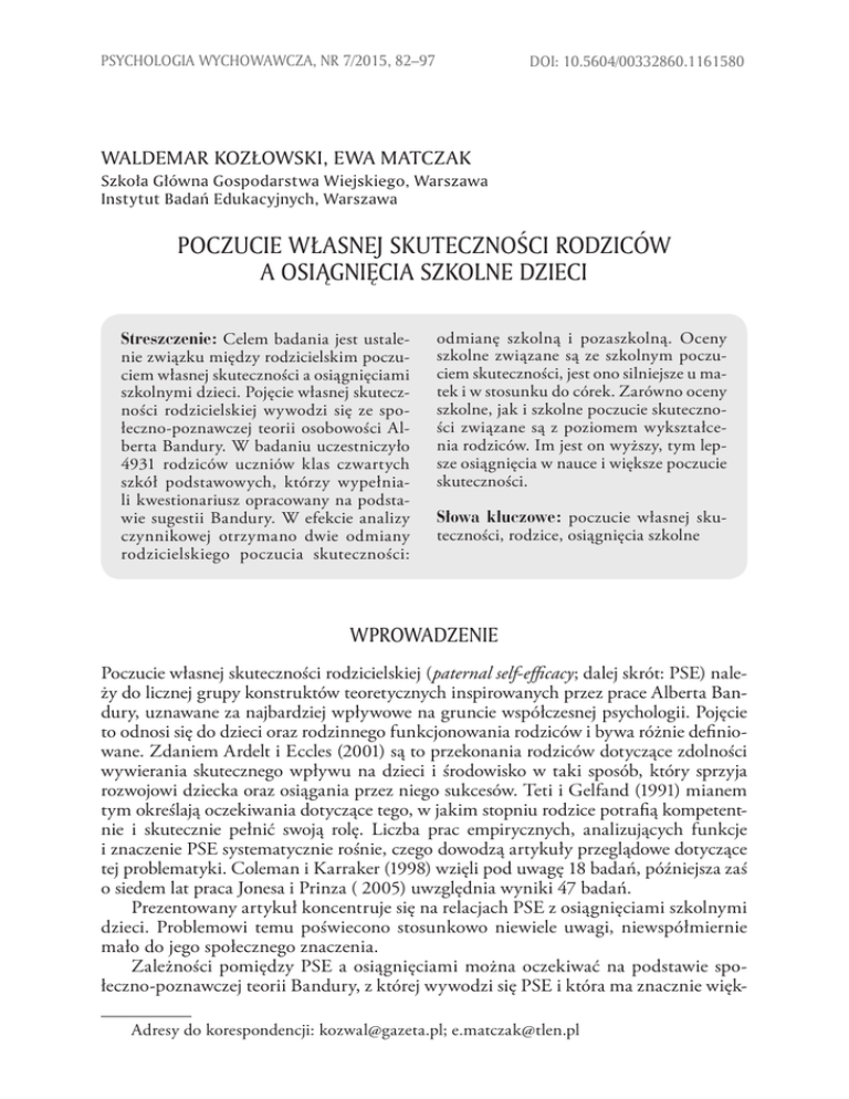 PSYCHOLOGIA WYCHOWAWCZA, NR 7/2015, 82–97 DOI: 10.5604/00332860.1161580 WALDEMAR KOZŁOWSKI, EWA MATCZAK Szkoła Główna Gospodarstwa Wiejskiego, Warszawa Instytut Badań Edukacyjnych, Warszawa POCZUCIE WŁASNEJ SKUTECZNOŚCI RODZICÓW A OSIĄGNIĘCIA SZKOLNE DZIECI Streszczenie: Celem badania jest ustalenie związku między rodzicielskim poczuciem własnej skuteczności a osiągnięciami szkolnymi dzieci. Pojęcie własnej skuteczności rodzicielskiej wywodzi się ze społeczno-poznawczej teorii osobowości Alberta Bandury. W badaniu uczestniczyło 4931 rodziców uczniów klas czwartych szkół podstawowych, którzy wypełniali kwestionariusz opracowany na podstawie sugestii Bandury. W efekcie analizy czynnikowej otrzymano dwie odmiany rodzicielskiego poczucia skuteczności: odmianę szkolną i pozaszkolną. Oceny szkolne związane są ze szkolnym poczuciem skuteczności, jest ono silniejsze u matek i w stosunku do córek. Zarówno oceny szkolne, jak i szkolne poczucie skuteczności związane są z poziomem wykształcenia rodziców. Im jest on wyższy, tym lepsze osiągnięcia w nauce i większe poczucie skuteczności. Słowa kluczowe: poczucie własnej skuteczności, rodzice, osiągnięcia szkolne WPROWADZENIE Poczucie własnej skuteczności rodzicielskiej (paternal self-efficacy; dalej skrót: PSE) należy do licznej grupy konstruktów teoretycznych inspirowanych przez prace Alberta Bandury, uznawane za najbardziej wpływowe na gruncie współczesnej psychologii. Pojęcie to odnosi się do dzieci oraz rodzinnego funkcjonowania rodziców i bywa różnie definiowane. Zdaniem Ardelt i Eccles (2001) są to przekonania rodziców dotyczące zdolności wywierania skutecznego wpływu na dzieci i środowisko w taki sposób, który sprzyja rozwojowi dziecka oraz osiągania przez niego sukcesów. Teti i Gelfand (1991) mianem tym określają oczekiwania dotyczące tego, w jakim stopniu rodzice potrafią kompetentnie i skutecznie pełnić swoją rolę. Liczba prac empirycznych, analizujących funkcje i znaczenie PSE systematycznie rośnie, czego dowodzą artykuły przeglądowe dotyczące tej problematyki. Coleman i Karraker (1998) wzięli pod uwagę 18 badań, późniejsza zaś o siedem lat praca Jonesa i Prinza ( 2005) uwzględnia wyniki 47 badań. Prezentowany artykuł koncentruje się na relacjach PSE z osiągnięciami szkolnymi dzieci. Problemowi temu poświecono stosunkowo niewiele uwagi, niewspółmiernie mało do jego społecznego znaczenia. Zależności pomiędzy PSE a osiągnięciami można oczekiwać na podstawie społeczno-poznawczej teorii Bandury, z której wywodzi się PSE i która ma znacznie więkAAdresy do korespondencji: [email protected]; [email protected] szy zakres ogólności. Przesłanką do przewidywania takiej zależności są założenia dotyczące wpływu poczucia własnej skuteczności na motywację do działania (Bandura, 1997; Oleś, 2003). Założenia te miały początkowo charakter postulatywny, stopniowo uzyskały mocne wsparcie empiryczne. Podsumowując, wyniki badań Pervin i John (2002) wskazują na kilka znaczących efektów oddziaływania poczucia skuteczności na procesy motywacyjne. Poczucie to określa wybór celu działania (osoby o wysokim jego poziomie wybierają cele trudniejsze), skłania do większego wysiłku i wytrwałości, co sprzyja skuteczniejszemu działania (por. Stajkovic, Luthans, 1998), poprawia nastój (zmniejsza lęk i skłonności depresyjne), pozwala także lepiej radzić sobie ze stresem i niepowodzeniami. Bandura (1997) zakłada jednak, że z większym prawdopodobieństwem można przewidywać brak sukcesów przy niskim poziomie własnej skuteczności niż odnoszenie sukcesu przy jego wysokim poziomie. Należy także podkreślić, że pozytywne konsekwencje motywacyjne pojawiają się głównie w przypadku świadomej, celowej aktywności. Przyjmując dość oczywiste założenie, że dla większości rodziców ważnym celem jest to, aby ich dzieci dobrze się uczyły, przytoczone dane mogą być podstawą oczekiwania związku pomiędzy poczuciem własnej skuteczności a szkolnymi osiągnięciami dzieci. Rodzice, którzy mają wysokie poczucie skuteczności, mają większe oczekiwania w stosunku do osiągnięć dzieci, wkładają więcej wysiłku i emocjonalnego zaangażowania w proces ich uczenia, co w konsekwencji powinno znaleźć wyraz w efektach nauczania. Na efekty te ma wpływ wiele czynników, dlatego też oczekiwać należy zależności istotnej, lecz niezbyt silnej. Podobne zależności postuluje model Ardelt i Eccles (2001). Powstał on na podstawie prac Furstenberga (1993, za: Ardelt, Eccles, 2001) oraz Bandury (1997) i pokazuje wzajemne zależności pomiędzy przekonaniami rodziców o własnej skuteczności, strategiami wspierania dzieci oraz ich rozwojem. W modelu tym centralne miejsce zajmuje PSE, które w tym zestawie zmiennych funkcjonuje jak samospełniająca się przepowiednia. Model zakłada, że rodzice przekonani o własnej skuteczności posługują się efektywnymi strategiami wychowawczymi, które zwiększają szanse na to, że dziecko będzie odnosiło sukcesy w uczeniu się oraz w kontaktach z ludźmi. Rodzice mogą także kształtować poczucie własnej skuteczności dzieci poprzez modelowanie. Dzieci przejmują ich postawy i przekonania, co ma pozytywny wpływ na szkolne sukcesy oraz relacje społeczne. Rodzice o niskim PSE stosują praktyki wychowawcze nieprzynoszące pożądanych efektów, w związku z czym nie pomagają (a czasem utrudniają) dziecku sprawne radzenie sobie z wymaganiami domu, szkoły i środowiska. Nie stają się dla dziecka wzorem skutecznego działania i nie sprzyjają powstawania przekonań o własnej skuteczności. Model zakłada występowanie odwrotnej zależności: sukcesy dzieci wzmacniają przekonania rodziców o własnej skuteczności. Gdy dziecko dobrze funkcjonuje w domu i szkole, rodzic chętnie przypisuje sobie zasługi za te pozytywne efekty, co wzmacnia poczucie własnej