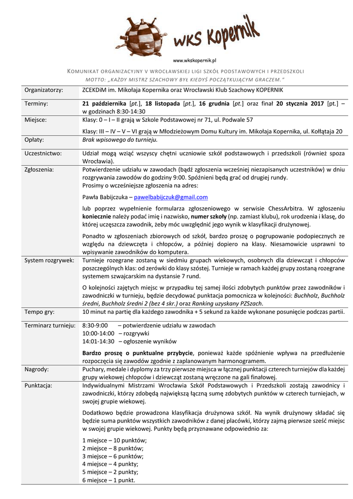 www.wkskopernik.pl K OMUNIKAT ORGANIZACYJNY V WROCŁAWSKIEJ LIGI SZKÓŁ PODSTAWOWYCH I PRZEDSZKOLI MOTTO: „KAŻDY MISTRZ SZACHOWY BYŁ KIEDYŚ POCZĄTKUJĄCYM GRACZEM. ” Organizatorzy: ZCEKDiM im. Mikołaja Kopernika oraz Wrocławski Klub Szachowy KOPERNIK Terminy: Miejsce: 21 października [pt.], 18 listopada [pt.], 16 grudnia [pt.] oraz finał 20 stycznia 2017 [pt.] – w godzinach 8:30-14:30 Klasy: 0 – I – II grają w Szkole Podstawowej nr 71, ul. Podwale 57 Opłaty: Klasy: III – IV – V – VI grają w Młodzieżowym Domu Kultury im. Mikołaja Kopernika, ul. Kołłątaja 20 Brak wpisowego do turnieju. Uczestnictwo: Zgłoszenia: Udział mogą wziąć wszyscy chętni uczniowie szkół podstawowych i przedszkoli (również spoza Wrocławia). Potwierdzenie udziału w zawodach (bądź zgłoszenia wcześniej niezapisanych uczestników) w dniu rozgrywania zawodów do godziny 9:00. Spóźnieni będą grać od drugiej rundy. Prosimy o wcześniejsze zgłoszenia na adres: Pawła Babijczuka – [email protected] lub poprzez wypełnienie formularza zgłoszeniowego w serwisie ChessArbitra. W zgłoszeniu koniecznie należy podać imię i nazwisko, numer szkoły (np. zamiast klubu), rok urodzenia i klasę, do której uczęszcza zawodnik, żeby móc uwzględnić jego wynik w klasyfikacji drużynowej. System rozgrywek: Tempo gry: Terminarz turnieju: Nagrody: Punktacja: Ponadto w zgłoszeniach zbiorowych od szkół, bardzo proszę o pogrupowanie podopiecznych ze względu na dziewczęta i chłopców, a później dopiero na klasy. Niesamowicie usprawni to wpisywanie zawodników do komputera. Turnieje rozegrane zostaną w siedmiu grupach wiekowych, osobnych dla dziewcząt i chłopców poszczególnych klas: od zerówki do klasy szóstej. Turnieje w ramach każdej grupy zostaną rozegrane systemem szwajcarskim na dystansie 7 rund. O kolejności zajętych miejsc w przypadku tej samej ilości zdobytych punktów przez zawodników i zawodniczki w turnieju, będzie decydować punktacja pomocnicza w kolejności: Buchholz, Buchholz średni, Buchholz średni 2 (bez 4 skr.) oraz Ranking uzyskany PZSzach. 10 minut na partię dla każdego zawodnika + 5 sekund za każde wykonane posunięcie podczas partii. 8:30-9:00 – potwierdzenie udziału w zawodach 10:00-14:00 – rozgrywki 14:01-14:30 – ogłoszenie wyników Bardzo proszę o punktualne przybycie, ponieważ każde spóźnienie wpływa na przedłużenie rozpoczęcia się zawodów zgodnie z zaplanowanym harmonogramem. Puchary, medale i dyplomy za trzy pierwsze miejsca w łącznej punktacji czterech turniejów dla każdej grupy wiekowej chłopców i dziewcząt zostaną wręczone na gali finałowej. Indywidualnymi Mistrzami Wrocławia Szkół Podstawowych i Przedszkoli zostają zawodnicy i zawodniczki, którzy zdobędą największą łączną sumę zdobytych punktów w czterech turniejach, w swojej grupie wiekowej. Dodatkowo będzie prowadzona klasyfikacja drużynowa szkół. Na wynik drużynowy składać się będzie suma punktów wszystkich zawodników z danej placówki, którzy zajmą pierwsze sześć miejsc w swojej grupie wiekowej. Punkty będą przyznawane odpowiednio za: 1 miejsce – 10 punktów; 2 miejsce – 8 punktów; 3 miejsce – 6 punktów; 4 miejsce – 4 punkty; 5 miejsce – 2 punkty; 6 miejsce – 1 punkt. Przepisy porządkowe: Opiekę nad dziećmi sprawują odpowiedzialni: rodzice, opiekunowie, instruktorzy, wychowawcy i nauczyciele oddelegowani z danej szkoły. Wszelkie reklamacje związane z partią mogą składać tylko i wyłącznie zawodnicy. Uwagi dotyczące rozgrywek: Uwagi końcowe: Na salach gry obowiązuje bezwzględna cisza w trakcie trwania każdej rundy. Zawodników oraz opiekunów chcących przenalizować partię, porozmawiać lub po prostu pobawić się, uprzejmie proszę o opuszczenie sali. W konsekwencji niezastosowania się do tego punktu będą dodawane punkty ujemne dla szkoły w klasyfikacji drużynowej, zawodnicy będą wycofywani z poszczególnych kojarzeń, z całego turnieju oraz w najbardziej upartych przypadkach, zostaną zdyskwalifikowani ze wszystkich rozgrywek, z brakiem możliwości gry w całym sezonie. W przypadku niskiej frekwencji dziewcząt lub chłopców w danej grupie wiekowej (poniżej ośmiu osób), grupa taka zostanie połączona z inną. Punktacja końcowa będzie wtedy liczona osobno dla każdej z nich. W uzasadnionych przypadkach można zgłosić dziewczynkę do rozgrywek chłopców lub zawodnika/zawodniczkę do starszej grupy wiekowej. - rundy będą następowały kolejno po sobie, zaraz po zakończeniu ostatniej partii w danej grupie; - zakończenia nastąpią 5-10 minut po zakończeniu ostatniej partii turnieju w danej grupie; - zakończenie podczas gali finałowej odbędzie się pół godziny po skończeniu ostatniej partii w całym turnieju dla wszystkich grup wiekowych (w czasie, gdy będą drukowane dyplomy oraz będzie liczona klasyfikacja drużynowa, odbędzie się Konkurs Artystycznej Twórczości); - na sali gry można posiadać przy sobie wyciszony telefon komórkowy; - uczestnicy turnieju ubezpieczają się we własnym zakresie; - w turnieju obowiązują aktualne przepisy gry FIDE; - zgłoszenia, listy startowe i wyniki będą na bieżąco prezentowane w serwisach turniejowych na ChessArbitrze, oraz stronie WKS KOPERNIK: www.wkskopernik.pl; - przy Młodzieżowym Domu Kultury ciężko jest znaleźć miejsce dla samochodu, także zalecam podróż komunikacją miejską. W przypadku konieczności przyjechania autem, oddalony o 100 metrów Dworzec Główny PKP oferuje możliwość pozostawienia swojego transportu w parkingu podziemnym w cenie 2 złotych za każdą godzinę, przy czym pierwsze 20 minut jest gratis; - na terenie Młodzieżowego Domu Kultury nie ma żadnego bufetu ani sklepiku, także zachęcam do przygotowania sobie porządnego drugiego śniadania; - z uwagi na małą przestrzeń dla opiekunów, z góry proszę o wyrozumiałość; - organizator zastrzega sobie prawo do 