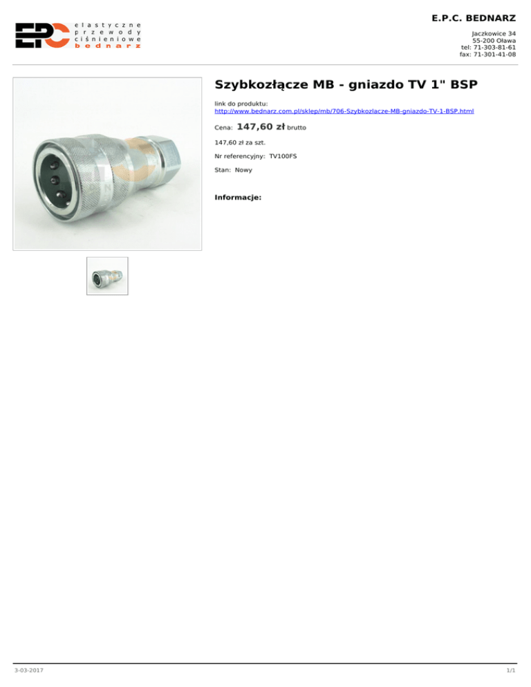 E.P.C. BEDNARZ Jaczkowice 34 55-200 Oława tel: 71-303-81-61 fax: 71-301-41-08 Szybkozłącze MB - gniazdo TV 1" BSP link do produktu: http://www.bednarz.com.pl/sklep/mb/706-Szybkozlacze-MB-gniazdo-TV-1-BSP.html Cena: 147,60 zł brutto 147,60 zł za szt. Nr referencyjny: TV100FS Stan: Nowy Informacje: 3-03-2017 1/1