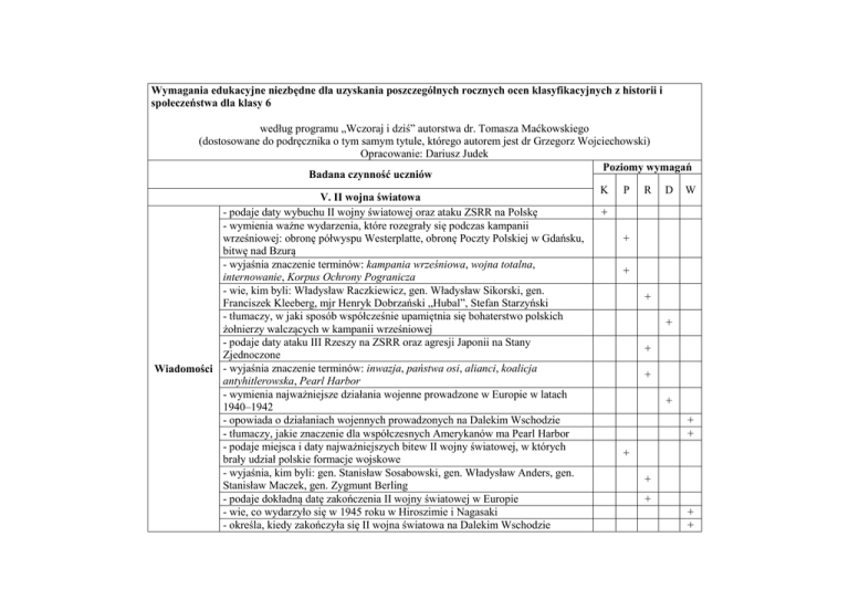Wymagania edukacyjne niezbędne dla uzyskania poszczególnych rocznych ocen klasyfikacyjnych z historii i społeczeństwa dla klasy 6 według programu „Wczoraj i dziś” autorstwa dr. Tomasza Maćkowskiego (dostosowane do podręcznika o tym samym tytule, którego autorem jest dr Grzegorz Wojciechowski) Opracowanie: Dariusz Judek Poziomy wymagań Badana czynność uczniów K P R D W V. II wojna światowa - podaje daty wybuchu II wojny światowej oraz ataku ZSRR na Polskę + - wymienia ważne wydarzenia, które rozegrały się podczas kampanii wrześniowej: obronę półwyspu Westerplatte, obronę Poczty Polskiej w Gdańsku, + bitwę nad Bzurą - wyjaśnia znaczenie terminów: kampania wrześniowa, wojna totalna, + internowanie, Korpus Ochrony Pogranicza - wie, kim byli: Władysław Raczkiewicz, gen. Władysław Sikorski, gen. + Franciszek Kleeberg, mjr Henryk Dobrzański „Hubal”, Stefan Starzyński - tłumaczy, w jaki sposób współcześnie upamiętnia się bohaterstwo polskich + żołnierzy walczących w kampanii wrześniowej - podaje daty ataku III Rzeszy na ZSRR oraz agresji Japonii na Stany + Zjednoczone Wiadomości - wyjaśnia znaczenie terminów: inwazja, państwa osi, alianci, koalicja + antyhitlerowska, Pearl Harbor - wymienia najważniejsze działania wojenne prowadzone w Europie w latach + 1940–1942 - opowiada o działaniach wojennych prowadzonych na Dalekim Wschodzie + - tłumaczy, jakie znaczenie dla współczesnych Amerykanów ma Pearl Harbor + - podaje miejsca i daty najważniejszych bitew II wojny światowej, w których + brały udział polskie formacje wojskowe - wyjaśnia, kim byli: gen. Stanisław Sosabowski, gen. Władysław Anders, gen. + Stanisław Maczek, gen. Zygmunt Berling - podaje dokładną datę zakończenia II wojny światowej w Europie + - wie, co wydarzyło się w 1945 roku w Hiroszimie i Nagasaki + - określa, kiedy zakończyła się II wojna światowa na Dalekim Wschodzie + - wyjaśnia znaczenie terminów: Polskie Państwo Podziemne, Armia Krajowa, powstanie warszawskie, sabotaż, mały sabotaż - rozwija skrót AK - opisuje sytuację Polaków na terenach okupowanych przez III Rzeszę i ZSRR z użyciem terminów: okupacja, łapanka, getto, robotnicy przymusowi - tłumaczy, czym była zbrodnia wołyńska - podaje datę wybuchu powstania warszawskiego - wyjaśnia, co wydarzyło się w Katyniu - rozumie, dlaczego powstało Muzeum Powstania Warszawskiego - opisuje warunki panujące w gettach w czasie II wojny światowej - wyjaśnia znaczenie terminów: Holokaust, obóz zagłady, Auschwitz-Birkenau - podaje datę wybuchu powstania w getcie warszawskim - wie, kim był Janusz Korczak - wyjaśnia, na czym polegała działalność „Żegoty” - omawia zasługi Ireny Sendlerowej - tłumaczy, w jaki sposób upamiętnia się osoby, które pomagały Żydom w czasie II wojny światowej - umieszcza na osi czasu daty: 1 września 1939 roku, 17 września 1939 roku - wskazuje na mapie państwa, które dokonały agresji na Polskę we wrześniu 1939 roku - zaznacza na mapie linię podziału ziem polskich między Niemcy a ZSRR - wymienia przyczyny i skutki klęski Polski w kampanii wrześniowej w 1939 roku - opowiada o przebiegu kampanii wrześniowej - opisuje na podstawie tekstu źródłowego przygotowania Polaków do obrony Umiejętności Grodna przed atakiem Armii Czerwonej - ocenia postawę polskich żołnierzy i cywilów w pierwszych tygodniach wojny - zdobywa informacje o losach swoich przodków w 1939 roku - tworzy mapę myśli dotyczącą kampanii wrześniowej - wskazuje na mapie państwa, które padły ofiarą niemieckiej agresji po 1939 roku, oraz kraje będące sojusznikami III Rzeszy - ocenia, jakie znaczenie dla przebiegu II wojny światowej miało przyłączenie się Stanów Zjednoczonych i Związku Radzieckiego do walki po stronie aliantów - zaznacza na osi czasu daty: ataku III Rzeszy na ZSRR, bitwy pod Kurskiem, + + + + + + + + + + + + + + + + + + + + + + + + + + inwazji na Normandię, kapitulacji Niemiec i Japonii - wskazuje na mapie państwa zajęte przez Armię Czerwoną w latach 1944–1945 - omawia udział Polaków w walkach na frontach II wojny światowej - opowiada, w jaki sposób współcześnie upamiętnia się polskich żołnierzy, którzy walczyli podczas II wojny światowej - gromadzi informacje dotyczące 2. Korpusu Polskiego - ocenia, czy decyzja Amerykanów o użyciu broni atomowej była słuszna - przedstawia historię niedźwiedzia Wojtka - zaznacza na osi czasu datę wybuchu powstania warszawskiego - tłumaczy, w jaki sposób społeczeństwo polskie walczyło z okupantami - przedstawia przyczyny i skutki wybuchu powstania warszawskiego - wskazuje na mapie największe getta, hitlerowskie obozy koncentracyjne oraz miejsca na Wschodzie, w których zamordowano polskich oficerów - charakteryzuje metody walki, które stosowali Polacy w trakcie powstania warszawskiego - gromadzi informacje o sytuacji w swojej miejscowości w czasie II wojny światowej - opowiada na podstawie tekstu źródłowego, w jaki sposób ratowano żydowskie dzieci żyjące w gettach - wyjaśnia, w jaki sposób Polacy pomagali Żydom w czasie okupacji - ocenia postawy, jakie przyjmowali Polacy wobec losu Żydów w trakcie II wojny światowej - przedstawia sylwetkę Ireny Sendlerowej VI. Polska Rzeczpospolita Ludowa - podaje daty utworzenia NATO i Układu Warszawskiego - wyjaśnia znaczenie terminów: Układ Warszawski, Organizacja Paktu Północnoatlantyckiego (NATO), mur berliński, wyścig zbrojeń - tłumaczy, czym była zimna wojna - wymienia współczesne cele NATO Wiadomości - omawia rolę, którą odgrywa Polska w Organizacji Paktu Północnoatlantyckiego - wie, co oznacza skrót PRL - przedstawia okoliczności objęcia władzy w Polsce przez komunistów - opowiada, w jaki sposób polskie społeczeństwo uczestniczyło w powojennej odbudowie kraju + + + + + + + + + + + + + + + + K P R D W + + + + + + + + - rozwija skróty: PZPR, UB, MO - tłumaczy, jakie 