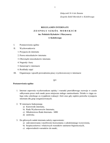 1 Załącznik Nr 6 do Statutu Zespołu Szkół Morskich w Kołobrzegu REGULAMIN INTERNATU ZESPOŁU SZKÓŁ MORSKICH im. Polskich Rybaków i Marynarzy w Kołobrzegu I. Postanowienia ogólne II. Wychowankowie 1. Przyjęcia do internatu 2. Prawa mieszkańców internatu 3. Obowiązki mieszkańców internatu 4. Nagrody i kary 5. Samorząd w internacie 6. Rozkłady zajęć III. Organizacja i sposób prowadzenia pracy wychowawczej w internacie §1 Postanowienia ogólne 1. Internat zapewnia wychowankom opiekę i warunki prawidłowego rozwoju w czasie odbywania przez nich nauki poza miejscem stałego zamieszkania. Działa w ciągu całego roku szkolnego za wyjątkiem wakacji i ferii oraz gdy zajdzie potrzeba wynajęcia internatu dla grup zorganizowanych. 2. W internacie funkcjonują: a) Kierownik internatu, b) Rada Wychowawców Internatu, c) Młodzieżowa Rada Internatu - MRI d) stołówka. 3. Do głównych zadań internatu należy zapewnienie: a) zakwaterowania i możliwości korzystania z całodziennego wyżywienia, b) bezpieczeństwa i właściwych warunków sanitarno-higienicznych, c) odpowiednich warunków do nauki, 2 d) warunków do rozwijania zainteresowań i uzdolnień, e) warunków do uprawiania sportów i dbałości o stan zdrowia, f) warunków do kształtowania samorządności i zaradności życiowej. 4. Internat planuje i realizuje swe zadania współdziałając z rodzicami /opiekunami/ uczniów oraz instytucjami i placówkami w środowisku 5. Za pobyt w internacie od mieszkańców jest pobierana opłata w wysokości ustalonej przez Dyrektora Szkoły na środki czystości §2 Wychowankowie - przyjęcia do internatu 1. Uczniowie przyjmowani są do internatu na określony rok szkolny decyzją Dyrektora Szkoły. 2. Do internatu przyjmowani są uczniowie: a) mieszkający w miejscowości, z której codzienny dojazd do Kołobrzegu jest nie możliwy lub w istotny sposób utrudniony, 3. W przypadkach uzasadnionych (warunki materialne, zdrowotne i wychowawcze) do internatu może być przyjęty uczeń zamieszkały w Kołobrzegu lub z miejscowości z dogodnym dojazdem. 4. Miejsce w internacie można otrzymać na podstawie podania złożonego przez ucznia, jego rodziców /opiekunów/ lub wychowawcę klasy. Uczniowie ubiegający się o miejsce w internacie na następny rok szkolny składają podania o przyjęcie do dnia 10 czerwca. 5. Podanie od uczniów klas pierwszych należy złożyć w sekretariacie szkoły w terminie określonym przez Dyrektora Szkoły./ do 15 lipca/ 6. Uczniowie, którzy z powodu niewłaściwego zachowania nie zostali przyjęci do internatu lub zostali skreśleni z listy mieszkańców na czas określony mogą być przyjęci warunkowo w ciągu roku szkolnego na podstawie podania jak w pkt. 4. Uczeń skreślony z listy mieszkańców internatu dyscyplinarnie za rażące naruszenie zasad i norm oraz nagminne łamanie regulaminu może być nie przyjęty w poczet mieszkańców internatu w danym i przyszłym roku szkolnym 7. Uczniom, którzy nie zostali przyjęci do internatu przysługuje prawo odwołania się do Dyrektora Szkoły. §3 Prawa mieszkańców internatu Prawa wychowanka najogólniej określa Statut Szkoły. Ponadto wynikają one z zadań określonych w niniejszym regulaminie § 1 ppkt 3 i 4/. 3 §4 Wychowankowie mają prawo do: 1. zakwaterowania w pomieszczeniach mieszkalnych, w których możliwy jest wypoczynek i nauka własna, 2. pozostania w internacie (w uzasadnionych przypadkach) w dni wolne od nauki, po uprzednim zgłoszeniu wychowawcy oraz za zgodą rodziców (prawnych opiekunów), lub na ich prośbę. 3. wyboru godzin przeznaczonych na samokształcenie po uzyskaniu średniej śródrocznej powyżej 4,5 za zgodą wychowawcy, 4. całodziennego wyżywienia, 5. należytych warunków sanitarno-higienicznych, warunków do przestrzegania higieny osobistej, estetyki pomieszczeń i otoczenia placówki, przy czym: a) pomieszczenia mieszkalne sprzątają wychowankowie b) pomieszczenia ogólnego użytku sprząta personel, a w godzinach popołudniowych, o ile zachodzi taka potrzeba, wychowankowie 6. opieki lekarskiej, pielęgniarskiej w placówkach wskazanych przez Dyrektora Szkoły, 7. odpowiednich warunków w zakresie nauki własnej tj. a) korzystania z audycji TV i video wspierających program nauczania, b) korzystania z wszelkich form pomocy koleżeńskiej, c) korzystania z pomocy wychowawców. d) korzystania z księgozbioru biblioteki internatu ( encyklopedie, słowniki, atlasy, tablice matematyczne, leksykony i kompendia wiedzy szkolnej). e) korzystania z komputera/laptopa w celach naukowych. 8. udziału w: a) zajęciach organizowanych przez internat, szkołę, organizacje i placówki pozaszkolne, b) seansach filmowych, spektaklach teatralnych, koncertach rozrywkowych, c) organizowanych przez szkołę i internat dyskotekach. 9. Korzystania z audycji radiowych, TV i video /w piątki i soboty po godz. 22 00 za zgodą wychowawcy dyżurnego i pod warunkiem, że nie zakłóci to spokoju pozostałych współmieszkańców internatu/. 10. korzystania z pokoju do cichej nauki za zgodą wychowawców - uczyć się o każdej porze, nie dłużej jednak jak do godz. 2400 po uzyskaniu zgody wychowawcy 11. Wyjścia do miasta w czasie wolnym, po poinformowaniu o zamiarze wyjścia wychowawcy i odnotowaniu w zeszycie wyjść, jeżeli wskutek nałożonej kary nie utracił przywileju. 12. Wyjazdu do rodziców /opiekunów/ w dni wolne od zajęć po wcześniejszym zgłoszeniu wychowawcy i odnotowaniu na liście wyjazdowej. Prawo to może być wstrzymane lub ograniczone na wniosek rodziców /opiekunów/, na podstawie orzeczeń sądowych, wniosków placówek opiekuńczych i w przypadkach uzasadnionych dobrem wychowanka. 4 13. Wyjazdu w dniach zajęć szkolnych po wcześniejszym zgłoszeniu wychowawcy za zgodą wychowawcy klasy lub rodzica (opiekuna prawnego) informacją potwierdzoną telefonicznie i odnotowaniu na liście wyjazdowej. 14. Przyjmowania odwiedzających rodziców /opiekunów/, rodz
