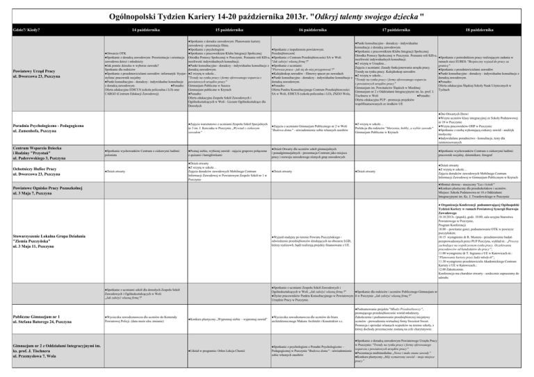 Ogólnopolski Tydzien Kariery 14-20 października 2013r. "Odkryj talenty swojego dziecka " Gdzie?/ Kiedy? Powiatowy Urząd Pracy ul. Dworcowa 23, Pszczyna 14 października ●Spotkanie z doradca zawodowym: Planowanie kariery zawodowej - prezentacja filmu. ●Spotkanie z psychologiem ●Otwarcie OTK ●Spotkanie z pracownikiem Klubu Integracji Społecznej ●Spotkanie z doradcą zawodowym: Preorientacja i orientacja Ośrodka Pomocy Społecznej w Pszczynie. Poznanie roli KIS-u, zawodowa dzieci i młodzieży możliwość indywidualnych konsultacji. ●Jak pomóc dziecku w wyborze zawodu? ●Punkt konsultacyjno - doradczy - indywidualne konsultacje z Spotkanie dla rodziców doradcą zawodowym. ●Spotkanie z przedstawicielami zawodów: informatyk/ fryzjer- ●Z wizytą w szkole... stylista/ pracownik socjalny "Trendy na rynku pracy i formy oferowanego wsparcia z ●Punkt konsultacyjno - doradczy - indywidualne konsultacje powiatowych urzędów pracy " z doradcą zawodowym. ●Ponadto: Gimnazjum Publiczne w Suszcu Oferta edukacyjna EDICUS (szkoła policealna i LO) oraz Gimnazjum publiczne w Kryrach CARGO (Centrum Edukacji Zawodowej) ●Ponadto: Oferta edukacyjna Zespołu Szkół Zawodowych i Ogólnokształcących w Woli - Liceum Ogólnokształcące dla Dorosłych Ochotniczy Hufiec Pracy ul. Dworcowa 23, Pszczyna 16 października 17 października ●Punkt konsultacyjno - doradczy - indywidualne konsultacje z doradcą zawodowym. ●Spotkanie z inspektorem powiatowym: ●Spotkanie z pracownikiem Klubu Integracji Społecznej Przedsiębiorczość Ośrodka Pomocy Społecznej w Pszczynie. Poznanie roli KIS-u, ●Spotkanie z Centrum Przedsiębiorczości SA w Woli możliwość indywidualnych konsultacji. "Jak założyć własną firmę ?" ●Z wizytą w Urzędzie... ●Spotkanie z uczniami: Zajęcia z uczniami: Zasady funkcjonowania urzędu pracy. "Pierwsza praca - jak się do niej przygotować ?" Trendy na rynku pracy. Kalejdoskop zawodów. ●Kalejdoskop zawodów - filmowy spacer po zawodach ●Z wizytą w szkole... ●Punkt konsultacyjno - doradczy - indywidualne konsultacje z "Trendy na rynku pracy i formy oferowanego wsparcia doradcą zawodowym. z powiatowych urzędów pracy " ●Ponadto: Gimnazjum im. Powstańców Śląskich w Miedźnej Oferta Punktu Konsultacyjnego Centrum Przedsiębiorczości Gimnazjum nr 2 z Oddziałami Integracyjnymi im. ks. prof. J. SA w Woli, EDICUS (szkoła policealna i LO), ZSZiO Wola, Tischnera w Woli ●Ponadto: Oferta edukacyjna PUP - promocja projektów współfinansowanych ze środków UE ●Z wizytą w szkole… Prelekcja dla rodziców "Marzenia, hobby, a wybór zawodu " Gimnazjum Publiczne w Kryrach 18 października ●Spotkanie z pośrednikiem pracy realizującym zadania w ramach sieci EURES: "Bezpieczny wyjazd do pracy za granicę " ●Spotkanie z przedstawicielami zawodów ●Punkt konsultacyjno - doradczy - indywidualne konsultacje z doradcą zawodowym. ●Ponadto: Oferta edukacyjna Śląskiej Szkoły Nauk Użytecznych w Tychach ●Dni Otwartych Drzwi ●Wizyta uczniów klasy integracyjnej ze Szkoły Podstawowej nr 18 w Pszczynie ●Wizyta pracowników OHP w Pszczynie ●Spotkanie z osobą wykonującą ciekawy zawód - analityk medyczny ●Indywidulane poradnictwo - konsultacje, testy dla zainteresowanych ●Zajęcia warsztatowe z uczniami Zespołu Szkół Specjalnych nr 3 im. J. Korczaka w Pszczynie „Wywiad z ciekawym zawodem ” ●Zajęcia z uczniami Gimnazjum Publicznego nr 2 w Woli "Budowa domu " - uświadomienie sobie własnych zasobów ●Spotkanie wychowanków Centrum z ciekawymi ludźmi: polonista ●Poznaj siebie, wybieraj zawód - zajęcia grupowe połączone z quizami i łamigłówkami ●Dzień Otwarty dla uczniów szkół gimnazjalnych i ponadgimnazjalnych - prezentacja Centrum jako miejsca pracy i rozwoju zawodowego róznych grup zawodowych ●Spotkanie wychowanków Centrum z ciekawymi ludźmi: pracownik socjalny, dziennikarz, fotograf ●Dzień otwarty ●Dzień otwarty ●Z wizytą w szkole… Zajęcia doradców zawodowych Mobilnego Centrum Informacji Zawodowej w Powiatowym Zespole Szkół nr 1 w Pszczynie ●Dzień otwarty ●Dzień otwarty ●Z wizytą w szkole… Zajęcia doradców zawodowych Mobilnego Centrum Informacji Zawodowej w Gimnazjum Publicznym w Kryrach Poradnia Psychologiczno - Pedagogiczna ul. Zamenhofa, Pszczyna Centrum Wsparcia Dziecka i Rodziny "Przystań" ul. Paderewskiego 3, Pszczyna 15 października ●Dzień otwarty Powiatowe Ognisko Pracy Pozaszkolnej ul. 3 Maja 7, Pszczyna ●Montaż słowno - muzyczny "Las i leśnik " ●Konkurs plastyczny dla przedszkolakow i uczniów. Miejsce: Szkoła Podstawowa nr 18 z Oddziałami Integracyjnymi im. Ks. J. Twardowskiego w Pszczynie Stowarzyszenie Lokalna Grupa Działania "Ziemia Pszczyńska" ul. 3 Maja 11, Pszczyna ● Organizacja Konferencji podsumowującej Ogólnopolski Tydzień Kariery w ramach Powiatowej Synergii Rozwoju Zawodowego 18.10.2013r. (piątek), godz. 10.00, sala sesyjna Starostwa Powiatowego w Pszczynie, Program Konferencji 10.00 – powitanie gości, podsumowanie OTK w powiecie pszczyńskim; 10.15 wystąpienie dr R. Mustera - przedstawienie badań przeprowadzonych przez PUP Pszczyna, wykład nt.: „Procesy zachodzące na współczesnym rynku pracy. Oczekiwania pracodawców od kandydatów do pracy ”; 11.00 wystąpienie dr T. Ingrama z UE w Katowicach nt.: "Planowanie kariery przez ludzi młodych" ; 11.30 wystąpienie przedstawiciela Akademickiego Centrum Kariery z UE w Katowicach.; 12.00 Zakończenie. Konferencja ma charakter otwarty - serdecznie zapraszamy do udziału. ●Wyjazd studyjny po terenie Powiatu Pszczyńskiego odwiedzenie przedsiębiorców działających na obszarze LGD, którzy realizowli, bądź realizują projekty finansowane z UE. ●Spotkanie z uczniami Zespołu Szkół Zawodowych i Ogólnokształcących w Woli „Jak założyć własną firmę ?" ●Spotkanie dla rodziców i uczniów Publicznego Gimnazjum nr ●Dyżur pracowników Punktu Konsult
