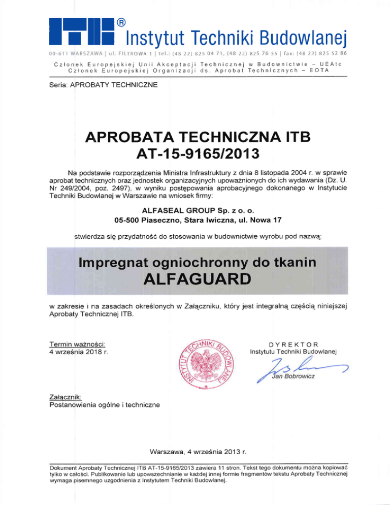 ogniochrctnnego do tkanin ALFAGUARD. lnstytut Techniki Budowlanej, Zaklad