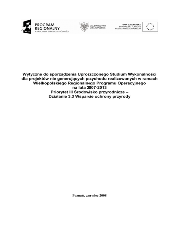 Wytyczne do sporządzenia Uproszczonego Studium Wykonalności dla projektów nie generujących przychodu realizowanych w ramach Wielkopolskiego Regionalnego Programu Operacyjnego na lata 2007-2013 Priorytet III Środowisko przyrodnicze – Działanie 3.3 Wsparcie ochrony przyrody Poznań, czerwiec 2008 Spis treści 1. Streszczenie ........................................................................................................................... 5 2. Definicja projektu ................................................................................................................ 5 3. Charakterystyka projektu................................................................................................... 6 3.1. Stan aktualny .................................................................................................................. 6 3.2. Identyfikacja problemów................................................................................................. 6 3.3. Cel/e projektu .................................................................................................................. 6 3.4. Warianty realizacji projektu ............................................................................................ 7 3.5 Opis projektu .................................................................................................................... 7 3.6. Określenie wskaźników produktu oraz rezultatu projektu .............................................. 8 3.7. Matryca logiczna projektu............................................................................................. 10 4. Analiza instytucjonalna i prawna projektu ..................................................................... 11 4.1. Opis wdraŜania projektu................................................................................................ 11 4.2. Zarządzanie projektem i trwałość projektu ................................................................... 11 4.3. Kwestie prawne związane z realizacją projektu............................................................ 12 5. Uproszczona analiza finansowa projektu ........................................................................ 12 5.1. Metodologia przeprowadzenia uproszczonej analizy finansowej projektu................... 12 5.2. Nakłady finansowe na realizację projektu .................................................................... 12 5.3. Źródła finansowania projektu........................................................................................ 15 5.4. Kalkulacja kosztów w okresie eksploatacji................................................................... 16 5.5. Trwałość finansowa projektu ........................................................................................ 17 5.6. Analiza ekonomiczna projektu...................................................................................... 18 5.7. Analiza ryzyka............................................................................................................... 18 6. Wpływ projektu na środowisko ........................................................................................ 18 6.1. Wpływ projektu na środowisko w okresie realizacji .................................................... 18 6.3. Wpływ projektu na środowisko po zakończeniu realizacji ........................................... 19 7. Promocja i informacja ....................................................................................................... 19 8. Spis tabel ............................................................................................................................. 19 9. Spis rysunków..................................................................................................................... 19 10. Spis załączników............................................................................................................... 19 2 Celem Wytycznych jest ujednolicenie zasad przygotowywania uproszczonego studium wykonalności, w tym metodologii prowadzenia obliczeń, prezentacji informacji. Wytyczne mają ułatwić proces przygotowania uproszczonego studium wykonalności przez wnioskodawców oraz ocenę projektów. Podstawowe definicje: Beneficjent - Beneficjent końcowy to podmiot, który jest stroną umowy zawieranej z Instytucją Pośredniczącą (WFOŚiGW w Poznaniu) o dofinansowanie realizacji projektu z Europejskiego Funduszu Rozwoju Regionalnego (EFRR). Wnioskodawca - do kategorii wnioskodawców zalicza się tylko grupę podmiotów, która wyszczególniona została w punkcie „Typy beneficjentów” w ramach poszczególnych Działań opisanych w Szczegółowym Opisie Priorytetów WRPO na lata 2007-2013. Ceny stałe: ceny według roku bazowego, stosowanie których pozwala wyeliminować wpływ inflacji na dane ekonomiczne. NaleŜy odróŜniać je od cen bieŜących. Cross-financing - zasada elastycznego, krzyŜowego finansowania, która ma na celu ułatwienie wdraŜania jednofunduszowych programów operacyjnych. Zapewnia ona moŜliwość finansowania w ramach zakresów interwencji EFRR i EFS komplementarnych działań wchodzących odpowiednio w zakres drugiego funduszu. Projekt (przedsięwzięcie) - operacja o jasno określonych celach, składająca się z całej serii robót, działań lub usług, której celem jest wykonanie niepodzielnego zadania, posiadającego sprecyzowany charakter gospodarczy lub techniczny. Zespoły działań tworzących projekt powinny zachować spójny i skoordynowany charakter i prowadzić do ściśle określonego celu. Zasady ogólne sporządzenia dokumentu: Uproszczone Studium Wykonalności powinno wykazać wykonalność instytucjonalną, techniczną oraz finansową projektu. Studium musi być aktualne na dzień składania wniosku. Studium musi zawierać wszystkie rozdziały wskazane w niniejszych wytycznych. Dane przedstawione w uproszczonym Studium Wykonalności muszą być