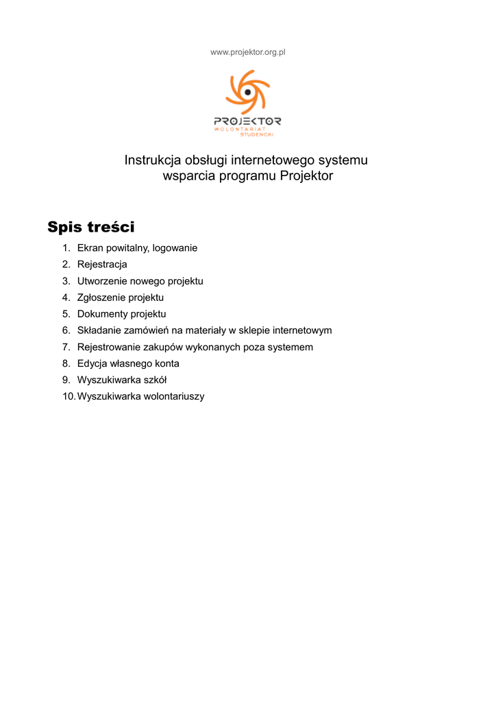 www.projektor.org.pl Instrukcja obsługi internetowego systemu wsparcia programu Projektor Spis treści 1. Ekran powitalny, logowanie 2. Rejestracja 3. Utworzenie nowego projektu 4. Zgłoszenie projektu 5. Dokumenty projektu 6. Składanie zamówień na materiały w sklepie internetowym 7. Rejestrowanie zakupów wykonanych poza systemem 8. Edycja własnego konta 9. Wyszukiwarka szkół 10. Wyszukiwarka wolontariuszy 1. Ekran powitalny, logowanie Pracę z systemem rozpoczynamy od logowania lub rejestracji (jeżeli nie mamy jeszcze konta w systemie). W celu zalogowania się należy podać w formularzu (1) e-mail i hasło podane podczas rejestracji. W celu zarejestrowania się należy kliknąć w link (2). 2. Rejestracja Rejestrajca realizowana jest w kilku krokach. W kroku 1 akceptujemy regulamin W kroku 2 podajemy swoje dane osobowe W kroku 3 podajemy dane dotyczące swojej uczelni W kroku 4 podajemy swoje dane adresowe W kroku 5 wpisujemy adres e-mail, którego będziemy używali podczas logowania (jest to też adres, na który będą przychodziły wszelkie powiadomienia z systemu) oraz hasło Po zapisaniu danych system prosi o wypełnienie ankiety. Do wolontariusza przychodzi rówież e-mail z prośbą o potwierdzenie rejestracji. 3. Utworzenie nowego projektu Po zalogowaniu się do systemu wolontariusz może otrzymać dwa komunikaty: (1) konieczność przesłania podpisanego oświadczenia wolontariusza (2) informacja o tym, że konto wolontariusza nie zostało jeszcze potwiedzone przez administatora systemu Gdy konto jest nieaktywowane przez administratora nie można zgłosić projektu. W celu utworzenia nowego projektu w systemie należy kliknąć w przycisk "Nowy projekt" (1) znajdujący się nad listą Twoich projektów. W celu przejścia do strony wcześniej utworzonego projektu, należy kliknąć w jego nazwę na liście (2). Po kliknięciu w przycisk "Nowy projekt" wyświetli się formularz dodawania nowego projektu. Należy w nim podać nazwę (1) oraz uzupełnić opis według proponowanego wzoru (2). 4. Zgłoszenie projektu Projekt będzie można zgłosić do realizacji jeżeli będzie odpowiednio opisany i kiedy zaprosisz do jego realizacji innych wolontariuszy. Pamiętaj! Zgłoszenie projektu będzie możliwe, jeżeli wszystkie osoby realizujące projekt dostarczą administratorowi programu oświadczenia wolontariusza. 4.1 Opisywanie projektu Przed zgłoszeniem projektu należy podać jego następujące parametry: typ (1), czas realizacji (2), miejsce (3), kategoria (4), RKP (5), uwagi wolontariusza (6) Wprowadzenie wartości parametrów projektu będzie możliwe po kliknięciu w odpowiednią komórkę tabeli z danymi projektu. 4.2 Zapraszanie wolontariuszy do projektu W celu zaproszenia wolontariusza do projektu należy klinąć w przycisk "Dodaj osobę" (1) Po kliknięciu w przycisk dodania osoby wyświetla się formularz wyszukiwania wolontariuszy. Aby wyszukać osobę należy wpisać jej nazwisko albo e-mail oraz klinąć przycisk "Szukaj" (1). Następnie z listy wyników należy wybrać żądaną osobę (2). Po tej operacji tabela wolontariuszy pokazuje zaproszone osoby oraz ich statusy przypisania. Nowozaproszona osoba ma status 'niepotwierdzony' (1) – na jej skrzynkę email zostało wysłane powiadomienie o zaproszeniu z linkiem do potwierdzenia uczestnictwa w projekcie. Do momentu potwierdzenia nie można będzie zgłosić projektu do realizacji. W momencie, gdy wolontariusz potwierdził chęć uczestnictwa, lider może dokonać zgłoszenia projektu klikając w przycisk "Zgłoś projekt do realizacji" (1). 5. Dokumenty projektu Dokumenty przydatne na etapie realizacji projektu znajdują się w tabelce "Dokumenty" (1). Dokumenty są wstępnie uzupełnione danymi, których poprawność należy sprawdzić po pobraniu dokumentu. Wszelkie nieprawidłowości należy zgłaszać administratorowi programu. 6. Składanie zamówień na materiały w sklepie internetowym Aby przejść do składania zamówień należy kliknąć "zakpu materiałów" (1) w tabeli Finansów na stronie projektu. Po wejściu do Finansów projektu, aby dokonać zakupów w sklepie internetowym należy kliknąć w przycisk "Dodaj zamówienie w sklepie internetowym" (1). Na nowej stronie należy wyszukać i dodać do koszyka (1) materiały, które chce się zakupić a następnie po zakończeniu uzupełniania koszyka należy kliknąć "Złóż zamówienie" (2). Po kliknięciu w "Złóż zamówienie" należy uzupełnić adres dostawy, lub wybrać szkołę, w której organizowany jest projekt jako miejsce docelowe (1), podać dane osoby odbierającej przesyłkę (2) oraz określić termin dostawy (3). Po ukończeniu tych czynności należy kliknąć "Złóż zamówienie" (4). Po potwierdzeniu zamówienia pojawia się ono na stronie finansów. 7. Rejestrowanie zakupów wykonanych poza systemem Aby zarejestrować zakup dokonany poza systemem należy na stronie Finansów projektu kliknąć "Dodaj fakturę (lub planowany zakup)" (1). Po kliknięciu w przycisk w nowym formularzu należy wypełnić dane dotyczące faktury zakupu: kwota (1), data zakupu (2), numer faktury (3), status (4), opis (5). Po uzupełnieniu danych należy kliknąć "Zapisz" (6). Po zapisaniu danych na liście finansów pojawia się dodana faktura (1). 8. Edycja własnego konta Przechodząc do zakładki "Twoje konto" (1) wolontariusz ma możliwość edycji danych wprowadzonych podczas rejestracji. Aby dokonać zmiany wybranego parametru należy klinąć podświetlony wiersz, na ekranie zostanie wyświetlony formularz (1) z przyciskiem "Zapisz" (2). Na tej stronie wolontariusz może również pobrać swoje 'Oświadczenie wolontariusza' (3) oraz zgłosić administratorowi chęć usunięcia konta (4). 9. Wyszukiwarka szkół Każdy wolontariusz ma możliwość wyszukania szkół w celu sprawdzenia gdzie może podjąć realizację projektu a także sprawdzenia jakie projekty były organizowane na terenie danej jednostki. Aby przejść do wyszukiw