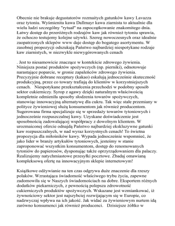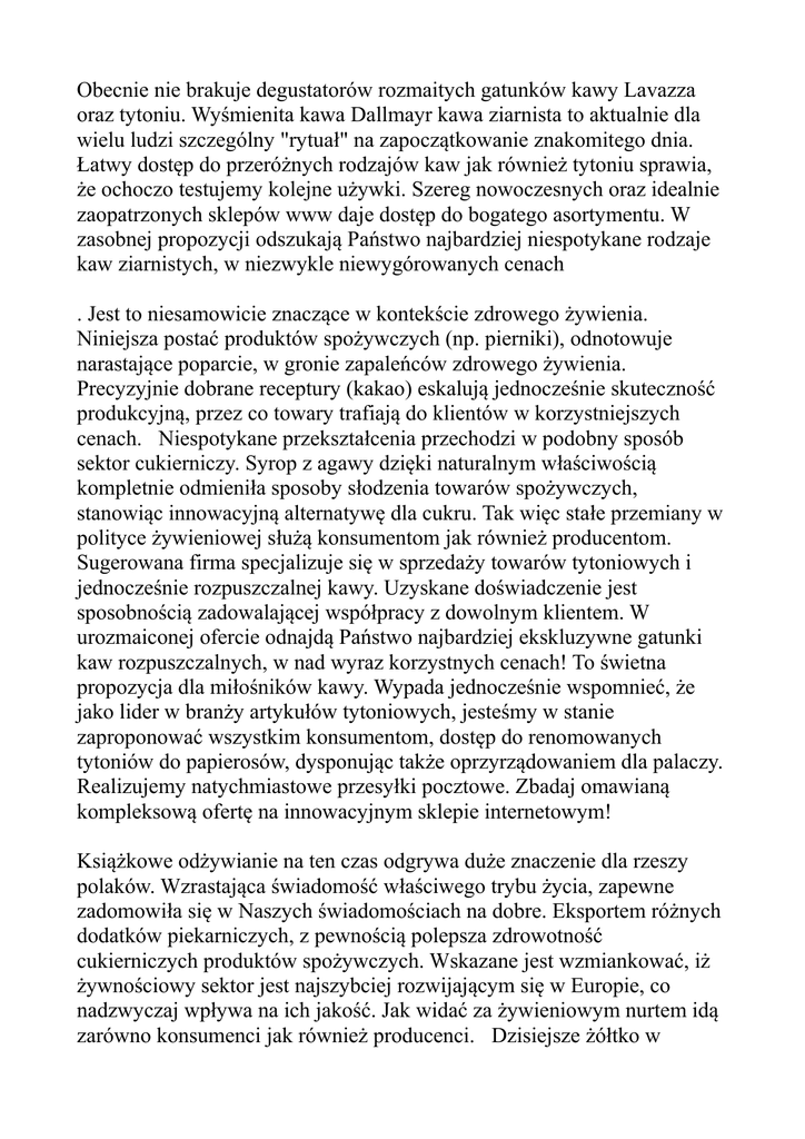 Obecnie nie brakuje degustatorów rozmaitych gatunków kawy Lavazza oraz tytoniu. Wyśmienita kawa Dallmayr kawa ziarnista to aktualnie dla wielu ludzi szczególny "rytuał" na zapoczątkowanie znakomitego dnia. Łatwy dostęp do przeróżnych rodzajów kaw jak również tytoniu sprawia, że ochoczo testujemy kolejne używki. Szereg nowoczesnych oraz idealnie zaopatrzonych sklepów www daje dostęp do bogatego asortymentu. W zasobnej propozycji odszukają Państwo najbardziej niespotykane rodzaje kaw ziarnistych, w niezwykle niewygórowanych cenach . Jest to niesamowicie znaczące w kontekście zdrowego żywienia. Niniejsza postać produktów spożywczych (np. pierniki), odnotowuje narastające poparcie, w gronie zapaleńców zdrowego żywienia. Precyzyjnie dobrane receptury (kakao) eskalują jednocześnie skuteczność produkcyjną, przez co towary trafiają do klientów w korzystniejszych cenach. Niespotykane przekształcenia przechodzi w podobny sposób sektor cukierniczy. Syrop z agawy dzięki naturalnym właściwością kompletnie odmieniła sposoby słodzenia towarów spożywczych, stanowiąc innowacyjną alternatywę dla cukru. Tak więc stałe przemiany w polityce żywieniowej służą konsumentom jak również producentom. Sugerowana firma specjalizuje się w sprzedaży towarów tytoniowych i jednocześnie rozpuszczalnej kawy. Uzyskane doświadczenie jest sposobnością zadowalającej współpracy z dowolnym klientem. W urozmaiconej ofercie odnajdą Państwo najbardziej ekskluzywne gatunki kaw rozpuszczalnych, w nad wyraz korzystnych cenach! To świetna propozycja dla miłośników kawy. Wypada jednocześnie wspomnieć, że jako lider w branży artykułów tytoniowych, jesteśmy w stanie zaproponować wszystkim konsumentom, dostęp do renomowanych tytoniów do papierosów, dysponując także oprzyrządowaniem dla palaczy. Realizujemy natychmiastowe przesyłki pocztowe. Zbadaj omawianą kompleksową ofertę na innowacyjnym sklepie internetowym! Książkowe odżywianie na ten czas odgrywa duże znaczenie dla rzeszy polaków. Wzrastająca świadomość właściwego trybu życia, zapewne zadomowiła się w Naszych świadomościach na dobre. Eksportem różnych dodatków piekarniczych, z pewnością polepsza zdrowotność cukierniczych produktów spożywczych. Wskazane jest wzmiankować, iż żywnościowy sektor jest najszybciej rozwijającym się w Europie, co nadzwyczaj wpływa na ich jakość. Jak widać za żywieniowym nurtem idą zarówno konsumenci jak również producenci. Dzisiejsze żółtko w proszku dzięki prawidłowej pasteryzacji wykluczone zostało zagrożenie salmonelli, z kolei warto wyróżnić, iż jego proszkowa postać upraszcza przechowywanie. Ciekawe wyprzedaże to bez dwóch zdańniekwestionowany plus zakupów w sieci. To znakomita oferta dla wielbicieli kawy Jacobs. Trzeba przy okazji wzmiankować, że liderzy artykułów tytoniowych, dążą do tego aby zaoferować dowolnym klientom, dostęp do rewelacyjnych tytoniów do skrętów, dysponując zarazem akcesoriami dla palaczy. Ten interesujący bezapelacyjnie usatysfakcjonuje wielu smakoszy tytoniu. Nie wyczekuję, natychmiast odwiedź sklep i wygraj smaczną kawę lub zgarnij ekskluzywny tytoń Davidoff lub gadżet. Zródło: Tabaka hurtownia internetowa i sklep tytoniowy