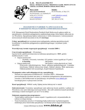 G.B. MANAGEMENT DZIAŁ DOSKONALENIA ŚREDNICH KADR MEDYCZNYCH GHEEK JAGDISH, BOBER-GHEEK BOGUMIŁA Biuro i szkoła adres do korespondencji: 50-230 Wrocław , ul. Trzebnicka 42 tel/fax (071) 78 36 911 e-mail: [email protected] REGON 930785811 Siedziba: 50-354 Wrocław, ul. Reja 2/51 e-mail: [email protected] www.ddskm.pl NIP 898-10-74-768 OGŁOSZENIE O NABORZE NA SPECJALIZACJĘ W DZIEDZINIE PIELĘGNIARSTWA EPIDEMIOLOGICZNEGO G.B. Management Dział Doskonalenia Średnich Kadr Medycznych ogłasza nabór na specjalizację w dziedzinie pielęgniarstwa epidemiologicznego, która będzie odbywała się we Wrocławiu. Specjalizacja będzie realizowana w trybie mieszanym z wykorzystaniem nowoczesnych metod nauczania m inn. E- learningu. Celem specjalizacji jest uzyskanie przez pielęgniarkę, połoŜną specjalistycznych kwalifikacji w dziedzinie pielęgniarstwa epidemiologicznego i uzyskanie tytułu specjalisty. Przewidywany termin rozpoczęcia specjalizacji: wrzesień 2009 r. Czas trwania specjalizacji: - 20 miesięcy. Łączna liczba godzin przeznaczona na realizację specjalizacji to 1015 godzin dydaktycznych, w tym: • Zajęcia teoretyczne: - Wykłady, ćwiczenia, warsztaty: 435 godzin ( osiem tygodni po 55 godz.) - E-learning 300 godzin • Zajęcia praktyczne 280 godzin ( osiem placówek po 5 dni) (Pracownia mikrobiologiczna, Stacja sanitarno-epidemiologiczna, Centralna sterylizacja, Oddział intensywnej terapii, Oddział zakaźny, Blok operacyjny, Oddział pediatrii lub neonatologii, Zespół ZakaŜeń Szpitalnych. Wymagania wobec osób ubiegających się o specjalizację. - ZłoŜenie do organizatora kształcenia do 1 września 2009 r.: dokumentu potwierdzającego dwuletni staŜ pracy w dziedzinie pielęgniarstwa lub połoŜnictwa, wniosku o zakwalifikowanie na specjalizację ( do pobrania www.ddskm.pl), kserokopii prawa wykonywania zawodu. Koszt specjalizacji: 4900zł/ osobę. Opłatę moŜna dokonywać w ratach. Zakwaterowanie: Uczestnicy specjalizacji sami pokrywaj koszty podróŜy i pobytu we Wrocławiu oraz sami dokonują rezerwacji hotelu - dla osób zainteresowanych prześlemy informację o tanich noclegach ( juŜ od 15 zł za dobę). ZałoŜenia organizacyjno programowe: - Teoria będzie realizowana w ośmiu sesjach 1 tygodniowych ( od poniedziałku do soboty) co drugi miesiąc. - Treści kształcenia zawarte w E-learningu będą realizowane wg harmonogramu ustalonego przez kierownika specjalizacji i na bieŜąco przez niego kontrolowane. więcej informacji na stronie www.ddskm.pl - Praktyka : w ośmiu placówkach po 5 dni x 7 godz. w dniach uzgodnionych z kierownikiem kursu. Praktyki będą realizowane we Wrocławiu. Dla zainteresowanych istnieje moŜliwość odbywania praktyk we własnym województwie. E-learning jest procesem dydaktycznym, w którym wykorzystuje się nośniki elektroniczne w tym Internet, taśmy audio/wideo oraz takie nośniki informacji jak np. CD, DVD. E-learning jest najczęściej kojarzony z nauczaniem, w którym stroną przekazującą wiedzę i egzaminującą jest komputer, dlatego przyjęło nazywać się tę formę nauki "distance learning" (uczenie na odległość), w którym brak fizycznego kontaktu z nauczycielem. Oczywiście naszym celem nie jest całkowite zastąpienie tradycyjnego nauczania metodą e-learningu – jest to system wspomagający, dzięki któremu cały proces kształcenia moŜna uczynić bardziej efektywnym i elastycznym. Wielką zaletą włączenia e-learningu do realizacji programu specjalizacji jest moŜliwość realizacji części treści kształcenia bez konieczności fizycznej obecności pielęgniarek i połoŜnych w sali wykładowej. Niekwestionowanym atutem takiego rozwiązania dla pielęgniarek i połoŜnych jest: - eliminacja kosztów związanych między innymi z transportem, zakwaterowaniem, wyŜywieniem - oszczędność czasu – uczestnicy specjalizacji szkolą się w czasie, który jest dla nich najwygodniejszy, nie tracą czasu na dojazdy, nie muszą odrywać się od swoich codziennych obowiązków, - uczestnicy kursu zawsze w dogodnym dla siebie czasie, w dowolnej porze i z dowolnego miejsca mogą powrócić do informacji zawartych w szkoleniach oraz zweryfikować posiadane wiadomości Do korzystania ze szkoleń e-learningowych uczestnicy specjalizacji będą potrzebowali komputera z przeglądarką internetową ( np. Internet Explorer). więcej informacji na stronie www.ddskm.pl