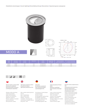 Oświetlenie akcentujące Accent lighting Akzentbeleuchtung Decoratives Aрхитектурное освещение MODO A 70W MODO A 165° 150° A B C 180° 165° 150° 135° 135° 120° 120° 105° 105° 90° 90° 75° 45° cd/klm CO - C180 0° 45° 75° C9O - C270 index index max moc max power trzonek end cap EVG/VVG wersja version waga netto net weight wymiary produktu product dimensions A/B wymiary montażowe installation dimensions 885129 1x35W G12 VVG ASYMMETRIC 4,28 220/290 200 885136 1x70W G12 VVG ASYMMETRIC 4,76 220/290 200 1 Wysoki stopień szczelności IP67 Asymetryczny odbłyśnik Duża wytrzymałość mechaniczna IK10 (oprawa najazdowa) High ingress protection ( IP 67 ) Assymetrical reflector High impact protection ( IK 10 ) Hohe IP 67 Der Reflektor asymetrisch Hohe mechanische Widerstandsfaehigkeit IK10 Indice de protection IP élevé (IP67) Réflecteur asymétrique Haute résistance mécanique IK10 Obudowa: odlew aluminiowy malowany proszkowo Szyba: szkło hartowane Pierścień: stal nierdzewna Odbłyśnik: aluminium Montaż: w podłożu, w zestawie puszka montażowa Kolor pierścienia: srebrny Body : powder coated aluminium die cast Glass : hardened glas Ring : stainless steel Reflector : aluminium Installation : into the ground, mounting box included in the set Ring colour : silver Das Gehaeuse: Aluminiumguss, pulverbeschichtet Das Glas: Hartglas Der Montagering: rostfreier Stahl Der Reflektor: Aluminium Die Montage: Bodenmontage, Montagebuchse im Set Die Montageringfarbe: silber Corps: en fonte d’aluminium laqué blanc par poudre Vitre: verre trempé Anneau en acier inoxydable Réflecteur: aluminium Montage: intégré au sol, la boîte de montage inclus Couleur d’anneau: argent Высокая степень герметичности IP67 Асимметрический отражатель Высокая механическая прочность IK10 (светильник встраиваемый в грунт) Корпус: алюминиевая отливка, покрыта порошковой краской Источник света защищен закаленным стеклом Кольцо: нержавеющая сталь Отражатель: алюминий Монтаж: светильник встраиваемый в грунт, в комплекте монтажная коробка Цвет кольца: серебряный