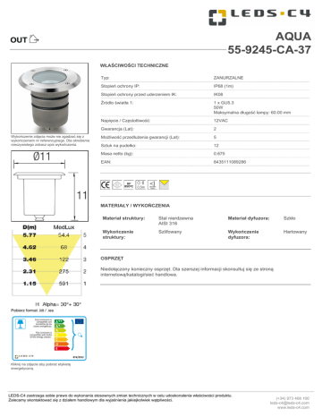 AQUA 55-9245-CA-37 OUT WŁAŚCIWOŚCI TECHNICZNE Wykończenie zdjęcia może nie zgadzać się z wykończeniem nr referencyjnego. Dla określenia rzeczywistego zobacz opis wykończenia. Typ: ZANURZALNE Stopień ochrony IP: IP68 (1m) Stopień ochrony przed uderzeniem IK: IK08 Źródło światła 1: 1 x GU5.3 50W Maksymalna długość lampy: 60.00 mm Napięcie / Częstotliwość: 12VAC Gwarancja (Lat): 2 Możliwość przedłużenia gwarancji (Lat): 5 Sztuk na pudełko: 12 Masa netto (kg): 0.675 EAN: 8435111089286 MATERIAŁY / WYKOŃCZENIA Materiał struktury: Stal nierdzewna AISI 316 Materiał dyfuzora: Szkło Wykończenie struktury: Szlifowany Wykończenie dyfuzora: Hartowany OSPRZĘT Niedołączony konieczny osprzęt. Dla szerszej informacji skonsultuj się ze stroną internetową/katalogi/sieć handlowa. Pobierz format .ldt / .ies Kliknij na zdjęcie aby pobrać etykietę energetyczną. LEDS-C4 zastrzega sobie prawo do wykonania stosownych zmian technicznych w celu udoskonalenia właściwości produktu. Zalecamy skontaktować się z działem handlowym dla wyjaśnienia jakiejkolwiek wątpliwości. (+34) 973 468 100 [email protected] www.leds-c4.com DOSTĘPNE AKCESORIA OPCJONALNE 71-9197-05-05 IP68 (1m) LEDS-C4 zastrzega sobie prawo do wykonania stosownych zmian technicznych w celu udoskonalenia właściwości produktu. Zalecamy skontaktować się z działem handlowym dla wyjaśnienia jakiejkolwiek wątpliwości. (+34) 973 468 100 [email protected] www.leds-c4.com Luminaire Code 55-9245-Y4 Name AQUA Line Eulumdat Measurem. Code 44870V.WFL/p95/791 Name AQUA Date 29-04-1994 Lamp Code Number Position QR-CB 50W 60D 1 Efficiency 99.98% Coordinate system CG Total Flux Maximum value 1429.78 cd Position C=0.00 G=0.00 Rotosymmetrical 110 mm 50 mm Width Width Rectangular Luminaire Rectangular Luminous Area Length Length Horizontal Luminous Area Emitting area on Plane 0° Emitting area on Plane 90° 0.002500 m2 0.000000 m2 0.000000 m2 Emitting area on Plane 180° Emitting area on Plane 270° Glare area at 76° 0.000000 m2 0.000000 m2 0.000605 m2 Symmetry Type Measurement Distance Rotosymmetrical 0.00 Maximum Gamma Angle Measurement Flux 180 1474.00 lm Operator Temperature Humidity Notes 25.00 °C 60.00 % Source voltage Source current Photocell Line Eulumdat Code QR-CB 50W 60D C.I.E. F UTE 110 mm 50 mm Height Height 1474.00 lm Luminaire Lamps Name QR-CB 50W 60D - 50.00 W 81 94 97 100 100 1.00 B D DIN 5040 B NBN 99 mm 0 mm Flux [lm] 1474.00 Pow. [W] Q.ty 50.00 1 A60 BZ 1 / 4 / BZ 2 110mm x 110mm Gamma Angles 180° 120° 0 400 105° 180 105° 90° 90° C Halfplanes 180.0 0.0 400 75° 75° 800 60° 60° 1200 ULOR 0.00 % DLOR 99.97 % RN 0.00 % 45° 45° 1600 cd 2000 30° LITESTAR (c)OxyTech Srl www.oxytech.it 15° 0° 15° 30° Page 1