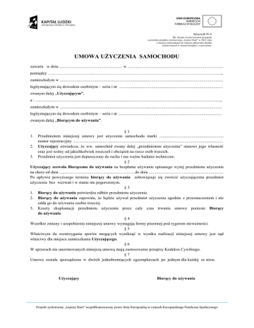 Załącznik Nr 6 do Zasady zwrotu kosztów przejazdu uczestnika projektu systemowego „Lepszy Start” w 2011 roku z miejsca zamieszkania do miejsca odbywania działań realizowanych w ramach projektu i z powrotem. UMOWA UŻYCZENIA SAMOCHODU zawarta w dniu ........................................................... w .......................................................................................... pomiędzy …………………………...……………………………………………………………………………...., zamieszkałym w ......................................................................................................................................................... legitymującym się dowodem osobistym – seria i nr ................................................................................................. zwanym dalej „Użyczającym”, a : .............................................................................................................................................................................., zamieszkałym w ........................................................................................................................................................ legitymującym się dowodem osobistym – seria i nr ................................................................................................. zwanym dalej „Biorącym do używania”. §1 Przedmiotem niniejszej umowy jest użyczenie samochodu marki ............................................................ numer rejestracyjny ............................................................................................................................................. 2. Użyczający oświadcza, że ww. samochód zwany dalej „przedmiotem użyczenia” stanowi jego własność oraz jest wolny od jakichkolwiek roszczeń i obciążeń na rzecz osób trzecich. 3. Przedmiot użyczenia jest dopuszczony do ruchu i ma ważne badanie techniczne. §2 Użyczający zezwala Biorącemu do używania na bezpłatne używanie opisanego wyżej przedmiotu użyczenia na okres od dnia ...................................................................... do dnia ...................................................................... Po upływie powyższego terminu biorący do używania zobowiązuje się zwrócić użyczającemu przedmiot użyczenia bez wezwań i w stanie nie pogorszonym. §3 1. Biorący do używania potwierdza odbiór przedmiotu użyczenia. 2. Biorący do używania zapewnia, że będzie używał przedmiot użyczenia zgodnie z przeznaczeniem i nie odda go do używania osobie trzeciej. 3. Koszty eksploatacji przedmiotu użyczenia przez cały czas trwania umowy poniesie Biorący do używania. §4 Wszelkie zmiany i uzupełnienia niniejszej umowy wymagają formy pisemnej pod rygorem nieważności. §5 Właściwym do rozstrzygania sporów mogących wyniknąć w wyniku realizacji niniejszej umowy jest sąd właściwy dla miejsca zamieszkania Użyczającego. §6 W sprawach nie unormowanych niniejszą umową mają zastosowanie przepisy Kodeksu Cywilnego. §7 Umowa została sporządzona w dwóch jednobrzmiących egzemplarzach po jednym dla każdej ze stron. 1. Użyczający Biorący do używania Projekt systemowy „Lepszy Start” współfinansowany przez Unię Europejską w ramach Europejskiego Funduszu Społecznego
