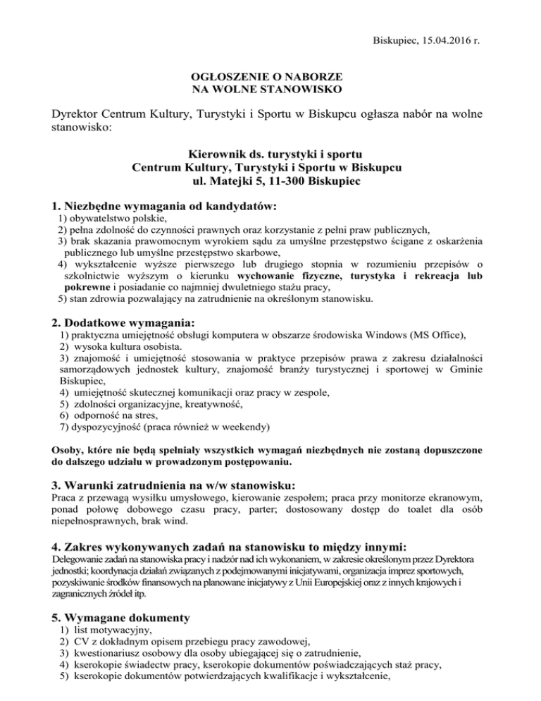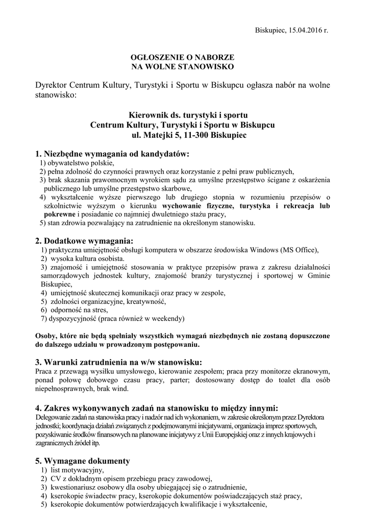 Biskupiec, 15.04.2016 r. OGŁOSZENIE O NABORZE NA WOLNE STANOWISKO Dyrektor Centrum Kultury, Turystyki i Sportu w Biskupcu ogłasza nabór na wolne stanowisko: Kierownik ds. turystyki i sportu Centrum Kultury, Turystyki i Sportu w Biskupcu ul. Matejki 5, 11-300 Biskupiec 1. Niezbędne wymagania od kandydatów: 1) obywatelstwo polskie, 2) pełna zdolność do czynności prawnych oraz korzystanie z pełni praw publicznych, 3) brak skazania prawomocnym wyrokiem sądu za umyślne przestępstwo ścigane z oskarżenia publicznego lub umyślne przestępstwo skarbowe, 4) wykształcenie wyższe pierwszego lub drugiego stopnia w rozumieniu przepisów o szkolnictwie wyższym o kierunku wychowanie fizyczne, turystyka i rekreacja lub pokrewne i posiadanie co najmniej dwuletniego stażu pracy, 5) stan zdrowia pozwalający na zatrudnienie na określonym stanowisku. 2. Dodatkowe wymagania: 1) praktyczna umiejętność obsługi komputera w obszarze środowiska Windows (MS Office), 2) wysoka kultura osobista. 3) znajomość i umiejętność stosowania w praktyce przepisów prawa z zakresu działalności samorządowych jednostek kultury, znajomość branży turystycznej i sportowej w Gminie Biskupiec, 4) umiejętność skutecznej komunikacji oraz pracy w zespole, 5) zdolności organizacyjne, kreatywność, 6) odporność na stres, 7) dyspozycyjność (praca również w weekendy) Osoby, które nie będą spełniały wszystkich wymagań niezbędnych nie zostaną dopuszczone do dalszego udziału w prowadzonym postępowaniu. 3. Warunki zatrudnienia na w/w stanowisku: Praca z przewagą wysiłku umysłowego, kierowanie zespołem; praca przy monitorze ekranowym, ponad połowę dobowego czasu pracy, parter; dostosowany dostęp do toalet dla osób niepełnosprawnych, brak wind. 4. Zakres wykonywanych zadań na stanowisku to między innymi: Delegowanie zadań na stanowiska pracy i nadzór nad ich wykonaniem, w zakresie określonym przez Dyrektora jednostki; koordynacja działań związanych z podejmowanymi inicjatywami, organizacja imprez sportowych, pozyskiwanie środków finansowych na planowane inicjatywy z Unii Europejskiej oraz z innych krajowych i zagranicznych źródeł itp. 5. Wymagane dokumenty 1) 2) 3) 4) 5) list motywacyjny, CV z dokładnym opisem przebiegu pracy zawodowej, kwestionariusz osobowy dla osoby ubiegającej się o zatrudnienie, kserokopie świadectw pracy, kserokopie dokumentów poświadczających staż pracy, kserokopie dokumentów potwierdzających kwalifikacje i wykształcenie, 6) inne dokumenty o posiadanych kwalifikacjach i umiejętnościach, 7) potwierdzone własnoręcznym podpisem oświadczenie kandydata o posiadaniu pełnej zdolności do czynności prawnych i o korzystaniu z pełni praw publicznych, 8) potwierdzone własnoręcznym podpisem oświadczenie, że kandydat nie był skazany prawomocnym wyrokiem sądu za umyślne przestępstwo skarbowe, 9) potwierdzone własnoręcznym podpisem oświadczenie, że kandydat nie był skazany prawomocnym wyrokiem sądu za umyślne przestępstwo ścigane z oskarżenia publicznego, 10) potwierdzone własnoręcznym podpisem oświadczenie, że kandydat posiada stan zdrowia pozwalający na zatrudnienie na stanowisku Kierownika ds. turystyki i sportu, 11) inne dokumenty potwierdzające spełnienie wymagań niezbędnych podanych w ogłoszeniu, a w razie braku takich dokumentów, stosowne oświadczenia o ich spełnieniu. UWAGA : Wszystkie powyższe dokumenty powinny zostać opatrzone własnoręcznym podpisem kandydata. Informacja dodatkowa: Osoba wybrana w postępowaniu konkursowym na w/w stanowisko zobowiązana będzie do przedstawienia zaświadczenia o niekaralności wydanego przez Krajowy Rejestr Karny. Dokumenty aplikacyjne powinny być opatrzone klauzulą : "Wyrażam zgodę na przetwarzanie moich danych osobowych zawartych w ofercie pracy dla potrzeb niezbędnych do realizacji procesu rekrutacji zgodnie z ustawą z dnia 29 sierpnia 1997 r. o ochronie danych osobowych„ z własnoręcznym czytelnym podpisem. 6. Miejsce i termin złożenia dokumentów: Wymagane dokumenty aplikacyjne należy składać w zaklejonych kopertach w Centrum Kultury, Turystyki i Sportu, ul. Matejki 5, 11-300 Biskupiec lub przesłać pocztą do dnia 22 kwietnia 2016 r. do godz. 15.00. Koperty winny być zaadresowane: Centrum Kultury, Turystyki i Sportu, ul. Matejki 5, 11-300 Biskupiec z dopiskiem: "dotyczy naboru na stanowisko – Kierownik ds. turystyki i sportu”. Informacje dodatkowe: 1. Wszelkich informacji w sprawie zatrudnienia udziela Pan Ryszard Sobolewski, tel. 089 715 2695. 2. Oferty, które wpłyną po wyżej określonym terminie nie będą rozpatrywane, 3. Złożone oferty będą badane pod względem kompletności i spełnienia wymagań niezbędnych dla kandydata. 4. Kandydaci o terminie rozmowy kwalifikacyjnej zostaną poinformowani telefonicznie, dlatego też uprasza się o podanie bezpośredniego numeru telefonu do kandydata.