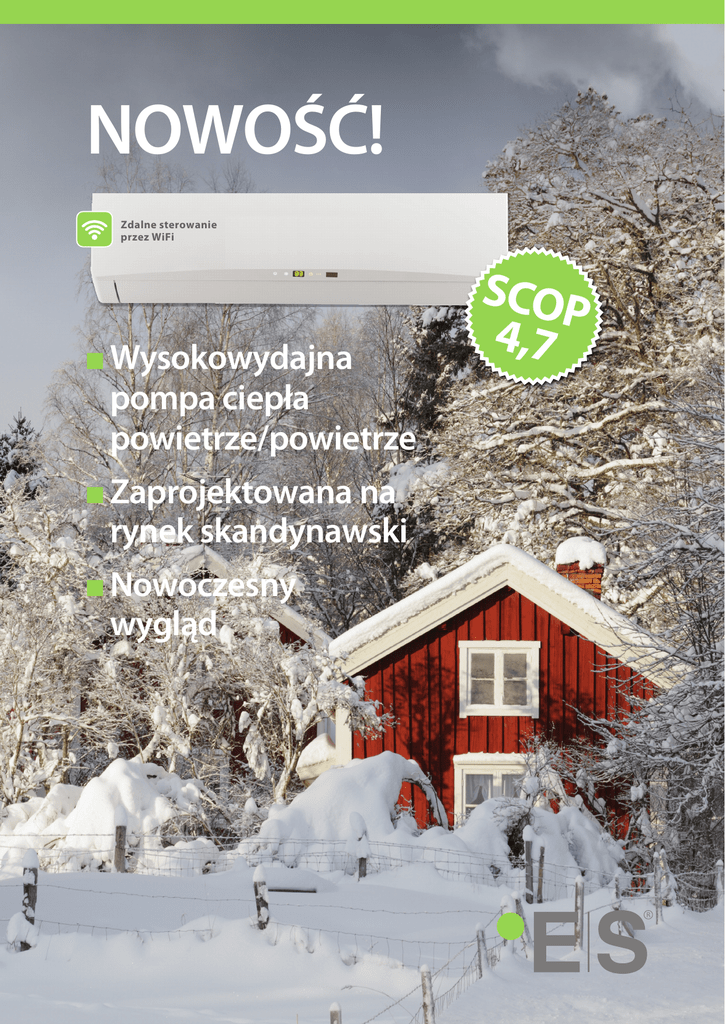 NOWOŚĆ! Zdalne sterowanie przez WiFi n Wysokowydajna pompa ciepła powietrze/powietrze n Zaprojektowana na rynek skandynawski n Nowoczesny wygląd SCOP 4,7 ES Pompa ciepła powietrze/powietrze AA 5,5 Performance Zdalne sterowanie przez WiFi AA 5,5 Performance dostarcza ciepło bardzo wydajnie przez co zapewnia znaczne oszczędności w ogrzewaniu. AA 5,5 Performance jest wyposażona w sprężarkę o zmiennej wydajności, dzięki czemu dostarcza dokładnie tyle ciepła ile jest potrzebne. DANE TECHNICZNE AA 5,5 PERFORMANCE AA 5,5 Performance ma sprężarkę o zmiennej wydajności, która reguluje ilość dostarczanego ciepła. Rozmrażanie odbywa się automatycznie według zapotrzebowania. Zapewnia to maksymalną wydajność i oszczędność. Wydajność cieplna max 5500 W Wydajność chłodnicza max 4000 W SCOP 4,7 (A) / 3,7 (C) Klasa energetyczna A++ (Umiarkowany) Zdalne sterowanie ogrzewaniem Moc napędowa przy ogrzewaniu min 120/ max 1400 W Pompa ciepła jest wyposażony w funkcję utrzymania ciepła. Pozwala to utrzymać stałą temperaturę oraz niską ”antyzamrożeniową” (min. + 8 ° C), np w twoim domku letniskowym w okresach, gdy nie jest on zamieszkany. Funkcja Wi-Fi zapewnia zdalne sterowanie poprzez smartfon lub tablet. Moc napędowa przy chłodzeniu min 120/ max 1400 W Zakres pracy - ogrzewanie -20° C - +24° C Max przepływ powietrza – jedn. wew. m /h 750 Wysoka efektywność Max przepływ powietrza – jedn. zew. m3/h 2400 Rozmrażanie według zapotrzebowania Tak Przewód grzejny tacy ociekowej Tak Podgrzewanie spreżarki Tak Elektroniczny zawór rozprężny Tak SCOP czyli efektywność sezonowa należy do najwyższej klasy. SCOP pomaga klientowi porównać pompy ciepła według ich efektywności. Kraje skandynawskie należą do zimnego klimatu (zimny / C), z wyjątkiem Danii, która zaliczana jest do klimatu umiarkowanego (umiarkowany / A). Efektywność sezonowa daje obraz wydajności pompy ciepła. AA 5,5 Performance ma SCOP A - 4,7 oraz SCOP C - 3,7. Tak wysoka wydajność daje krótki okres zwrotu inwestycji. Najlepsza w teście pomp ciep W teście w ła Norwegii p rz eprowadzo Konsumen nym przez tverket oce niającym p urządzenie ompy ciepła AA 5,5 Perfo , rm ance zwycię wszystkich żyła we testach! -15° C - +47° C Zakres pracy - chłodzenie 3 Kompresor Inverter Głośność (EN12102 ) jedn. wew. 55 dB(A) Głośność (EN12102 ) jedn. zewn. 63 dB(A) Ciśnienie akustyczne jedn. wew. (min-max) 26-43 dB(A) Ciśnienie akustyczne jedn. zew. 54 dB(A) Waga jednostki wewnętrznej 11 kg Waga jednostki zewnętrznej 43 kg Rury chłodnicze ½ oraz ¼ Czynnik chłodniczy R410A, 1,3 kg Wymiary jedn. wewnętrznej Sz x Wys x Gł 866 x 292 x 209 mm Wymiary jedn. zewnętrznej Sz x Wys x Gł 899 x 596 x 378 mm Zasilanie elektryczne 230 Volt, 50 Hz Zabezpieczenie prądowe 10A Wymagane zabezpieczenie różnicowo-prądowe Gaz chłodniczy ma GWP powyżej 150 Dystrybutor w Polsce: Tel: 58 5564888 • [email protected] • www.PowerOfGreen.eu Producent: Energy Save Nordic AB • Kristineholmsvägen 26B • SE-441 39 Alingsås, Sweden ES jan 2016 Zaawansowana automatyka