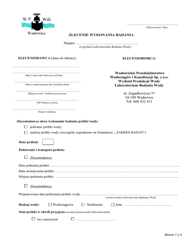 Zlecenie Wadowice - Wadowickie Przedsiębiorstwo Wodociągów i