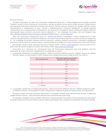 Open Life TU Życie S.A. ul. Przyokopowa 33 01-208 Warszawa infolinia 801 222 333 [email protected] www.openlife.pl Warszawa, 3 lutego 2016 r. Szanowni Państwo, uprzejmie informujemy, że Open Life Towarzystwo Ubezpieczeń Życie S.A., w toku postępowania toczącego się przed Prezesem Urzędu Ochrony Konkurencji i Konsumentów, kierując się dobrem Konsumentów złożyło wniosek o wydanie decyzji zobowiązującej dotyczącej podwyższenia stawek procentowych wartości rachunku służących do ustalania Wartości wykupu obowiązujących w ubezpieczeniu na życie i dożycie z ubezpieczeniowym funduszem kapitałowym ze składką regularną i jednorazową, tak w ubezpieczeniach indywidualnych, jak i grupowych. Szczegółowy wykaz ubezpieczeń objętych zakresem zobowiązania (wykaz wzorców umownych) stanowi Załącznik nr 1 do niniejszego komunikatu, który jest dostępny tutaj: http://openlife.pl/fileadmin/dokumenty/biuro-prasowe/20160201/Zal_nr_1_komunikatu.pdf. Open Life Towarzystwo Ubezpieczeń Życie S.A. zaproponuje Klientom posiadającym umowy ubezpieczenia na życie i dożycie z ubezpieczeniowym funduszem kapitałowym, do których zastosowanie mają wzorce umów wymienione w Załączniku nr 1 do niniejszego komunikatu (wykazie wzorców umownych), zawarcie aneksów (porozumień w przypadku ubezpieczeń grupowych, jeśli nie doszło do zawarcia aneksu z Ubezpieczającym) zmieniających umowy ubezpieczenia na korzyść Klientów. Zobowiązanie Spółki zostało zaakceptowane przez Prezesa UOKiK w decyzji nr RKT-20/2015 z dnia 30 grudnia 2015 r. (pełna treść decyzji jest dostępna na stronie internetowej UOKiK: http://uokik.gov.pl/decyzje). Informujemy, że w wykonaniu ww. zobowiązania Open Life Towarzystwo Ubezpieczeń Życie S.A. podejmie czynności zmierzające do zmiany stosunków ubezpieczenia wg następujących zasad: a) w przypadku ubezpieczeń ze składką regularną – Stawki procentowe Wartości rachunku udziałów służące do ustalania Wartości wykupu w poszczególnych latach ubezpieczenia zostają podwyższone i będą wynosiły nie mniej niż: Rok ubezpieczenia Minimalna Stawka procentowa Wartości rachunku udziałów 1 75% 2 76% 3 79% 4 82% 5 85% 6 88% 7 91% 8 93% 9 95% 10 97% 11 i następne 100% b) w przypadku ubezpieczeń ze składką jednorazową – Stawki procentowe Wartości rachunku udziałów służące do ustalania Wartości wykupu w poszczególnych latach ubezpieczenia zostają podwyższone i będą wynosiły nie mniej niż 95%. Powyższe zasady stosować się będzie odpowiednio w przypadku złożenia przez Uprawnionego wniosku o częściową wypłatę Wartości wykupu – jeśli konstrukcja ubezpieczenia przewiduje taką dyspozycję. W przypadku wystąpienia różnic pomiędzy zmienionymi a dotychczasowymi warunkami Umowy ubezpieczenia dotyczącymi wysokości stawek procentowych Wartości wykupu zastosowanie będzie miało rozwiązanie korzystniejsze dla Ubezpieczającego. Open Life Towarzystwo Ubezpieczeń Życie Spółka Akcyjna z siedzibą w Warszawie przy ul. Przyokopowej 33, 01-208 Warszawa, zarejestrowana w Sądzie Rejonowym dla m.st. Warszawy, XII Wydział Gospodarczy Krajowego Rejestru Sądowego pod numerem KRS 0000292551, posiadająca numer REGON 141186640 i numer NIP 107-00-08-220, kapitał zakładowy zarejestrowany i w całości wpłacony wynosi 95 500 000 zł. Open Life TU Życie S.A. ul. Przyokopowa 33 01-208 Warszawa infolinia 801 222 333 [email protected] www.openlife.pl Uprzejmie informujemy, że w przypadku indywidualnych umów ubezpieczenia, zawartych w oparciu o wzorce wskazane Załączniku nr 1, Open Life Towarzystwo Ubezpieczeń Życie S.A. wyśle każdemu z Klientów listem poleconym pisemną ofertę zawarcia aneksu zmieniającego odpowiednio postanowienia zawartej z nim Umowy ubezpieczenia wraz z pismem przewodnim. W przypadku umów ubezpieczenia grupowego zawartych w oparciu o wzorce wskazane Załączniku nr 1, zmiany zostaną wprowadzone w drodze aneksu zawartego pomiędzy Open Life Towarzystwo Ubezpieczeń Życie S.A. a Ubezpieczającymi. Gdyby nie udało się doprowadzić do zawarcia aneksu w terminie wynikającym z ww. decyzji Prezesa UOKiK, albo gdyby nie doszło do zawarcia z Ubezpieczającym aneksu do umowy ubezpieczenia grupowego w terminie poprzedzającym złożenie przez Ubezpieczonego dyspozycji całkowitej albo częściowej wypłaty Wartości wykupu ubezpieczenia, Open Life Towarzystwo Ubezpieczeń Życie S.A. będzie oferowało poszczególnym Ubezpieczonym porozumienia modyfikujące treść stosunku ubezpieczenia. Pragniemy wskazać, że aneks i porozumienie nie stanowią ugody w rozumieniu Kodeksu cywilnego, a podpisanie przez Państwa aneksu ani porozumienia nie zamyka Państwu drogi do dochodzenia swoich prawnie chronionych interesów na drodze cywilnej, w tym w szczególności dotyczących wartości wykupu. W przypadku pytań prosimy o kontakt z naszą infolinią pod numerem telefonu 801 222 333 lub +48 22 101 41 60. Open Life Towarzystwo Ubezpieczeń Życie Spółka Akcyjna z siedzibą w Warszawie przy ul. Przyokopowej 33, 01-208 Warszawa, zarejestrowana w Sądzie Rejonowym dla m.st. Warszawy, XII Wydział Gospodarczy Krajowego Rejestru Sądowego pod numerem KRS 0000292551, posiadająca numer REGON 141186640 i numer NIP 107-00-08-220, kapitał zakładowy zarejestrowany i w całości wpłacony wynosi 95 500 000 zł.