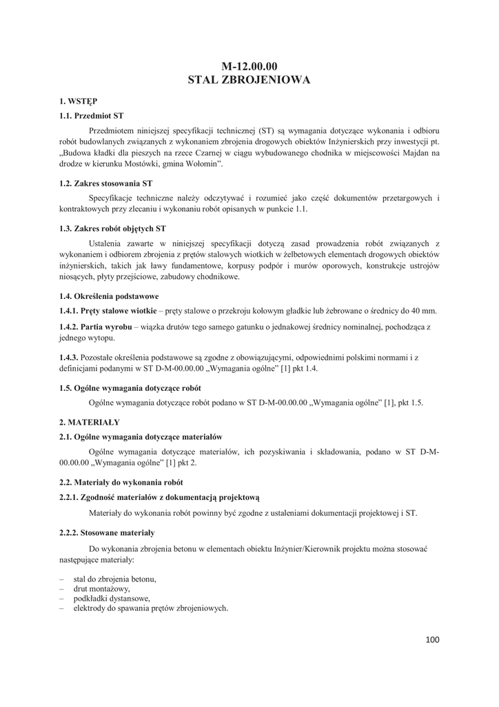 M-12.00.00 STAL ZBROJENIOWA 1. WSTĘP 1.1. Przedmiot ST Przedmiotem niniejszej specyfikacji technicznej (ST) są wymagania dotyczące wykonania i odbioru robót budowlanych związanych z wykonaniem zbrojenia drogowych obiektów Inżynierskich przy inwestycji pt. „Budowa kładki dla pieszych na rzece Czarnej w ciągu wybudowanego chodnika w miejscowości Majdan na drodze w kierunku Mostówki, gmina Wołomin”. 1.2. Zakres stosowania ST Specyfikacje techniczne należy odczytywać i rozumieć jako część dokumentów przetargowych i kontraktowych przy zlecaniu i wykonaniu robót opisanych w punkcie 1.1. 1.3. Zakres robót objętych ST Ustalenia zawarte w niniejszej specyfikacji dotyczą zasad prowadzenia robót związanych z wykonaniem i odbiorem zbrojenia z prętów stalowych wiotkich w żelbetowych elementach drogowych obiektów inżynierskich, takich jak ławy fundamentowe, korpusy podpór i murów oporowych, konstrukcje ustrojów niosących, płyty przejściowe, zabudowy chodnikowe. 1.4. Określenia podstawowe 1.4.1. Pręty stalowe wiotkie – pręty stalowe o przekroju kołowym gładkie lub żebrowane o średnicy do 40 mm. 1.4.2. Partia wyrobu – wiązka drutów tego samego gatunku o jednakowej średnicy nominalnej, pochodząca z jednego wytopu. 1.4.3. Pozostałe określenia podstawowe są zgodne z obowiązującymi, odpowiednimi polskimi normami i z definicjami podanymi w ST D-M-00.00.00 „Wymagania ogólne” [1] pkt 1.4. 1.5. Ogólne wymagania dotyczące robót Ogólne wymagania dotyczące robót podano w ST D-M-00.00.00 „Wymagania ogólne” [1], pkt 1.5. 2. MATERIAŁY 2.1. Ogólne wymagania dotyczące materiałów Ogólne wymagania dotyczące materiałów, ich pozyskiwania i składowania, podano w ST D-M00.00.00 „Wymagania ogólne” [1] pkt 2. 2.2. Materiały do wykonania robót 2.2.1. Zgodność materiałów z dokumentacją projektową Materiały do wykonania robót powinny być zgodne z ustaleniami dokumentacji projektowej i ST. 2.2.2. Stosowane materiały Do wykonania zbrojenia betonu w elementach obiektu Inżynier/Kierownik projektu można stosować następujące materiały: – – – – stal do zbrojenia betonu, drut montażowy, podkładki dystansowe, elektrody do spawania prętów zbrojeniowych. 100 2.2.3. Stal do zbrojenia betonu Do zbrojenia betonu należy stosować stal klas: A-I, A-II, A-III i A-IIIN oraz gatunków zgodnych z dokumentacją projektową oraz ST. Pręty stalowe do zbrojenia betonu winny być zgodne z wymaganiami PN91/S-10042 [2], PN-89/H-84023.06 [3], PN-82/H-93215 [4]. W technologicznej próbie zginania powierzchnia próbek nie powinna wykazywać pęknięć, naderwań i rozwarstwień. Stal zbrojeniowa dostarczana na budowę powinna mieć certyfikat zgodności z ww. Polskimi Normami. W przypadku stosowania stali niezgodnej z PN musi ona posiadać aprobatę techniczną, potwierdzającą możliwość zastosowania prętów do zbrojenia betonu w obiektach mostowych oraz deklarację zgodności. Nowe gatunki stali mogą być stosowane pod warunkiem uzyskania aprobaty technicznej wydanej przez upoważnioną jednostkę naukowo-badawczą (np. IBDiM), na podstawie wyników badań wykonanych zgodnie z wymaganiami odpowiednich norm. Zastosowanie stali innych gatunków lub średnic, niż określono w dokumentacji projektowej, wymaga zgody Inżyniera/Kierownika projektu oraz Projektanta. 2.2.4. Zaświadczenie o jakości 2.2.4.1. Atest Do każdej partii walcówki lub prętów wytwórca jest obowiązany dołączyć zaświadczenie o jakości atest, stwierdzające zgodność wyrobu z wymaganiami normy lub aprobaty technicznej. W ateście należy podać: a) nazwę wytwórcy, b) oznaczenie wyrobu wg PN-82/H-93215 [4], c) numer wytopu lub numer partii, d) wszystkie wyniki przeprowadzonych badań oraz skład chemiczny wg analizy wytopowej, e) masę partii, f) rodzaj obróbki cieplnej (w przypadku dostawy prętów obrabianych cieplnie). W oznaczeniu należy podać: – nazwę wyrobu, – średnicę wyrobu, – długość prętów, – znak stali, – znak obróbki cieplnej, – numer normy, wg której pręty zostały wyprodukowane. 2.2.4.2. Cechowanie Na przewieszkach metalowych przymocowanych co najmniej po dwie do każdej wiązki prętów, kręgów lub kręgu, należy podać w sposób trwały: a) znak wytwórcy, b) średnicę nominalną, c) znak stali, d) numer wytopu lub numer partii, e) znak obróbki cieplnej (w przypadku prętów obrabianych cieplnie). Ponadto każdą wiązkę prętów i walcówki należy cechować trwałą czerwoną farbą olejną przez malowanie końców prętów od czoła z jednej strony każdej wiązki, natomiast na każdym kręgu walcówki - pasa o szerokości co najmniej 20 mm. Nie ma konieczności badania stali zbrojeniowej spełniającej wymagania PN-91/S-10042 [2] (z potwierdzeniem certyfikatem zgodności) lub posiadającej aprobatę techniczną (z potwierdzeniem deklaracją zgodności). Dostarczoną na budowę stal, która: – nie ma deklaracji (certyfikatu) zgodności z Polską Normą lub aprobatą techniczną, – oględziny zewnętrzne nasuwają wątpliwości co do jej własności, – pęka przy wykonywaniu haków,należy odrzucić. 2.2.5. Wady powierzchniowe 101 Powierzchnia walcówki i prętów powinna być bez pęknięć, pęcherzy i naderwań. Na powierzchni czołowej prętów niedopuszczalne są pozostałości jamy usadowej, rozwarstwienia i pęknięcia widoczne nieuzbrojonym okiem. Wady powierzchniowe jak rysy, drobne łuski i zawalcowania, wtrącenia niemetaliczne, wżery, wypukłości, wgniecenia, zgorzeliny i chropowatości są dopuszczalne: – jeśli mieszczą się w granicach dopuszczalnych odchyłek średnicy dla walcówki i prętów gładkich wg PN82/H-93215 [4], – jeśli nie przekraczają 0,5 mm, licząc od średnicy rdzenia dla walcówki i prętów żebrowanych o średnicy nominalnej do 25 mm, zaś 0,7 mm dla prętów o większych średnicach. 2.2.6. Wymiary i masy Wymiary przekroju poprzecznego, jak średnice no